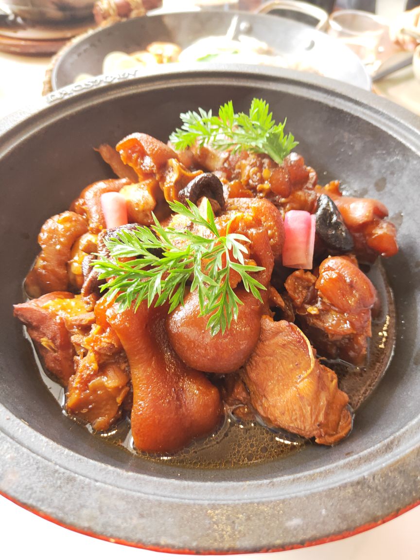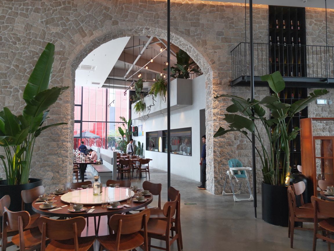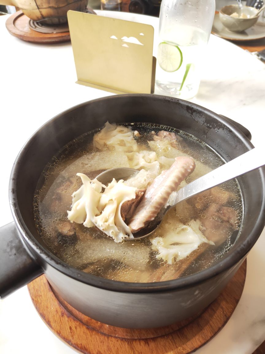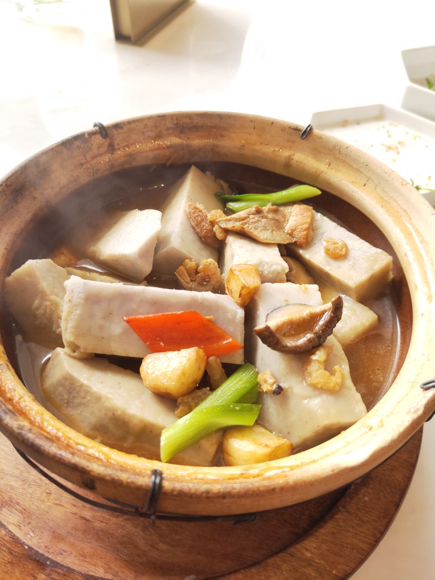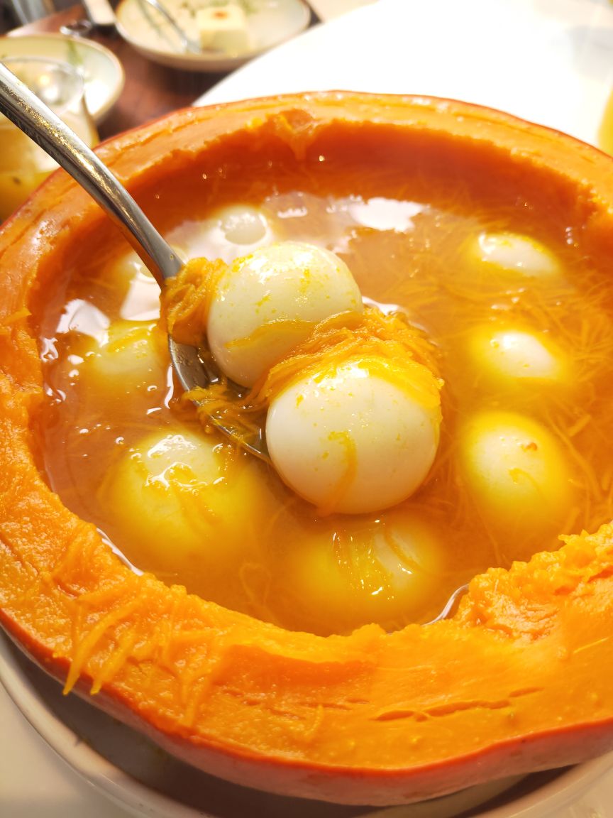 宝龙一城不念在4楼天台一处,位置明显优势,环境宽敞明亮,装修简洁明快!最有特色的是一角落半面石头墙,刚开始感觉是现代农家乐,后来与店里的整体效果结合感觉又有欧式风格,也算是特色之一吧。不念的菜品比较有创意,将许多闽南菜进行优化改良,最传统的厦门糖葱卷点击率很高,醋酸萝卜和甜甜的贡糖引发儿时的回忆。醋肉三拼有醋肉、炸豆腐和糍耙三样小吃,颜值以及口感都很好。芋头煲吃起来有点小惊喜,芋头非常棉柔,入口即化,不带点粗纤维,与香菇、虾仁干、蒜头一起煲得很香。个人非常喜欢黑椒排骨,排骨做的黑黝黝,法式摆盘,每块排骨刚好一口一个很好入口,易脱骨,嚼起来有黑胡椒的香味。汤品是竹荪绣球菌炖水鸭,单看菜名就知道汤的原料都是比较清爽养身的,果然好汤受欢迎,大家都喜欢喝这种鲜美营养的好滋味。饭后甜品是酒酿南瓜丸子,整个南瓜挖掉籽后加米酒和黑芝麻汤圆去炖,南瓜本身微甜,加上黑芝麻汤圆的甜很协和的甜汤,竟然不会觉得太甜或太腻,吃甜汤的时候还可以挖南瓜的墙角,把南瓜肉也吃了,分量足足的。