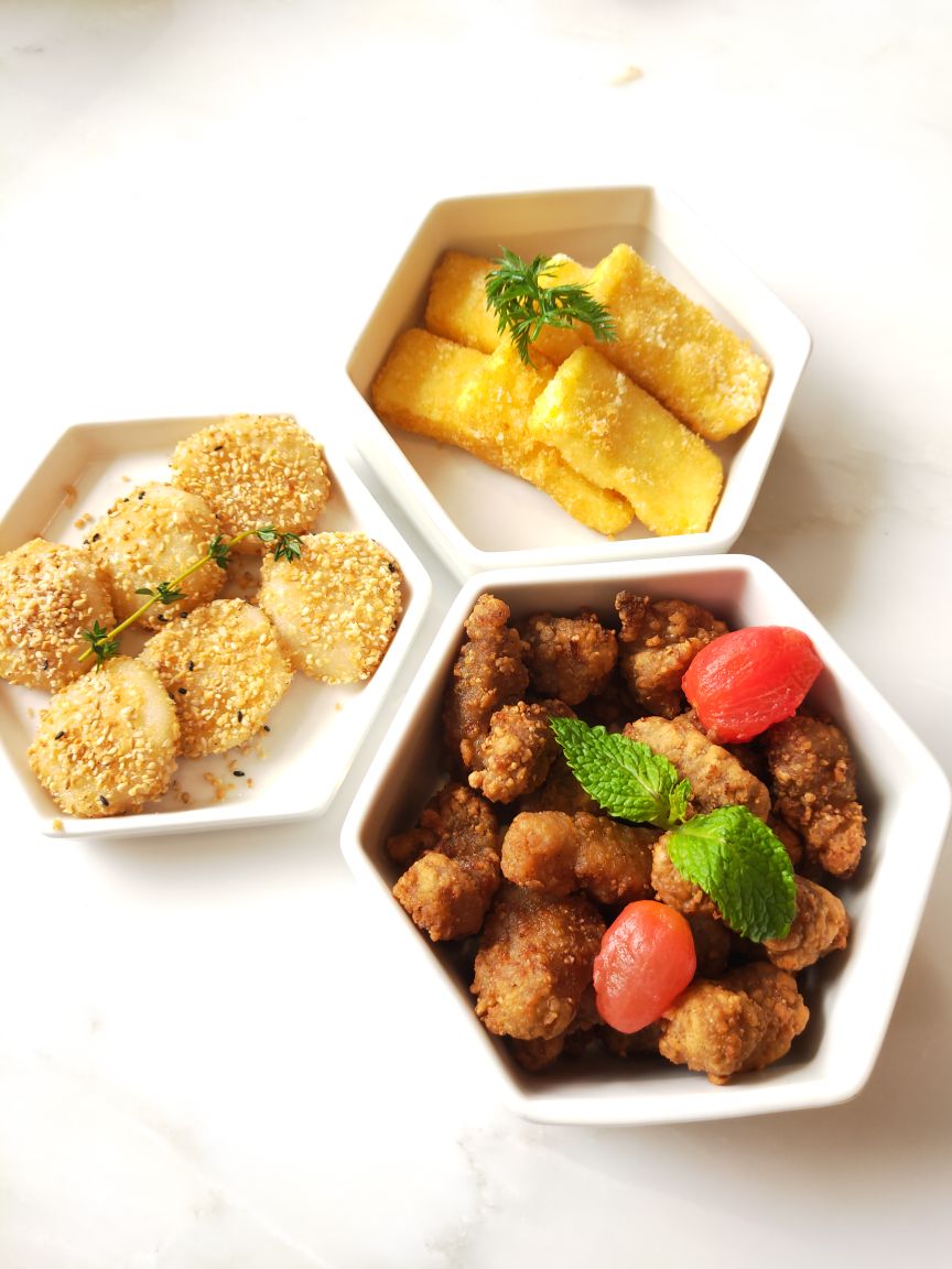 醋肉三拼有醋肉、炸豆腐和糍耙三样小吃,颜值以及口感都很好