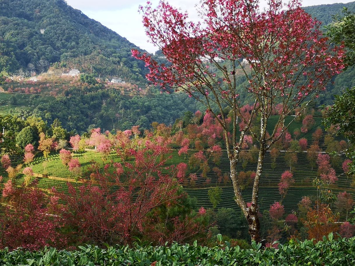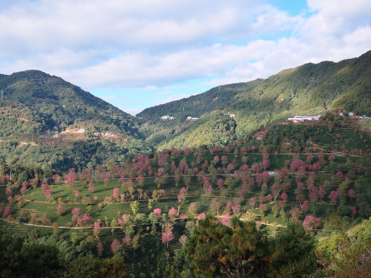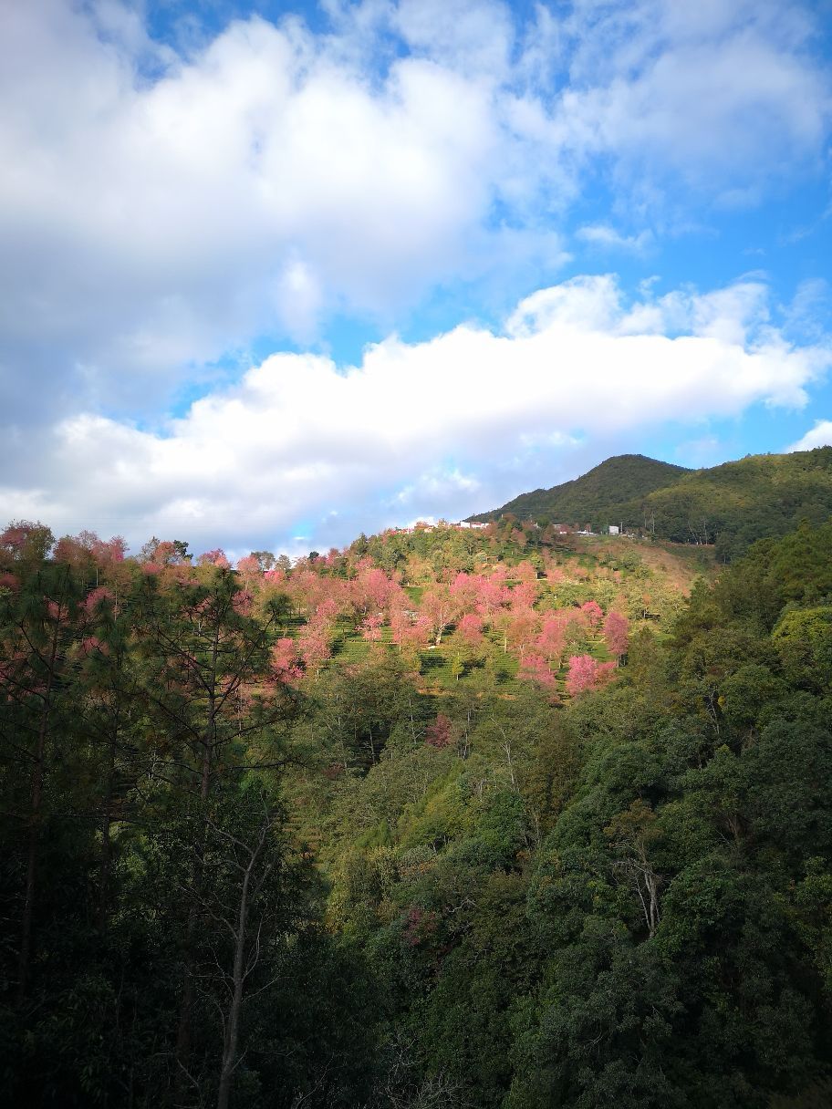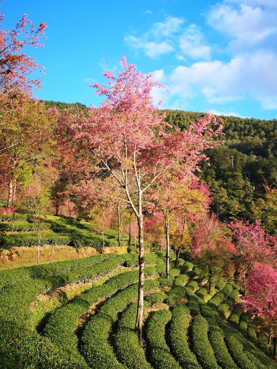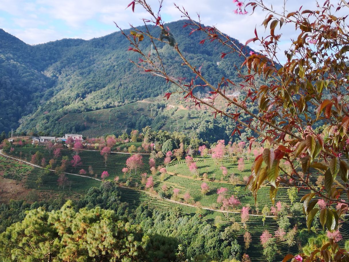 12月1日早晨7.40,在樱花谷一号观景台观赏冬樱花,美就一个字12月1日早晨7.40,在樱花谷一号观景台观赏冬樱花,美就一个字。再沿步道用20分钟走到二号景区,就是在一号观景台看到的那面茶树坡,抵近观赏樱花。可以在无量山樱花谷入口附近,二号景区附近,或公路边的客栈住宿。
