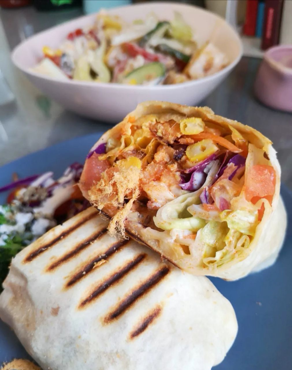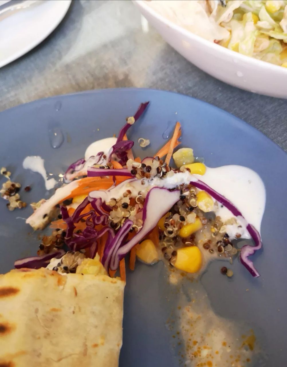 和一个虾仁芒果萨拉,牛肉饼还是蛮好吃的,里面的牛肉分量挺多的,外面的饼皮脆脆的,融合在一起,口感挺好点了三个主食,一个牛肉馅饼,一个酸奶鸡蛋卷,和一个虾仁芒果萨拉,牛肉饼还是蛮好吃的,里面的牛肉分量挺多的,外面的饼皮脆脆的,融合在一起,口感挺好。鸡肉卷里面内容丰富,有各种蔬菜和水果,很好吃。