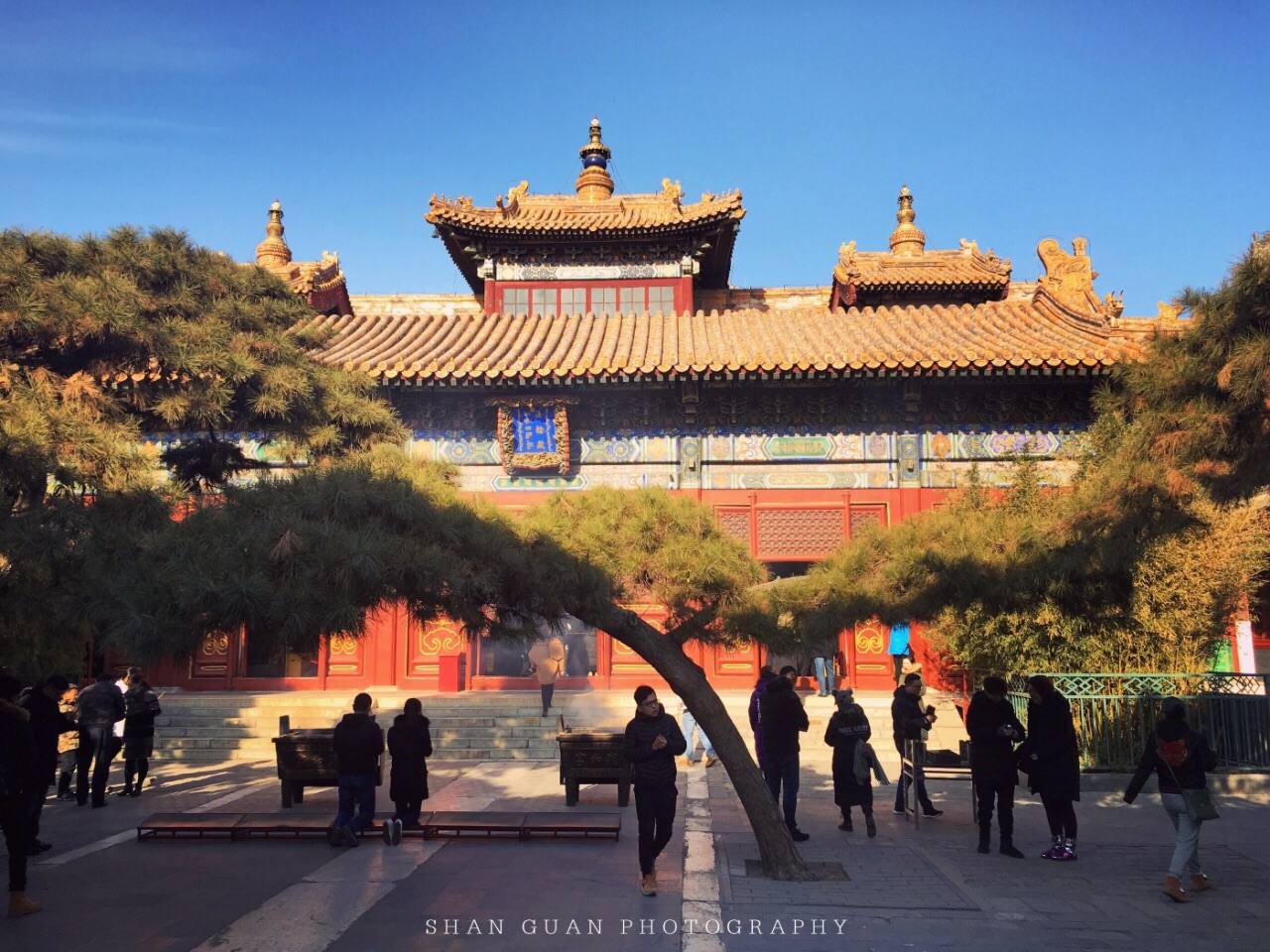 两条凌空飞廊位于万福阁二楼两翼,分别与左右较低的永康阁、延绥阁连接,因为这两阁都低于万福阁二楼,所以两翼呈缓坡下降的模样。 信息四处可考,白檀香是谁敬送、多层的回廊立柱如何复杂、如何沿着楼梯回廊看到不同高度的佛像,不复一一。