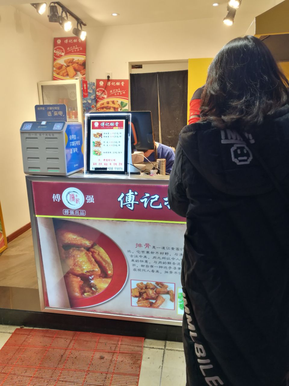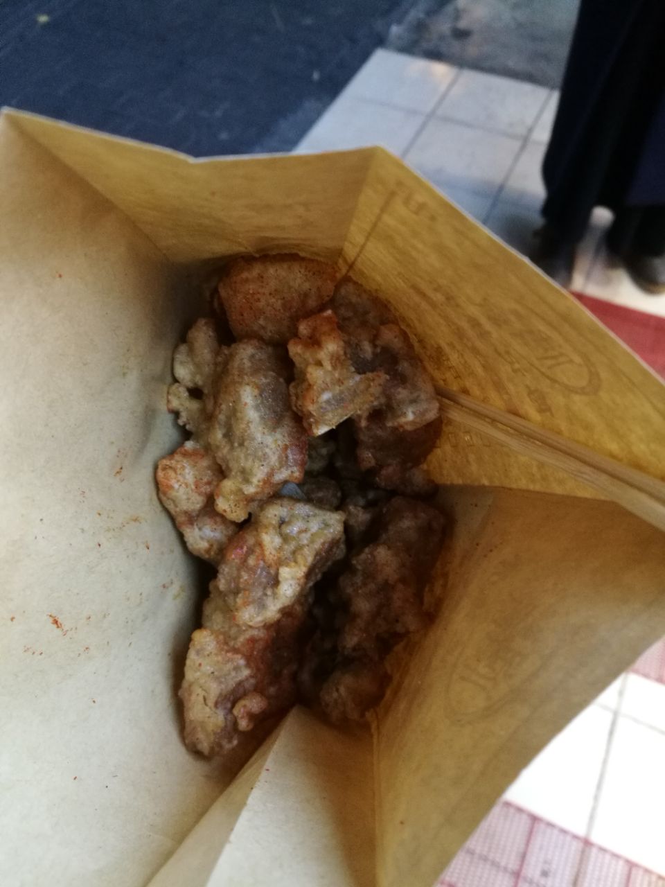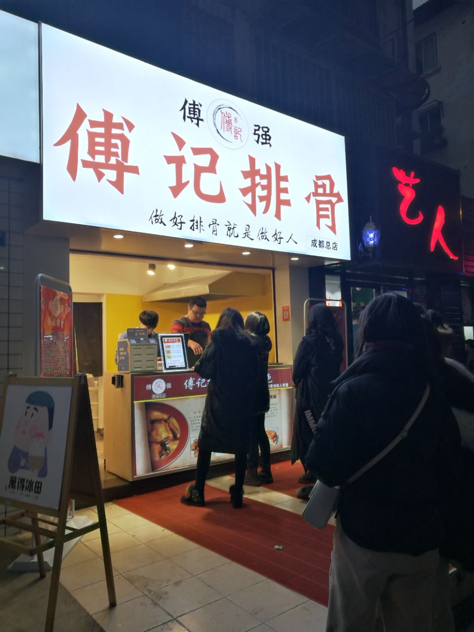 在点评网上秒杀到的小份排骨,价格相当便宜,趁着到建设路逛耍就过来领。还差10分钟到5点,店员说得等到5点才能领。我又去其他地方吃了东西过来看到门口排了两三个人。因为之前看网上介绍这家才是资格的傅记排骨,隔壁大概几十米远是仿的,结果假的那家生意居然更好,起码排了10多人。有个胖店员问要什么味道,就要的麻辣味。排骨炸的火候还把握得不错,有点香又不会太干,里面还有几个鸡排还可以。路过的时候来尝尝当小吃还是可以的。