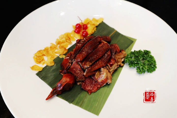 南昌融创万达文华酒店一层品珍中餐厅午餐:豉汁乳鸽、黎蒿腊肉、澳洲肥牛粒、西兰花酿虾饺、松茸菌炖...