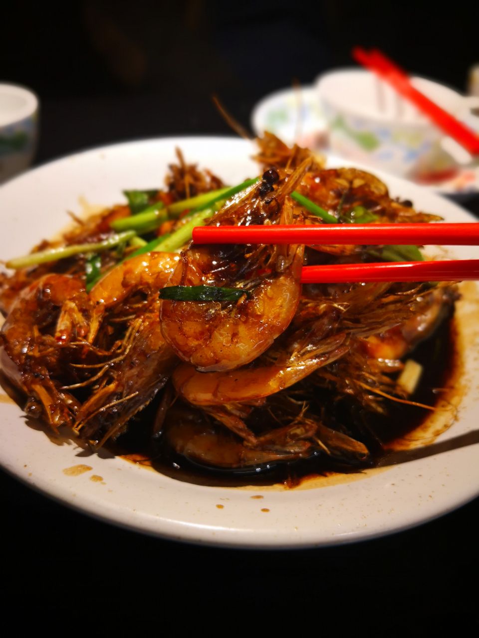 老头油爆虾这家店,早就想来吃了,正好中到了点评爱琴海购物公园的200元餐券,没有任何犹豫,就来他家了。 餐厅是半开放式的,有大排的明档,有依栏的餐位,有竹制的灯罩,有些江南的感觉。 虽然老头家没其他几家发源地同样是杭州的杭帮菜餐厅名气大,但翻看一下菜单,价位一样走的是亲民的线路。 油爆虾是必点的,店员说现在后厨都不怎么烧河虾了,因为河虾个头小,吃起来肉少,客人都不喜欢,而沼虾也是头大身子小,口感不美。于是在店员的推荐下,点了油爆基围虾。的确虾壳被油炸到酥脆,完全可以吃掉,虾肉不老,浸在酸甜的酱汁里,一口气吃了好几个。 酱鸭的表皮颜色已经跟卤汁的颜色一样幽深了,鸭肉细嫩多汁,比较喜欢鸭皮,吃起来柔软又甜美。 西湖醋鱼用的是草鱼,味道无功无过,比起油爆虾,它的卤汁里的酸度和甜度都高一些。 爆炒腰花,没能吃到我期望中的味道,腰花口感是嫩的,但入口的味道是平淡的。 炒青豆,吃上面的青豆,味道多是其自身的清甜味道,吃到下面蘸有汤汁的,则又加入了一道鲜咸的味道,怎样都好吃。 第一次体验老头油爆虾,感觉还不错。