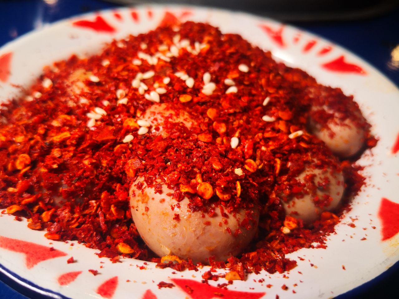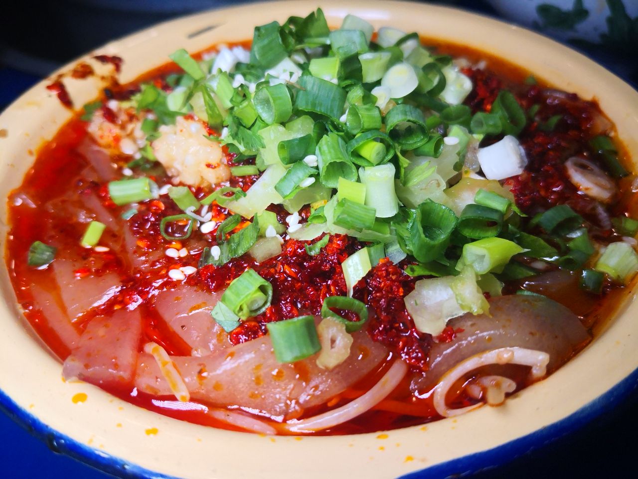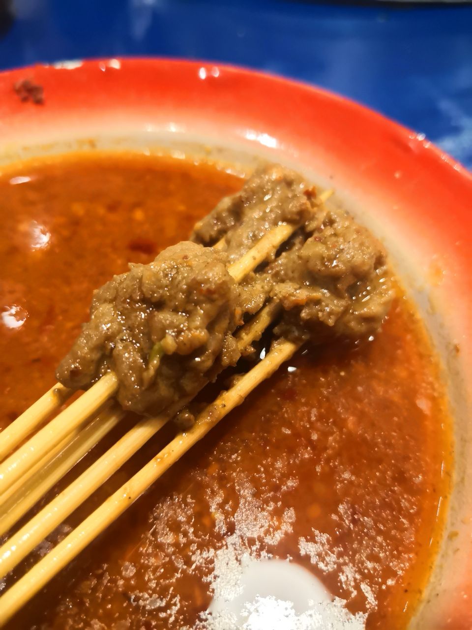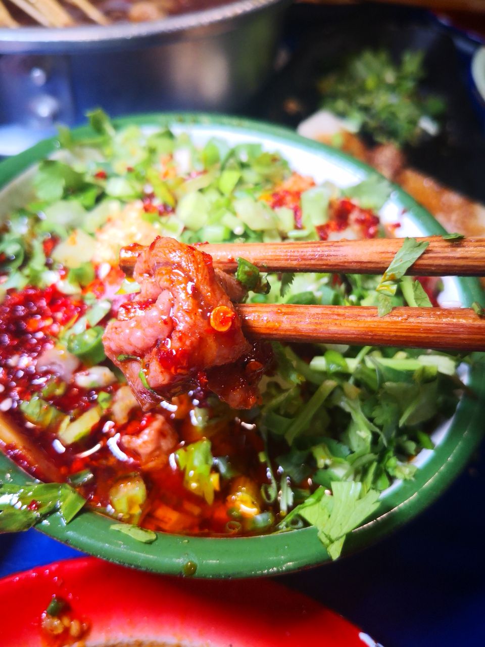 非常推荐, 酥肉,很香 上面撒的葱花,拍照很好看,东西也很好吃耶。 兔腰,简直是铺了一层厚厚的海椒面,有点巴适哦,不是特别的辣,正合我意,而且也非常适合拍照,好看。 串串我推荐牛肉哈,各种牛肉,不停歇,真心好吃 服务方面,我们这片是个阿姨在帮忙招呼,我们要什么饮料和小菜都是确认一遍并登记,态度很好,动作慢了点给我们赔不是。也能理解大姐出来工作不易,马路边边还是给这些大姐一个就业机会也还是不错。