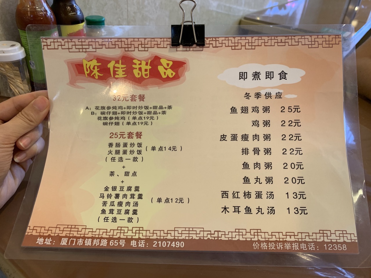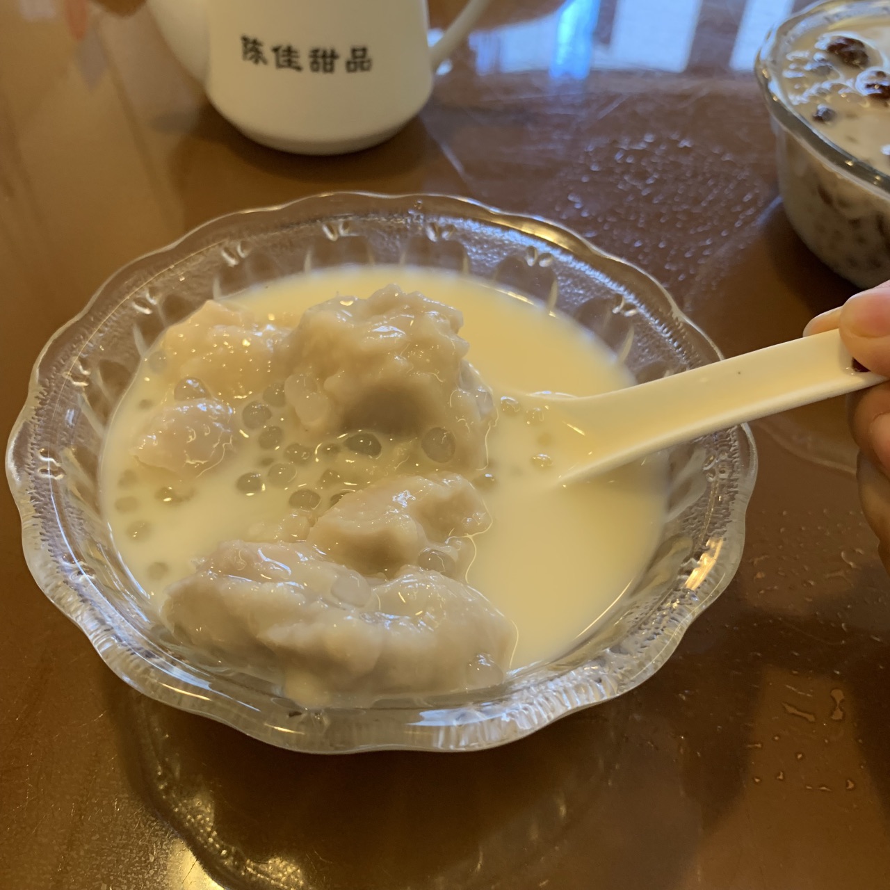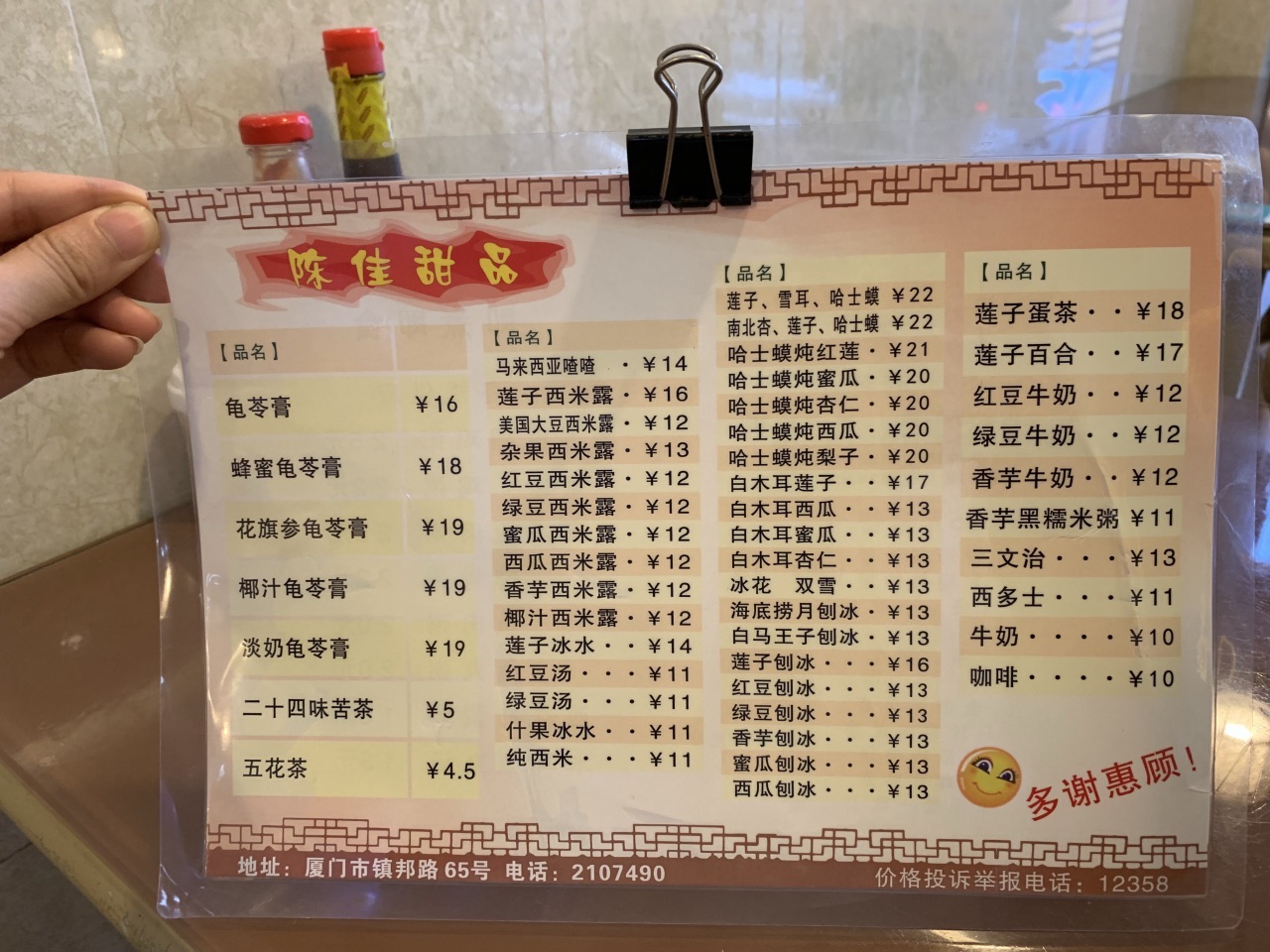 总评: 价格虽然不算便宜,但是用料确实扎实,算的是一分钱一分货。 比较老字号的传统甜品店吧。 如果在这附近,我还是推荐你来尝尝的,感受一下古早味哦。 评分:80分 性价比:❤❤❤ 这个算是广式的甜品吧,我理解的是这样的,比如龟苓膏、双皮奶一类的。 但是这家评价蛮好的,所以我还是绕道过来尝了尝。 算不得特别惊喜,但是也觉得来这一趟不觉得可惜。 【香芋西米露】12元 厦门、福州这边的芋头都挺好吃的呢,不知道是不是我去的店选材都很好呢! 这碗芋头西米露,牛奶配上粉粉糯糯的香芋块儿,还有剔透的Q弹西米露,扎扎实实的,甜度适宜,一口接一口,幸福得呢! 【马来喳喳】14元 这个和前面的香芋西米露很像呢,就是多了写红豆,所以贵了2元。 所以如果点了马来喳喳,就不要点香芋西米露了哦,口味口感都差不多的,都好吃。 【蜂蜜龟苓膏】18元 比普通的龟苓膏多了蜂蜜,所以要贵2元。龟苓膏还是蛮大一罐的,看起来就挺苦的。 把小壶里的蜂蜜倒出来,混合着龟苓膏吃真的会好一点,不然真的会苦哭的呀。 要不是因为龟苓膏是店家招牌,我是肯定不会点这个的。 总体来说,还可以,喜欢吃这类甜品的,可以去试试哈。店员都服务态度也蛮好的,都是些中年大姐。