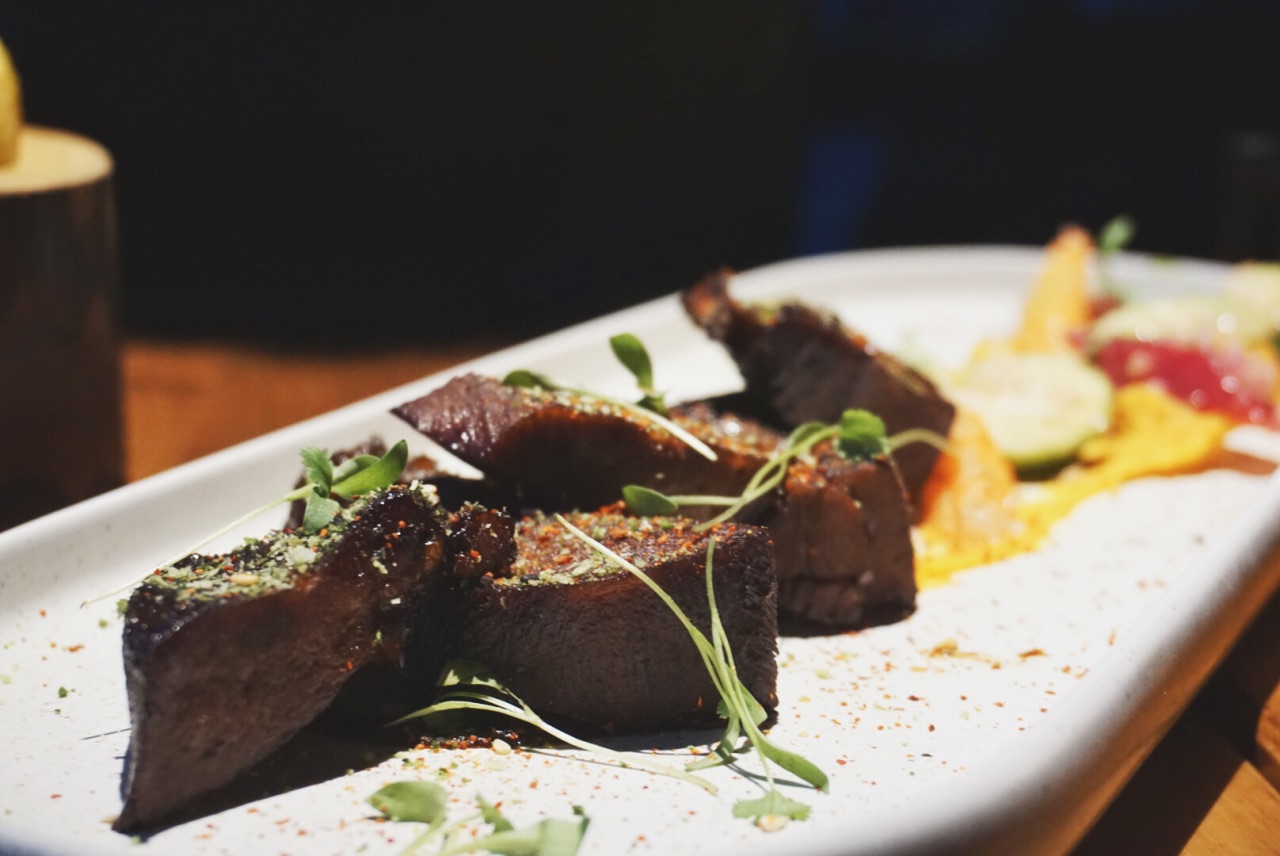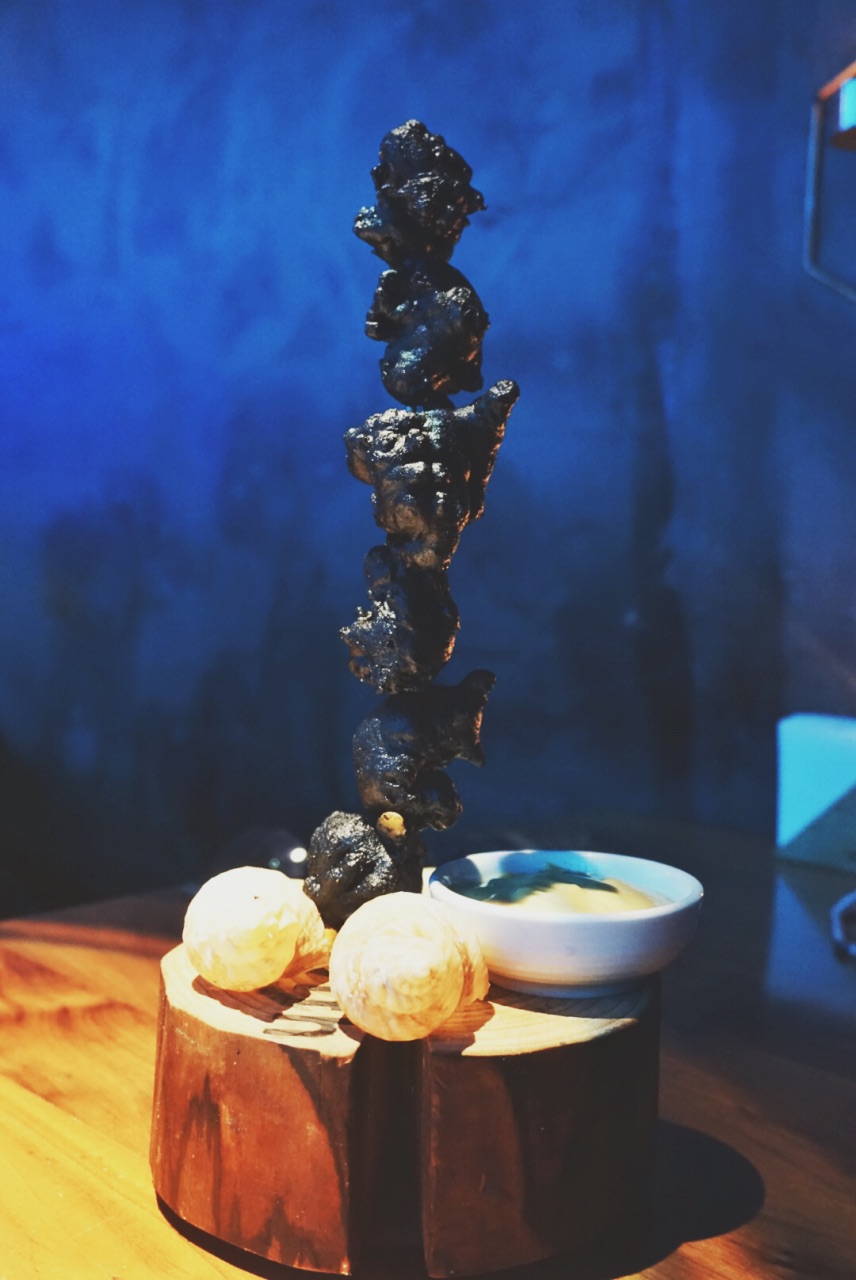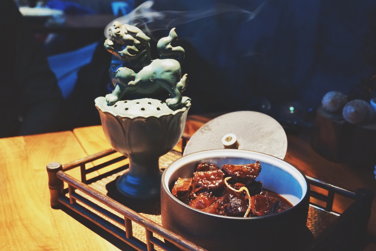 All the love系列旗下的餐厅, 在丰盛里的黄金地段,也是新晋的网红店哦! 周五的晚上,提前预约绝对是明智的, 进去之后错觉自己在蹦吧, 我动感的音乐,镭射灯光,变幻的色彩, 还有那噱头十足的时空长廊, 走到头就是吧台,如果不吃晚餐喝一杯也不错。 就餐环境很有情调,除了餐桌中间一块有射灯, 其他基本就是乌黑麻漆,俗称的有情调… 菜品嘛,根据推荐才来点就不会错, 小胖鸽,乳鸽烤得很多汁, 下面配的菌菇烩饭,两者中西结合还蛮好吃的! 七味厚切牛舌,虽然没吃出七种味道, 但是这么厚的牛舌很嫩,可以当主食啦… 巫师海螺,上来的时候还真不知道是什么, 海螺这种做法还是第一次尝试, 外面用墨鱼汁包裹煎炸,沾着蛋黄酱, 喝酒好搭档,而且串起来的造型也别致… 沉香牛肉,噱头很足的一道菜, 旁边点着一个香炉,还冒着烟, 牛肉炖的很酥烂了,抿一口就化在口中… 最后当然要推荐一下他家的鸡尾酒, 很好喝,很好喝,很好喝! 分得很细,根据酒精浓度可以有很多选择, 小哥哥服务员还会来关心下口味, 服务也是很到位哒!
