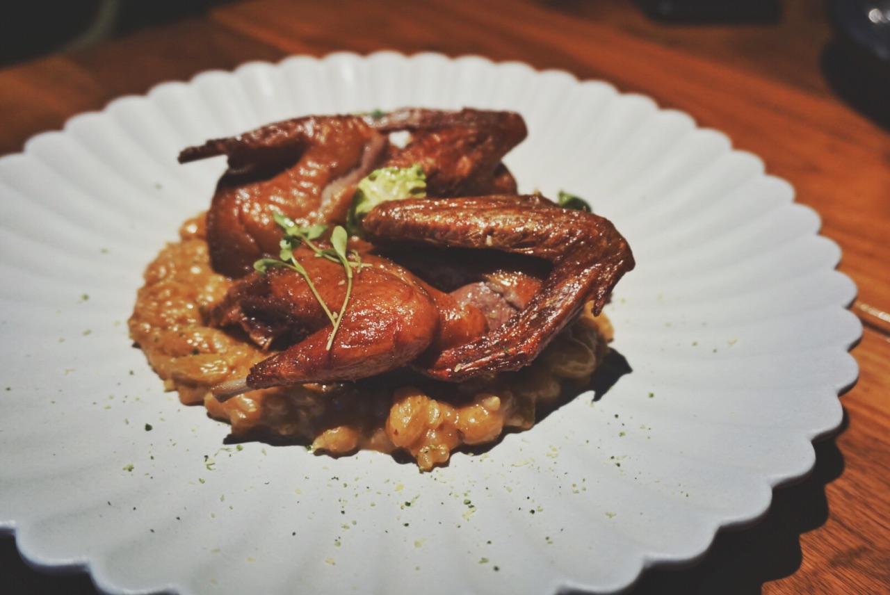 ...,根据推荐才来点就不会错, 小胖鸽,乳鸽烤得很多汁, 下面配的菌菇烩饭,两者中西结合还蛮好吃的