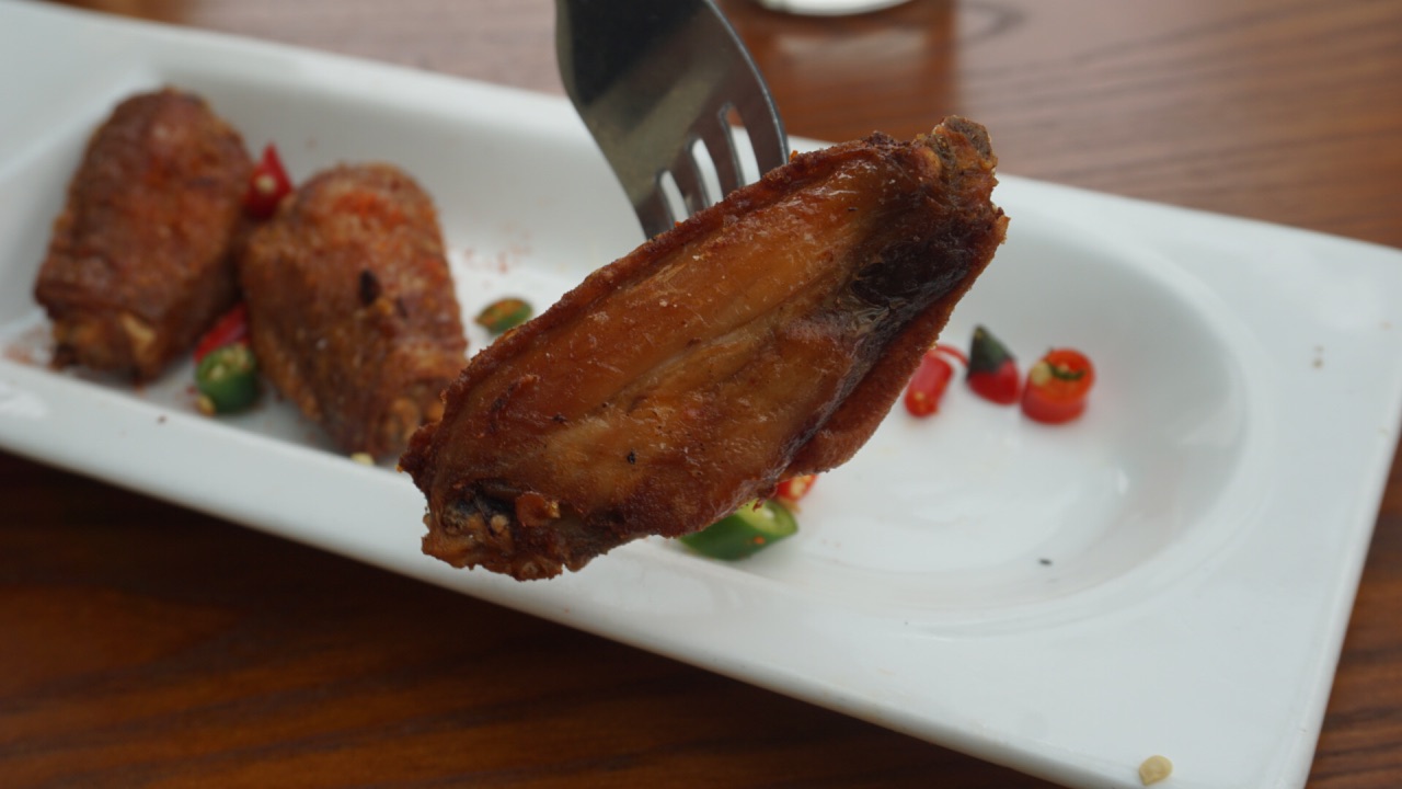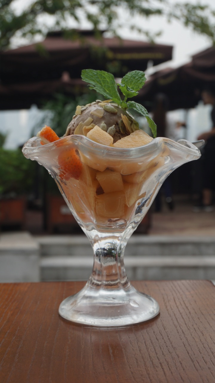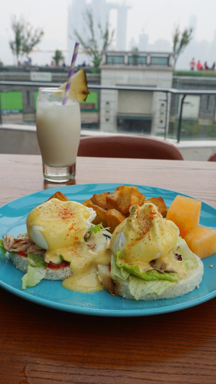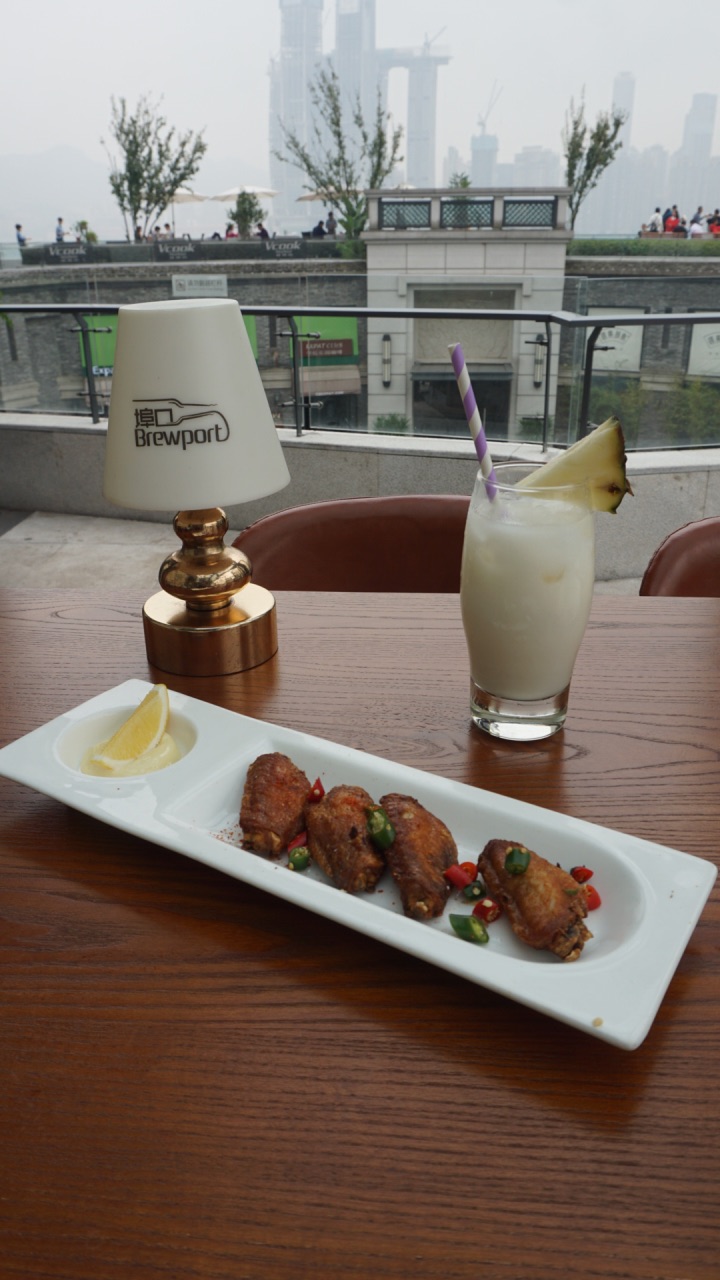 坐拥180°巨幕的江景餐厅,将重庆夜景尽收眼底 长江索道而下,坐观光巴士,重庆长嘉汇,中西合璧的弹子石老街。 美国有东岸良港波士顿,重庆有百年开埠长嘉汇,一方码头,两处情愁,这间餐吧:埠口Brewport,正得名于此。 埠口精酿西餐吧,重庆人气酒吧,6楼比邻埠口最美天台,室内 室外都可以坐。 装修环境特别富有异国情调,格调满满,过来小聚或是约会都蛮不错的,室外视眼颇佳。 金枪鱼班尼迪蛋,42元,色彩纷呈,班尼迪蛋流黄,超级诱人,炸薯块很好吃! 香辣鸡翅,28元,独有的重庆风味,一口咬下去嘎嘣脆,很香。 椰林风情,28元一杯,原本是想点雪顶草莓,可惜没有,一般般。 冰淇淋就很一般了,巧克力没什么味儿,整体价格太便宜。