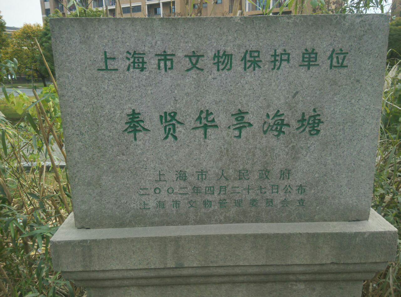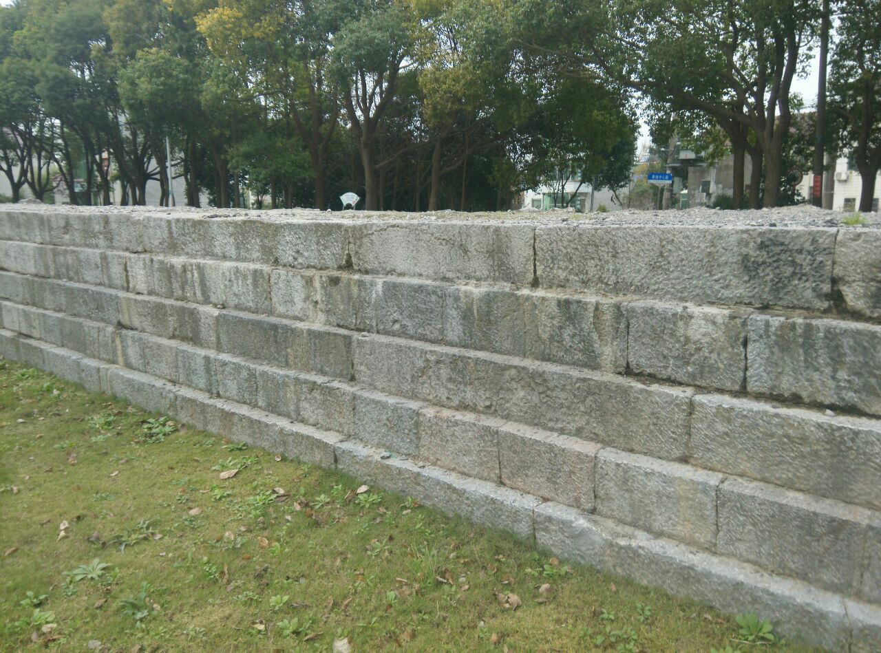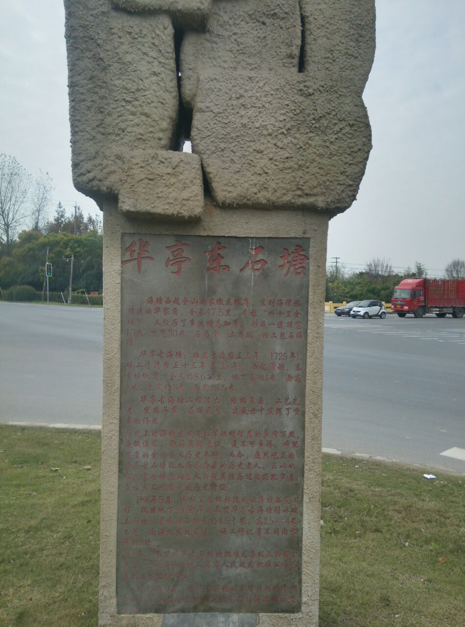 那是雍正年间建造的海塘,距今三百多年了。海塘依旧海岸已经在此处三公里外了,显然已经没有任何功能了,所以现在看起来就像一道石墙延绵近十公里。我们现在看到的图片是拍摄自奉柘公路海湾路口的一段纪念公园。此处遗迹沿奉柘公路和上海应用技术大学围墙间的狭长地带展开,围墙内300年前的海面现在已经是一所高等学府了。
