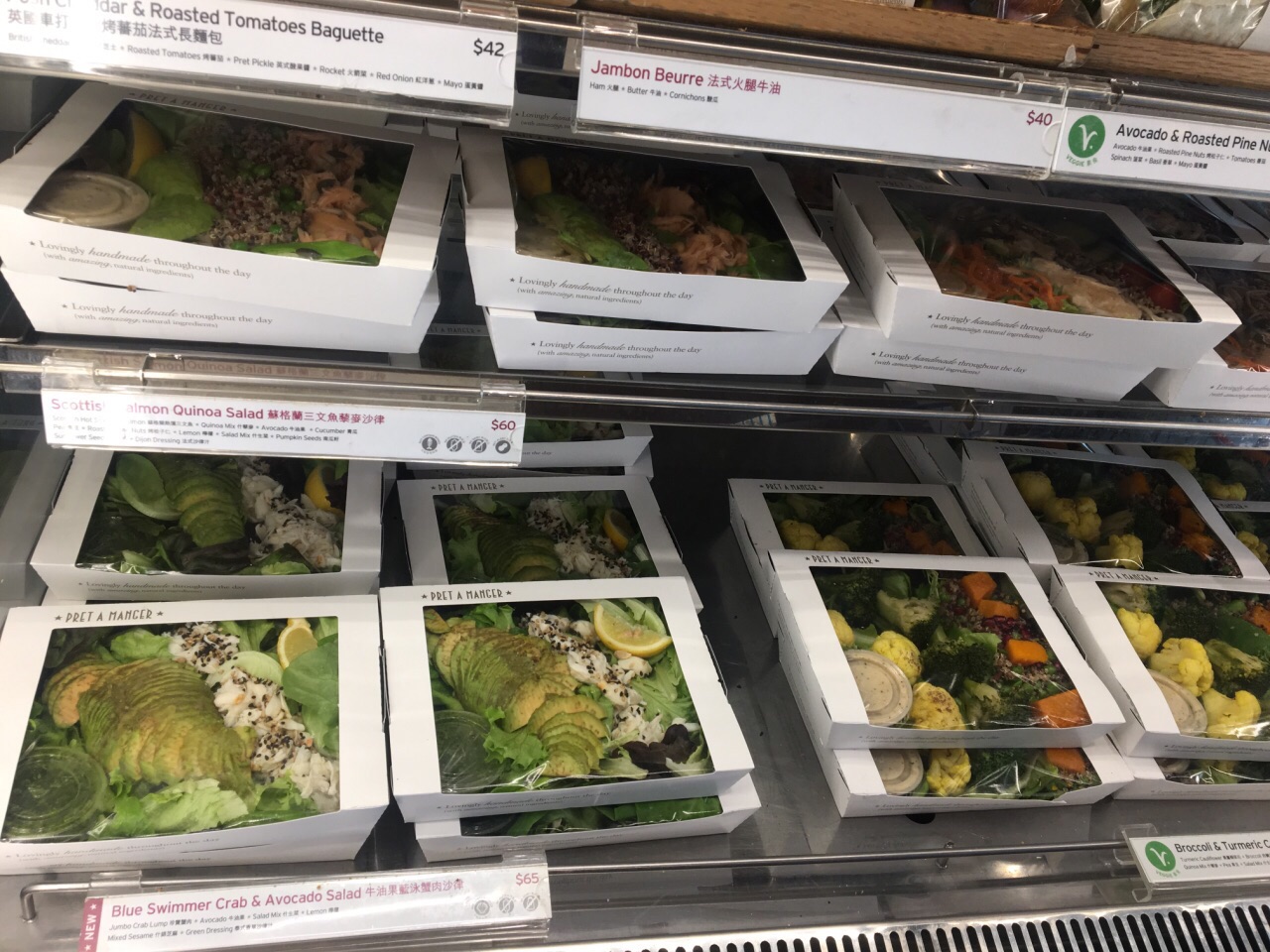 金钟地铁站里面有没有这一家我不是太清楚,但是我是在金钟地铁站楼上的天桥上买的这一家的牛角包,在力宝中心与金钟廊天桥的衔接处。这一家主卖的是三明治,同时也有很多的新鲜沙拉,像是苏格兰三文鱼藜麦沙拉、牛油果蓝泳蟹肉沙拉,听起来都是一些高档的食材,然后很健康的组合,主要的目标消费人群就是忙碌的白领。