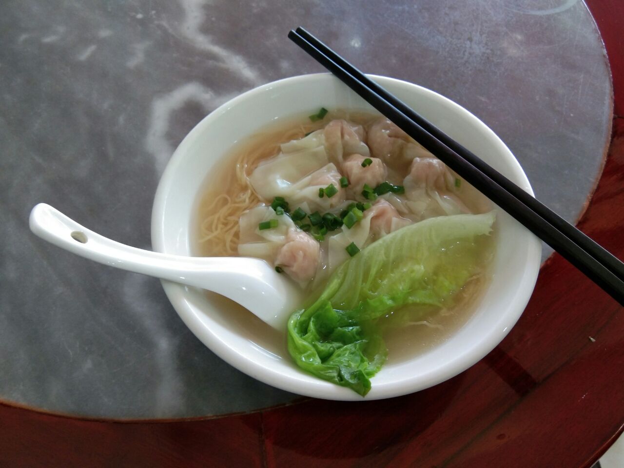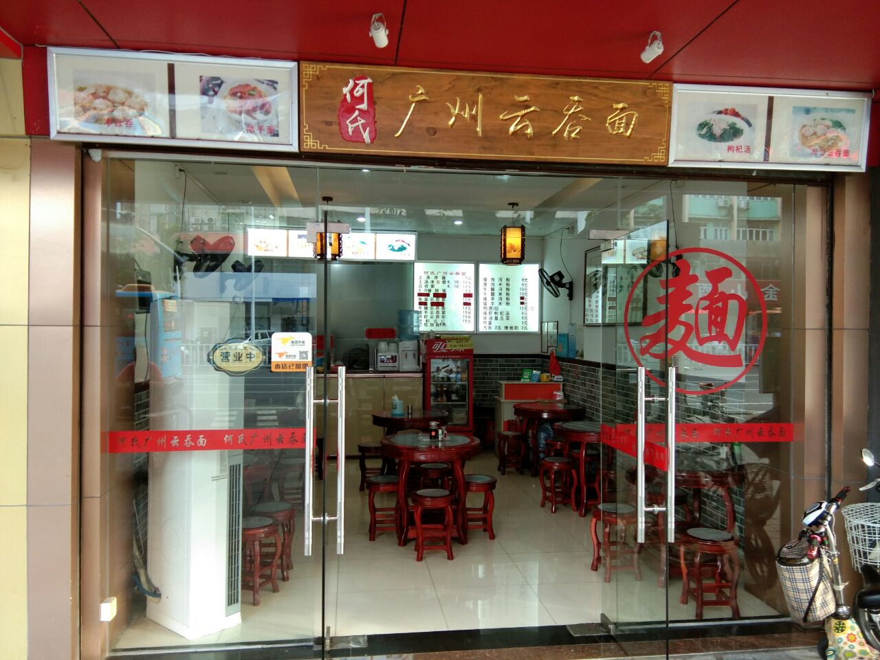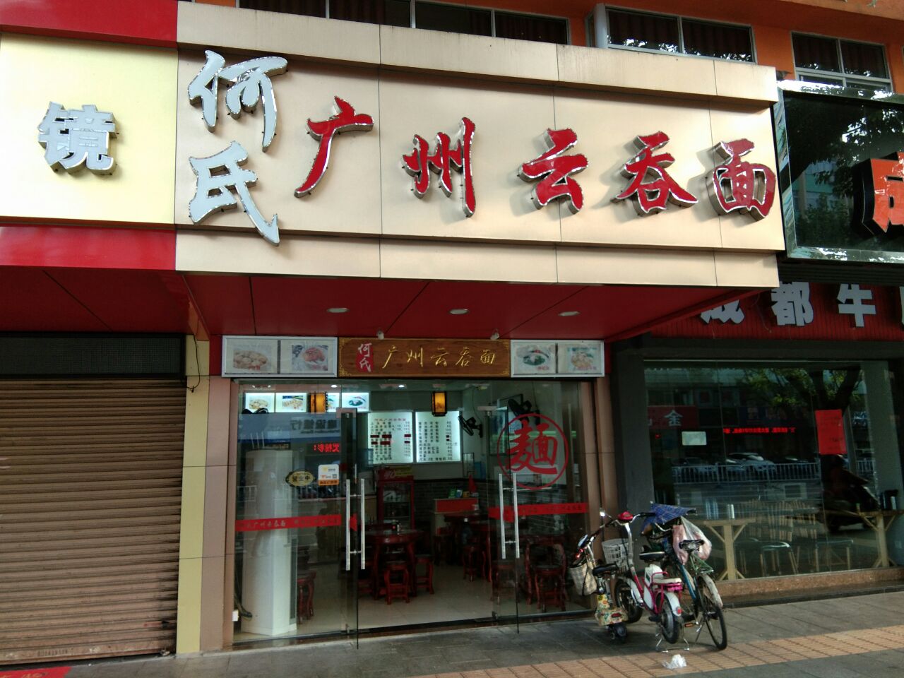 何氏广州云吞面――肇庆品尝广州味!酒店附近没啥茶楼,干脆尝尝这家云吞面是否正宗美味?还不错哦!尤其是正宗的爽滑竹升面。小碗云吞面6元,忍不住再来韭菜煎饺6元6个。小店面积很小,古色古香的粤式桌椅,,附近还有几家不同风味面店在竞争。