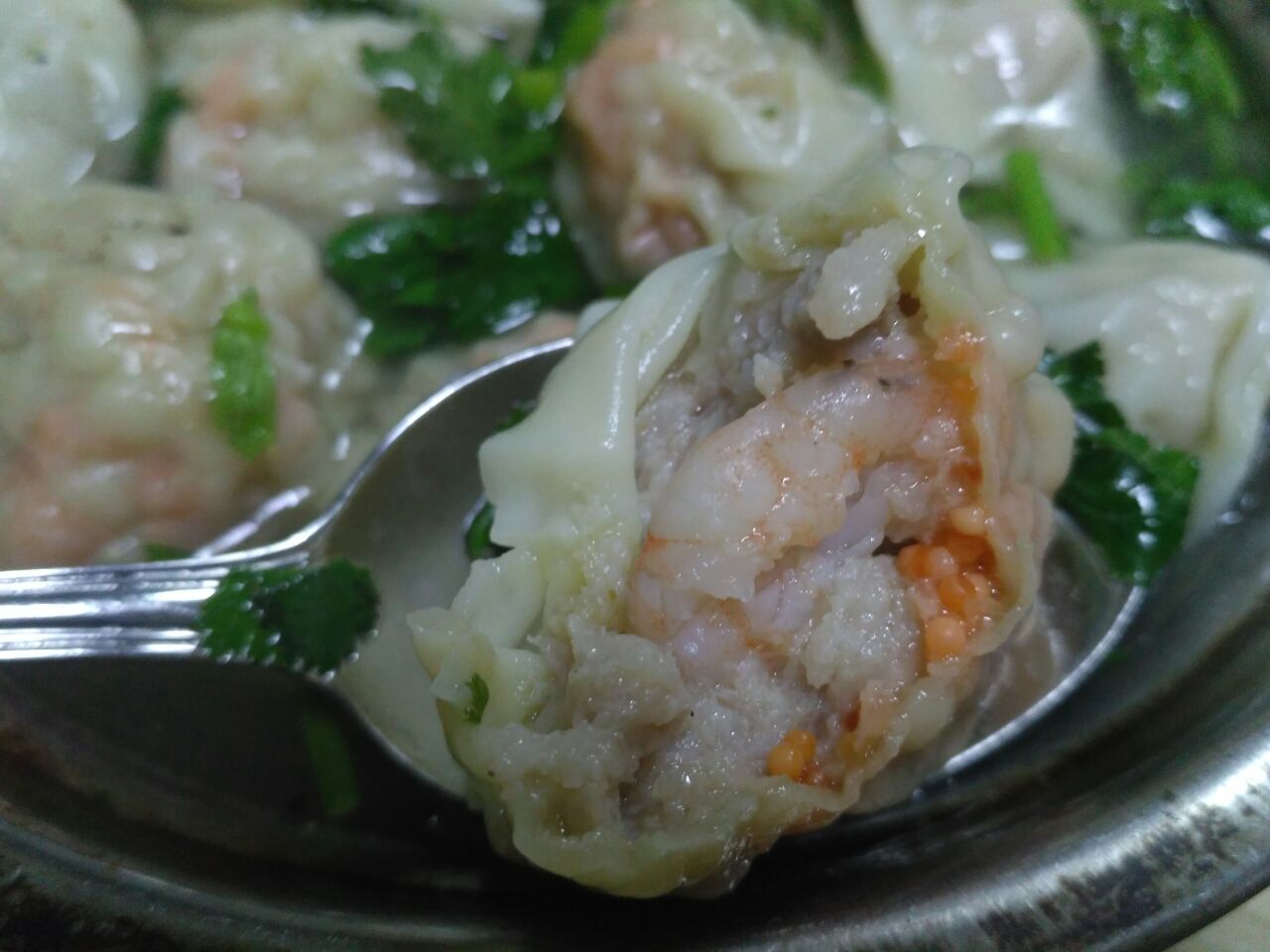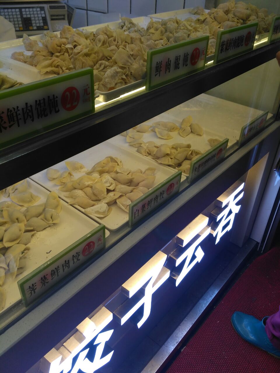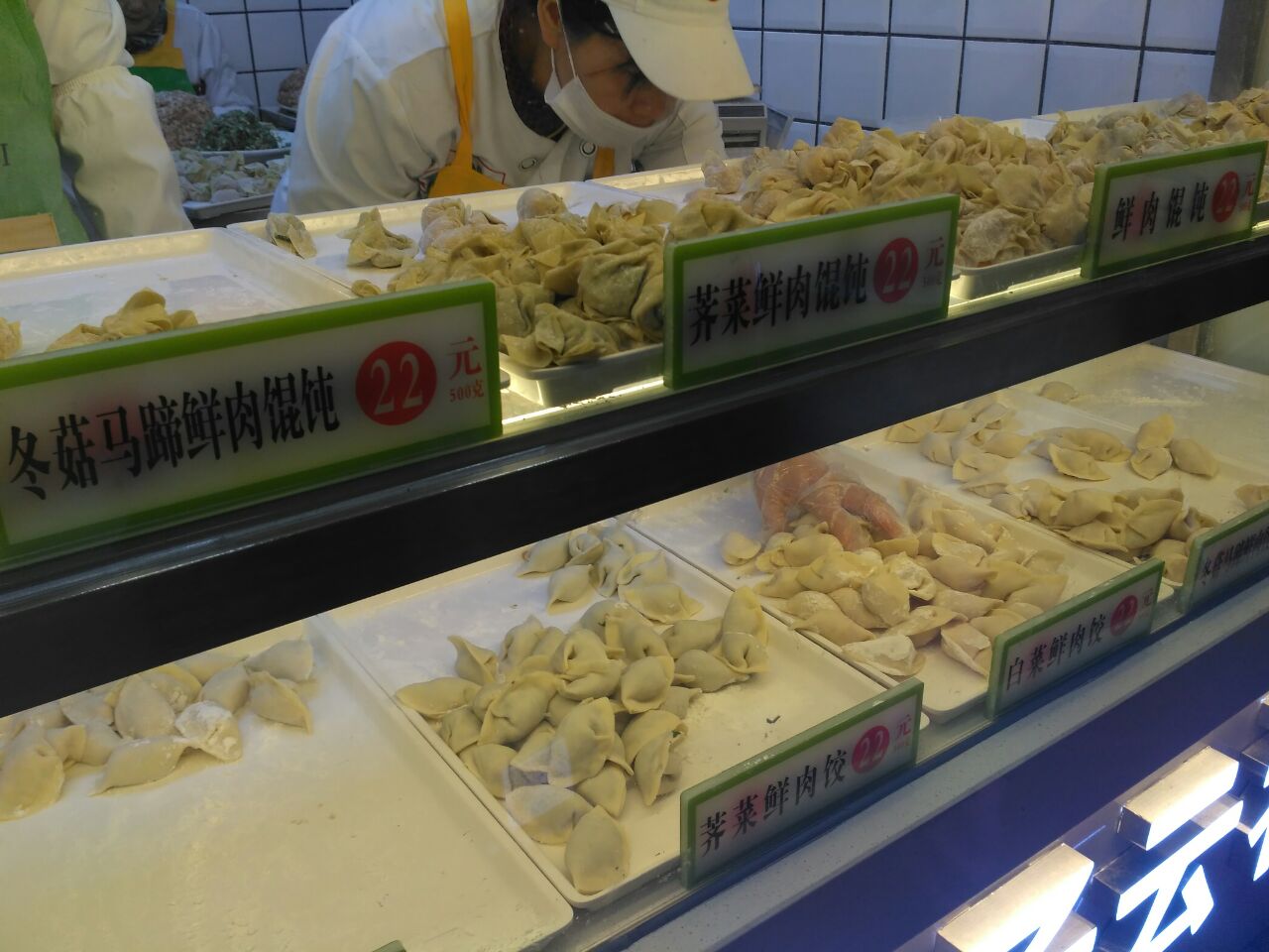 冬至日排队来买饺子的人很多,这家开了有一阵子了,位置挺好,就在地铁四号线鲁班路站附近。店里有云吞,饺子,面,还有蒜泥酱。云吞与饺子是称斤卖的,饺子都是22元一斤,蟹籽虾仁云吞32元一斤。云吞的样子是港式的那种。买了蟹籽虾仁云吞,一颗的量很大的,味道不错,蟹籽在嘴里的感觉挺有意思的。冬菇马蹄鲜肉饺子也蛮好吃的,马蹄量比较多。