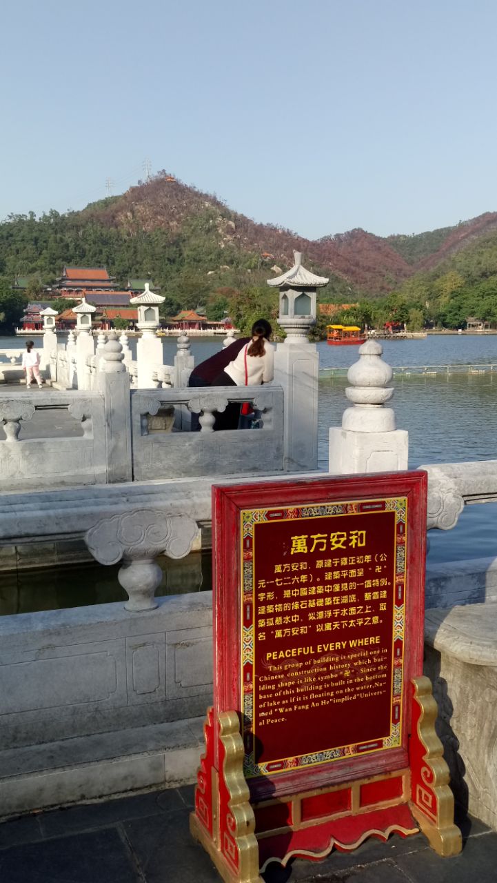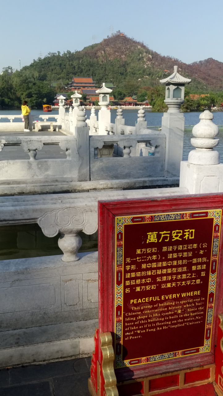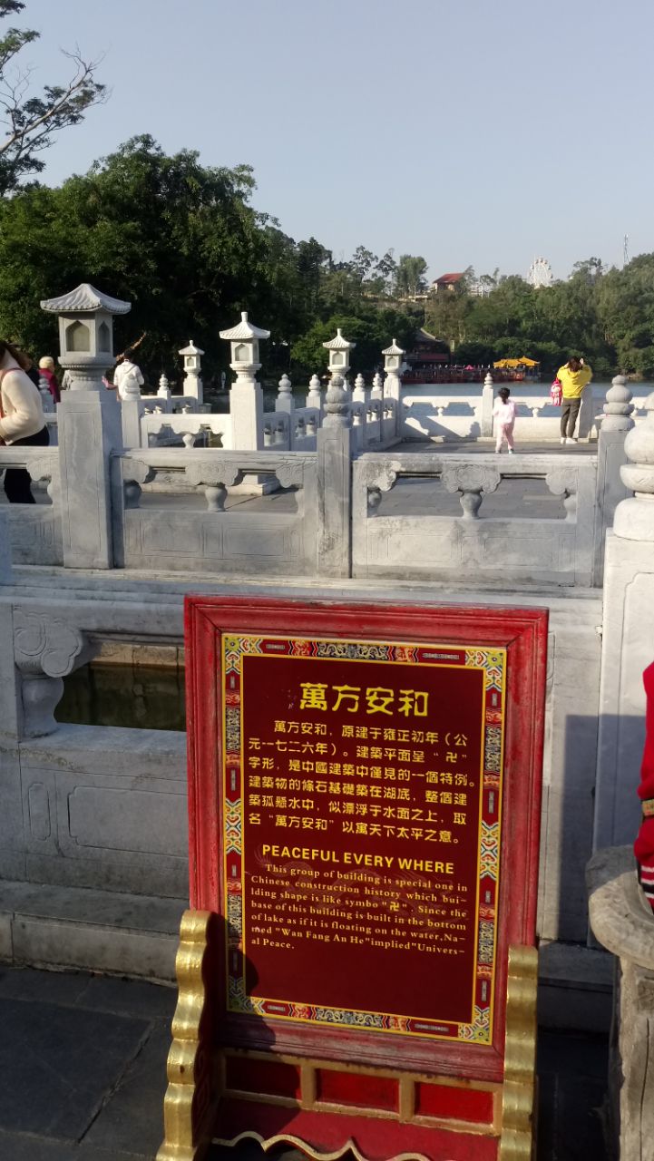 网友2018-12-24万方安和的牌子用显眼的红色立着,特别有中国的喜色,字迹用金色,在阳光的照射下显得非常威力,不错非常优美的自然景观,虽然是仿照的,但是很逼真哦,值得一看。万方安和的牌子用显眼的红色立着,特别有中国的喜色,字迹用金色,在阳光的照射下显得非常威力,不错。