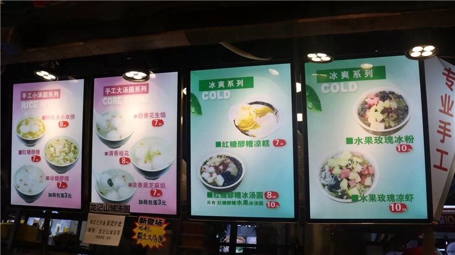 我超级超级喜欢的龙记山城小汤圆。“好吃不贵、健康美味”这句话,完美形容出龙记给我的感觉。 其实一开始,我是不想点冰汤圆的,毕竟天气如此寒冷,吃了岂不是透心凉?可是看着这五颜六色如此好看的冰汤圆,诱惑力太足。当然得来一碗!等到一口冰汤圆入口,并没有感觉到冷,那一股清甜的口感,反而让我吃了一勺又一勺,吃得笑逐颜开。 霸王大汤圆,市场上独一家,是龙记他们花了半年多时间研制配方比例而成的大汤圆,好评很高