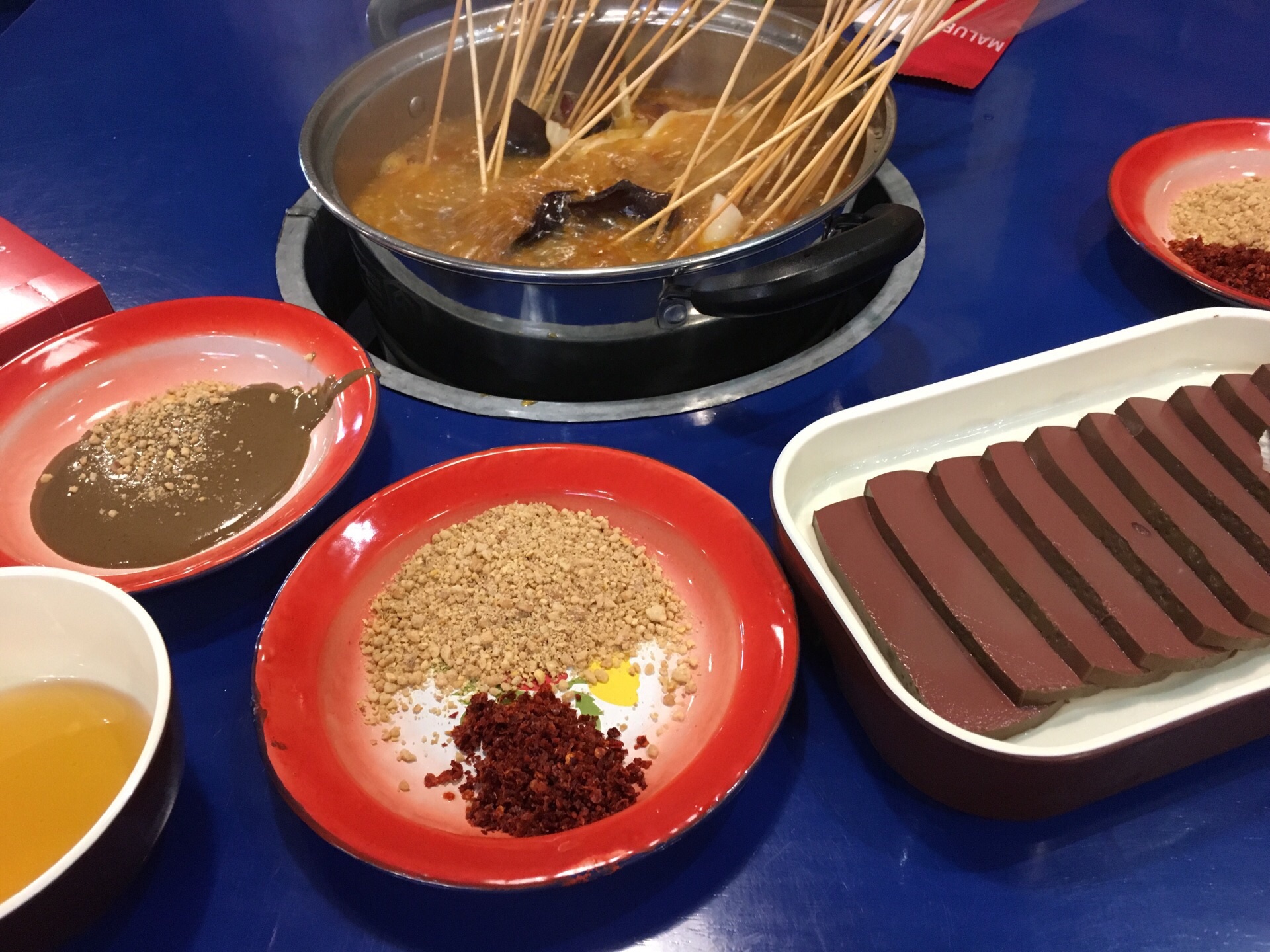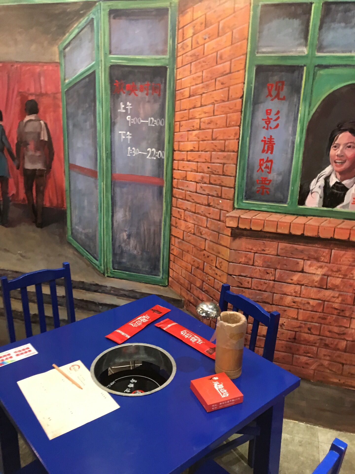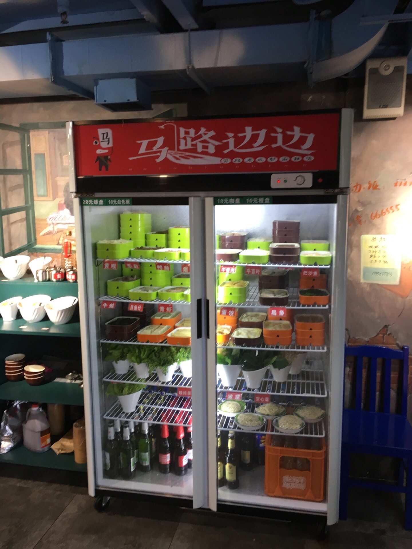 这家火锅店好像是新开的,因为以前没看到过,正好在这里附近办事,于是就来尝尝,店家的门面比较小,装修还算不错,老上海的味道,不过,餐具桌椅都比较简陋,服务很一般,服务员都不见几个,而且得费尽功夫才能叫得来,办事速度比较慢,值得提高。餐品比较简单,就是肉类蔬菜类,一些盘子菜价格也不便宜,最要命的是店家没开空调,本来以为吃个火锅能越吃越热,可是没想到,太冷了,店家真不该节约用电,哈哈,因为顾客觉得越吃越冷,使得印象大打折扣,希望以后能有所提高吧