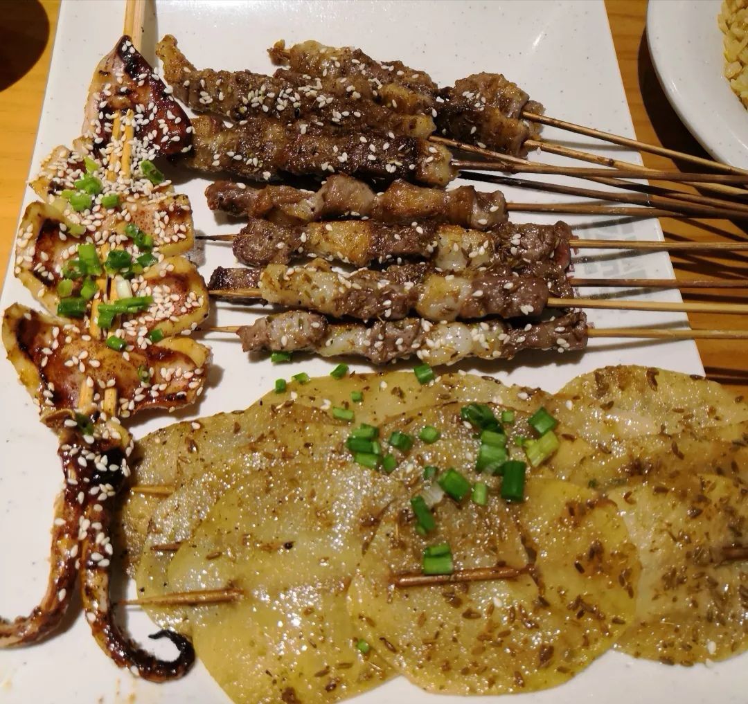 特别好吃,还有烤土豆,羊腰,木屋炒饭,烤土豆等都很入味,炒饭就着赠送的小菜很好吃,酸梅汤也好喝,很棒烤肥牛,口感挺不错,味道很纯正。鲜鱿鱼串,鲜而嫩,加上酱汁葱花芝麻,特别好吃,还有烤土豆,羊腰,木屋炒饭,烤土豆等都很入味,炒饭就着赠送的小菜很好吃,酸梅汤也好喝,很棒。