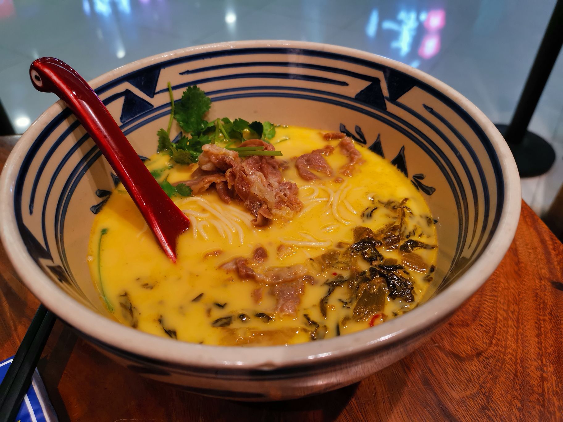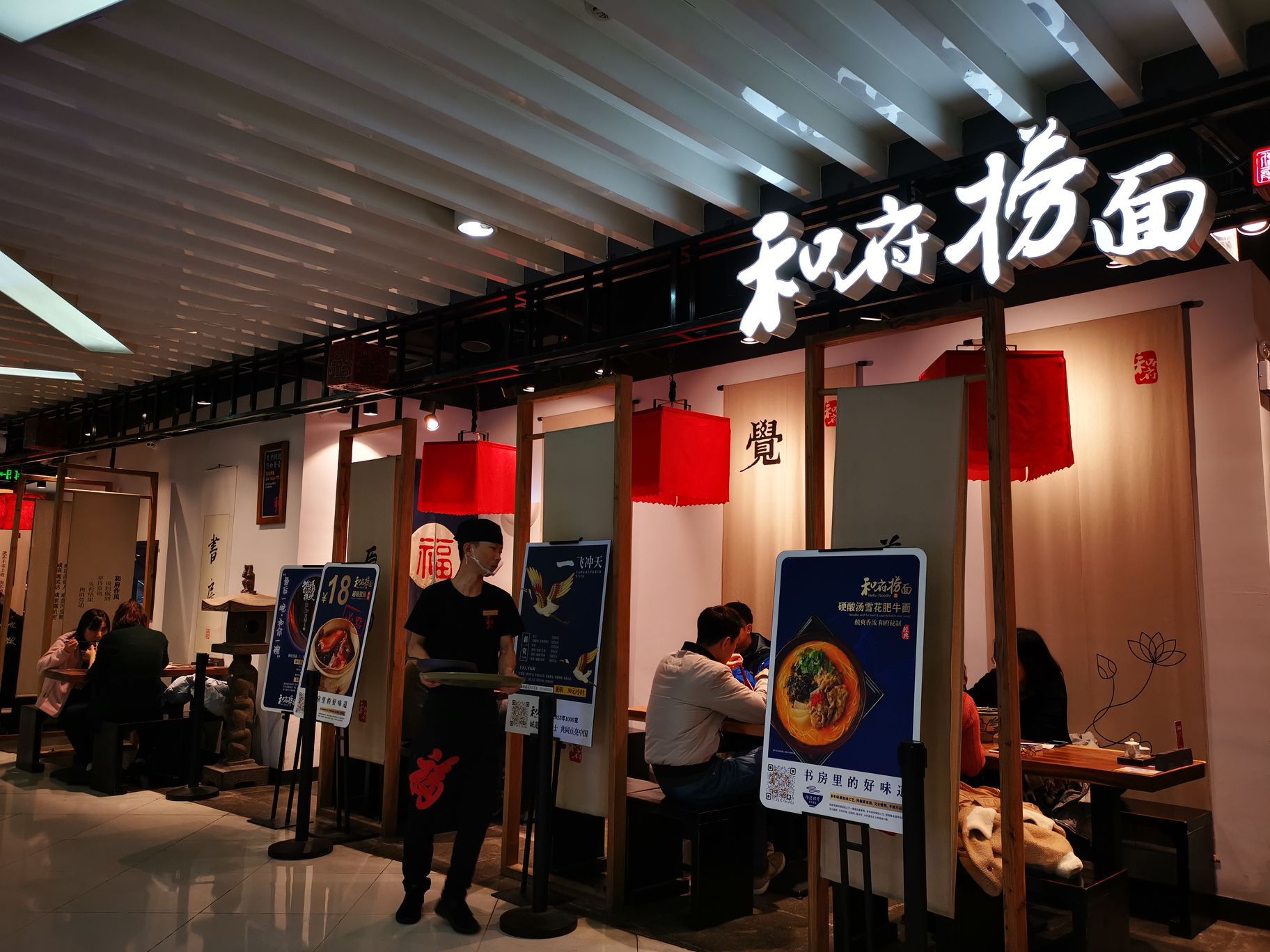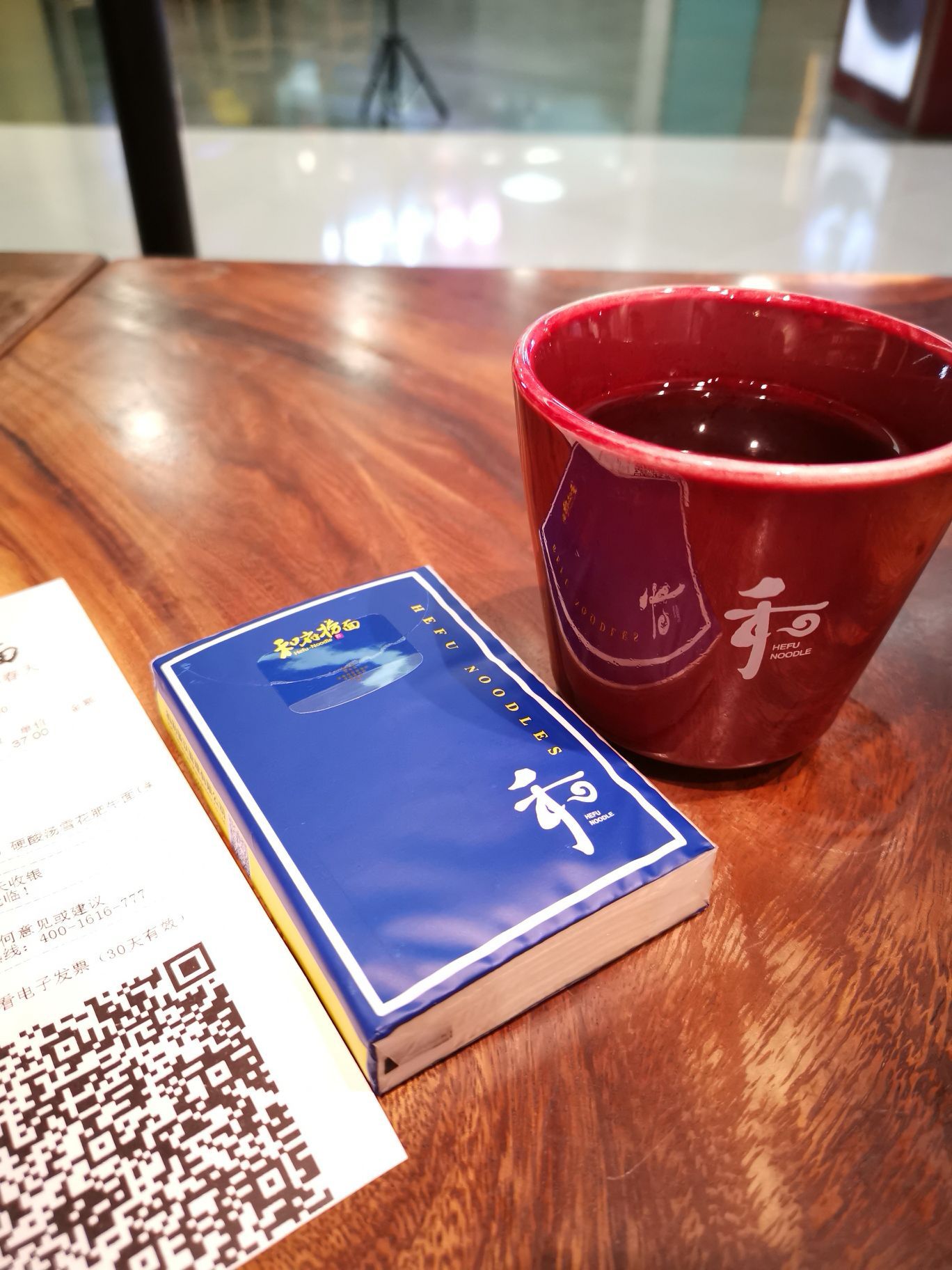 很多餐饮店给人的第一印象很重要,比如这家和府捞面。第一次去的时候就对店家的设计和文化理念颇有好感,感觉吃面也吃出气质来了。 今日上完课,依旧准备吃了午饭回家,不知不觉就来到了这里。网上还有团购,便买了一份,用了两份抵扣,几乎对折了。 酸菜肥牛捞面总体不错,但依我的口味有点偏咸,所以我又自加了一点白开水,吃着可以了。牛肉还不少,面条适量吧,装面的碗够大,对我来说,这份量足够了,看着旁边的年轻人都有要两碗的,于是一张小桌子上放了四个大碗,也有点夸张的哈。 店家有自助的茶水,白开水和花茶,整体氛围依旧喜欢。