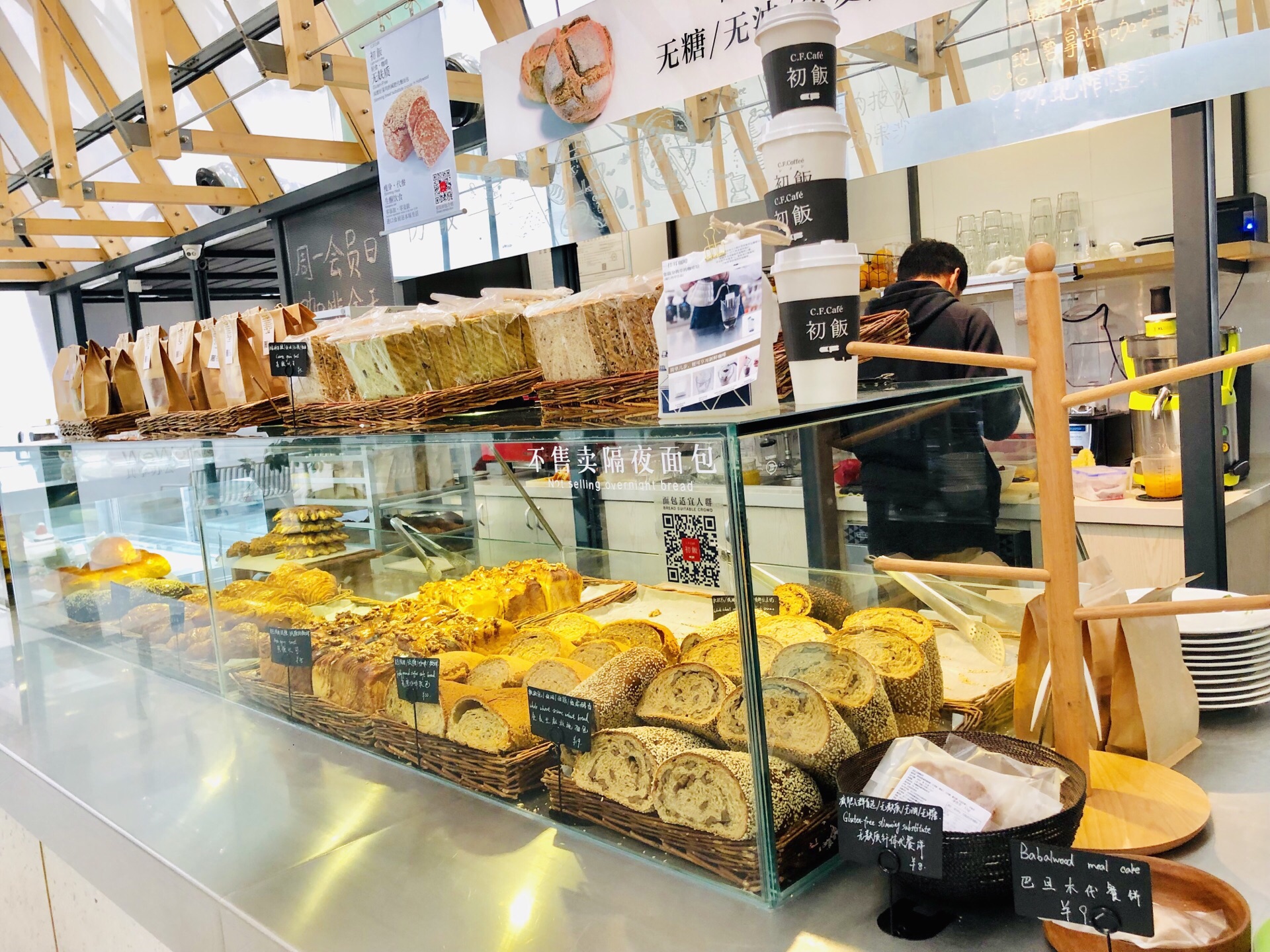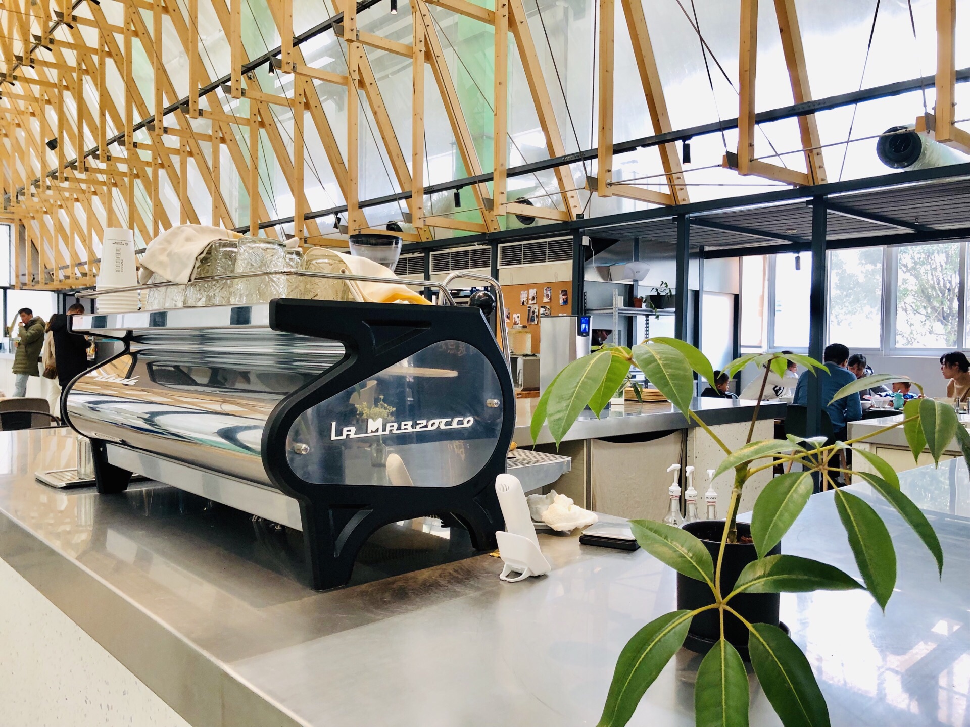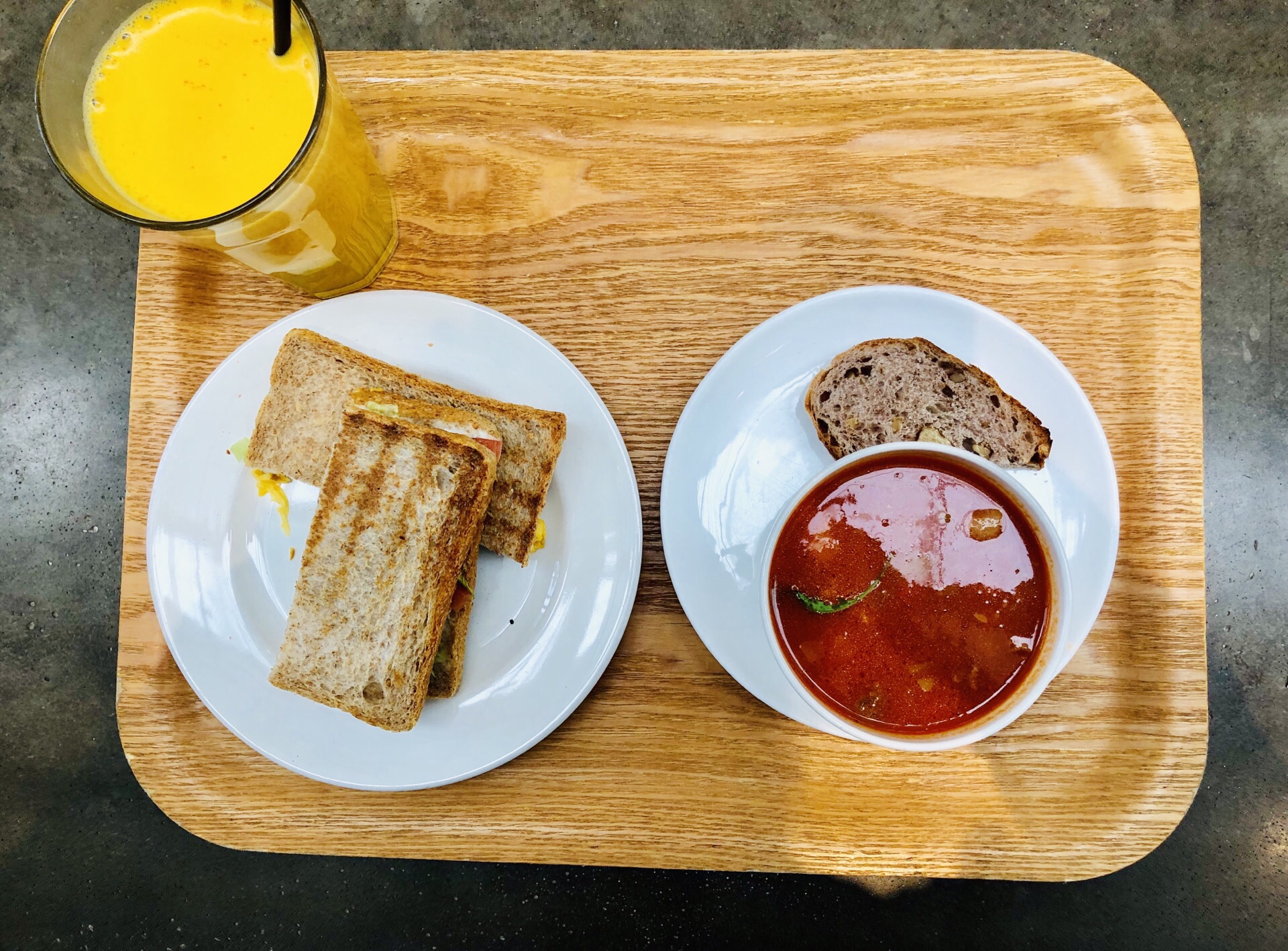 去常州顺便路过打卡,设计很工业化也很简约,灯具挺有特色,轻食类,主打健康食品,色拉、面包、粗粮,人均不算便宜!一杯鲜榨橙汁48元,不过挺甜不会过酸!另外点了个三明治,现做的,里面放了色拉酱、鸡蛋、火腿肉和蔬菜等,口味还不错,有两篇,外部烤过有点脆!再点了一份蔬菜牛肉汤,罗宋汤差不多,番茄蛮浓郁的,牛肉丁也不少,加了其他小蔬菜等,比较开胃!最后来一杯拿铁咖啡消食,吃得比较饱,否则来一块蛋糕直接打开下午茶模式!吃好边上逛一圈,衣服类似乎不是我喜欢的风格,看看就好!