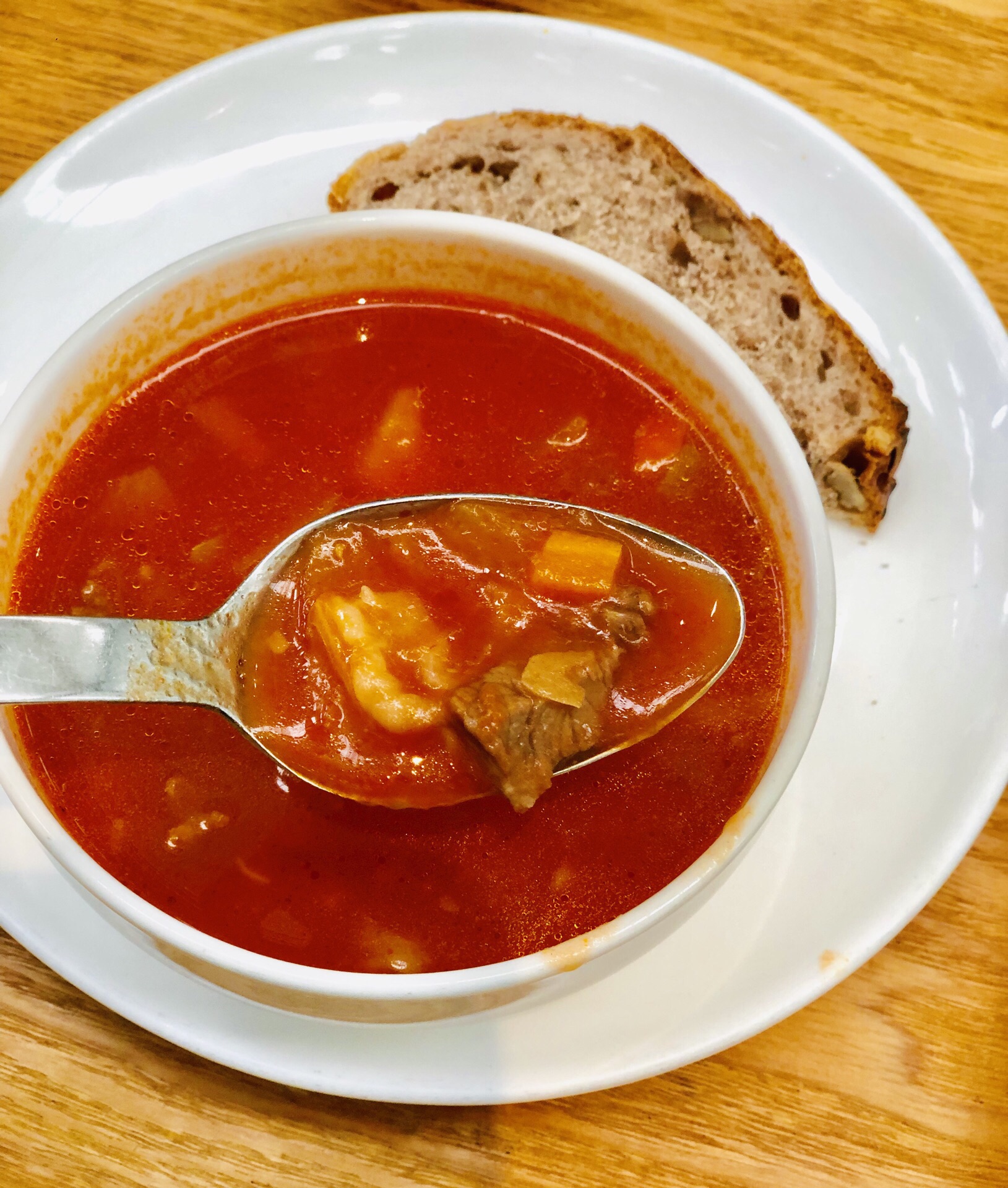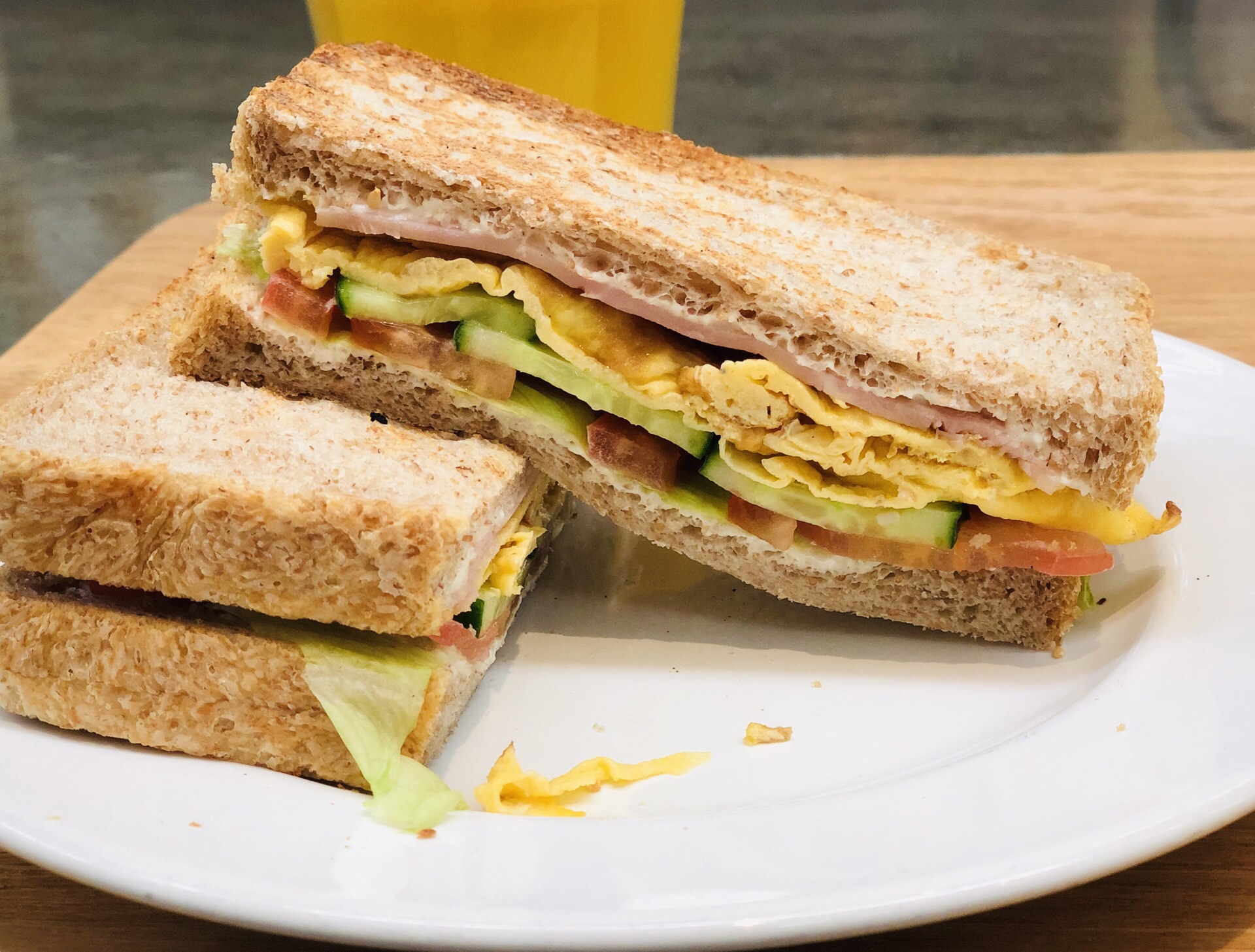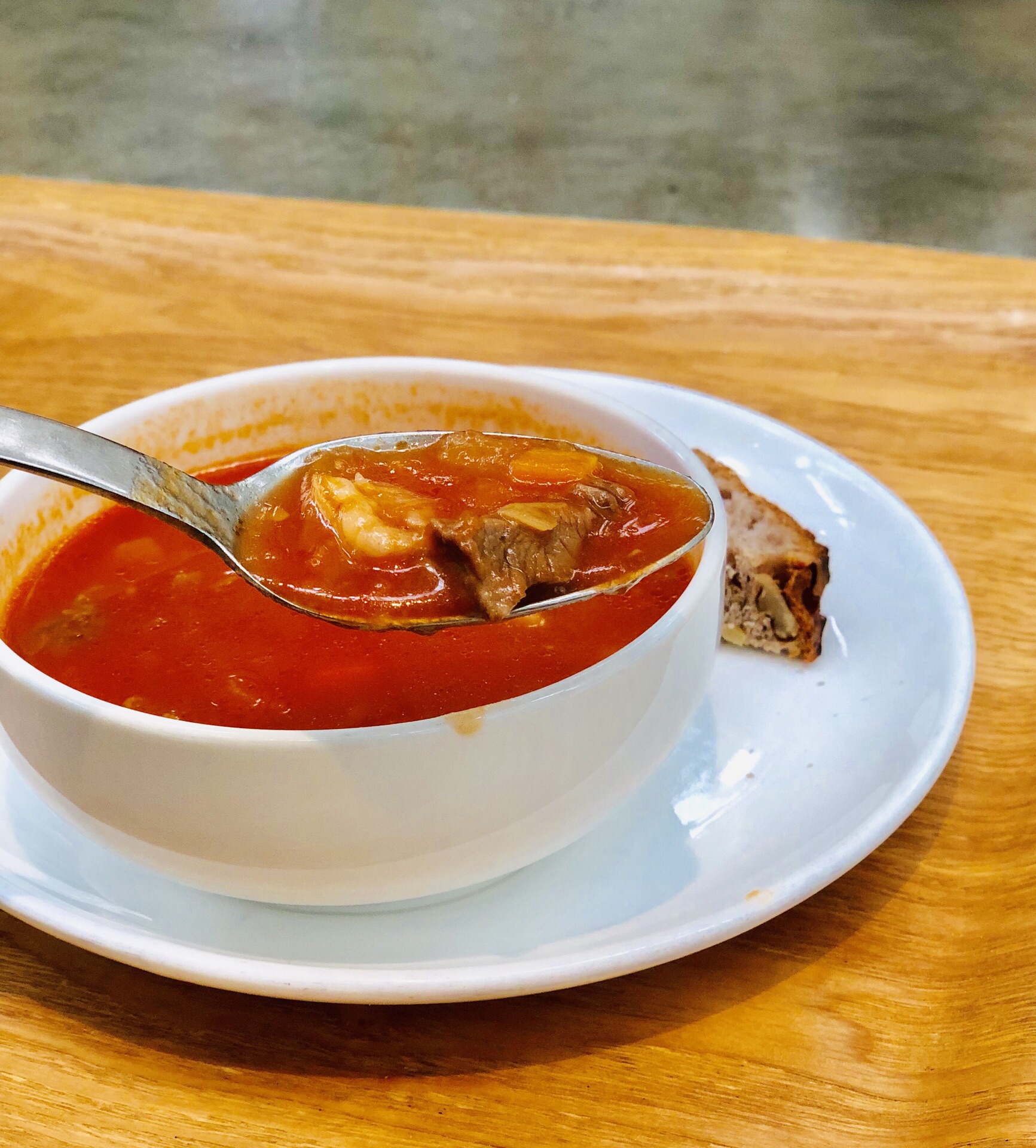 去常州顺便路过打卡,设计很工业化也很简约,灯具挺有特色,轻食类,主打健康食品,色拉、面包、粗粮,人均不算便宜!一杯鲜榨橙汁48元,不过挺甜不会过酸!另外点了个三明治,现做的,里面放了色拉酱、鸡蛋、火腿肉和蔬菜等,口味还不错,有两篇,外部烤过有点脆!再点了一份蔬菜牛肉汤,罗宋汤差不多,番茄蛮浓郁的,牛肉丁也不少,加了其他小蔬菜等,比较开胃!最后来一杯拿铁咖啡消食,吃得比较饱,否则来一块蛋糕直接打开下午茶模式!吃好边上逛一圈,衣服类似乎不是我喜欢的风格,看看就好!