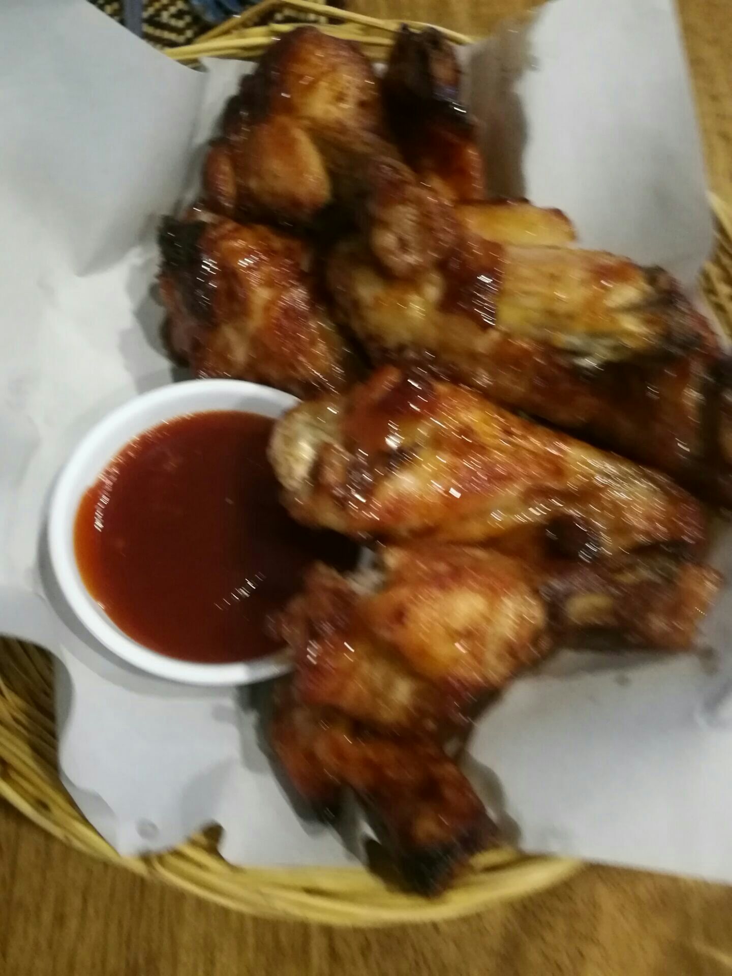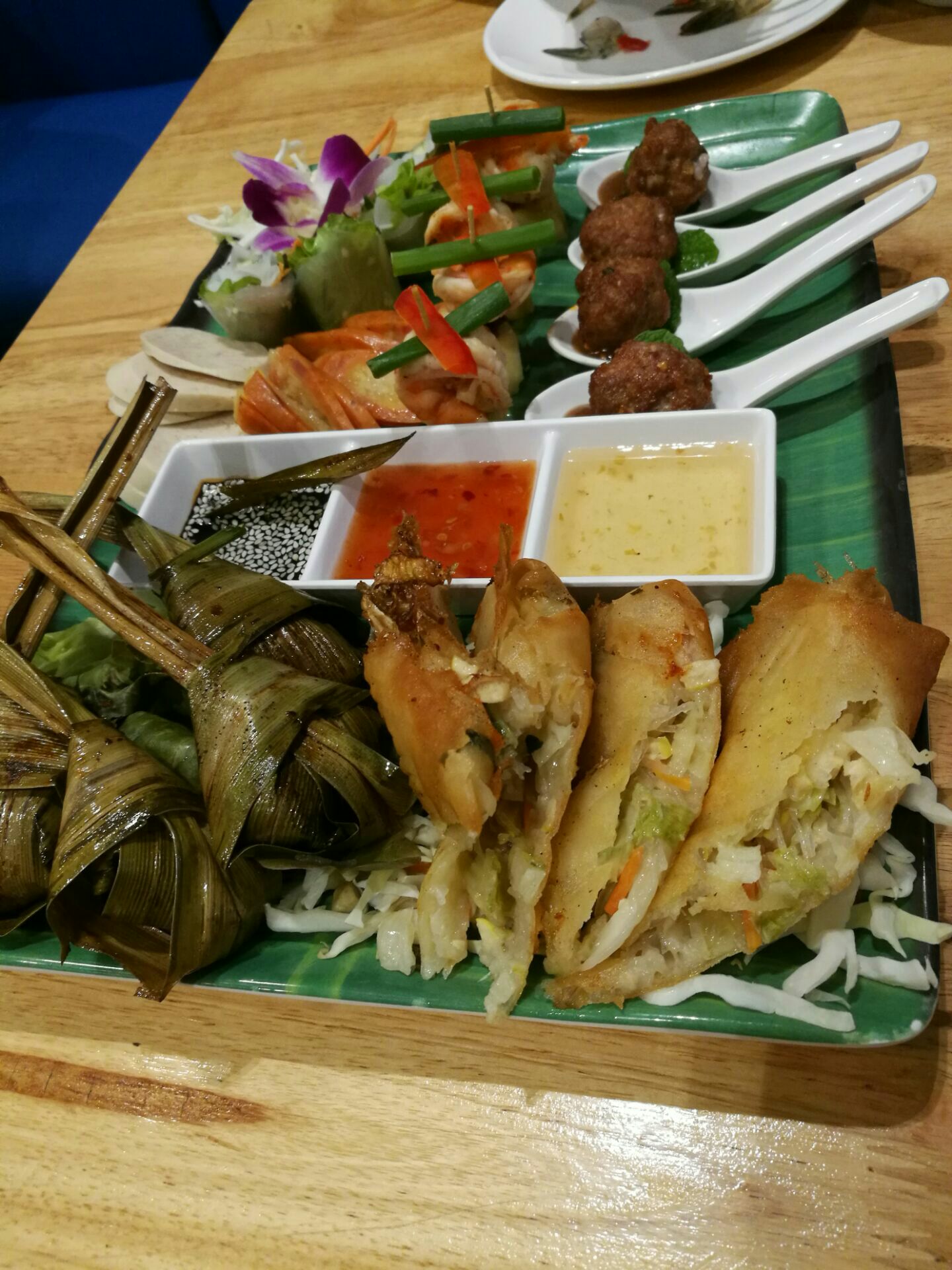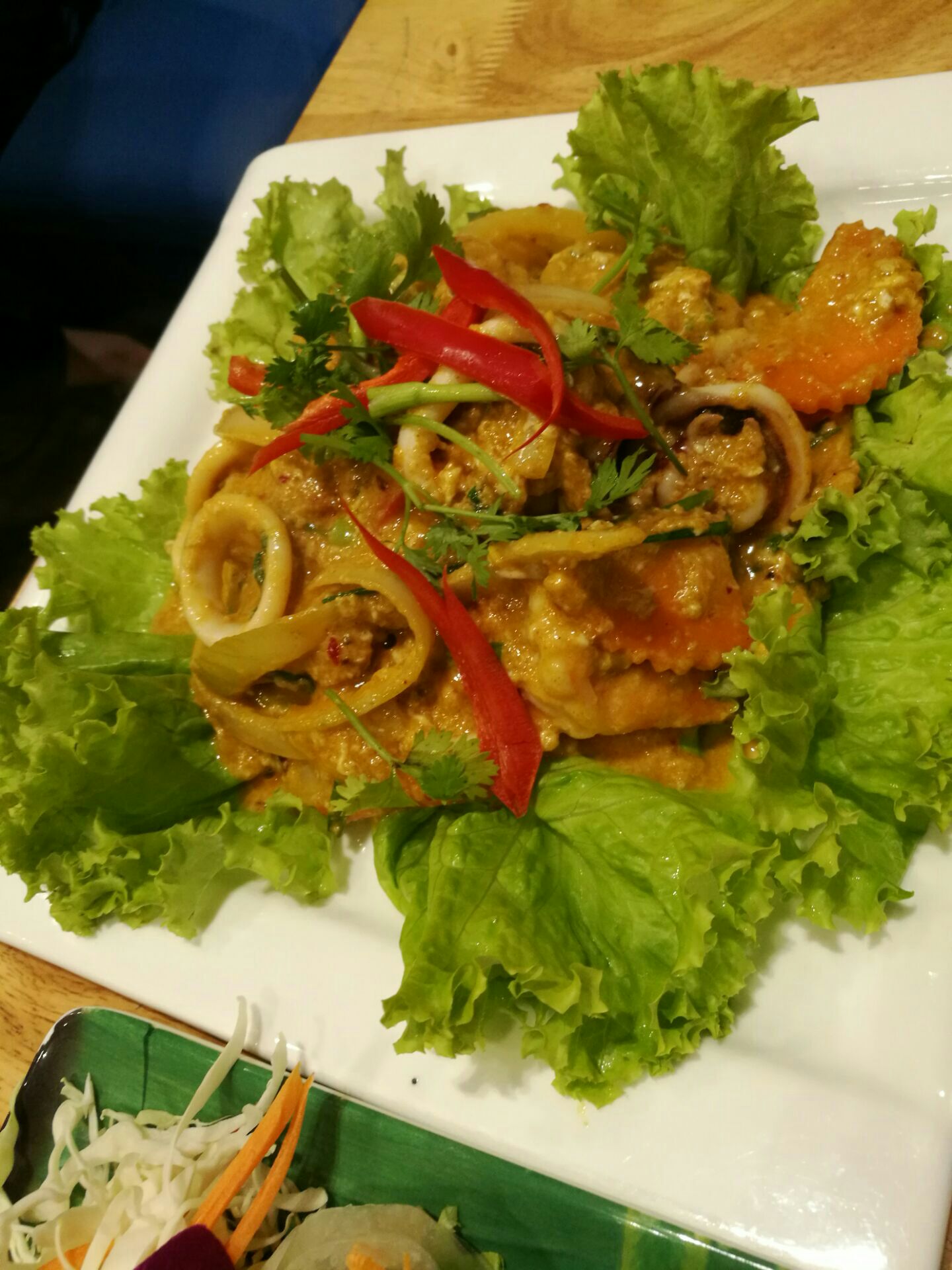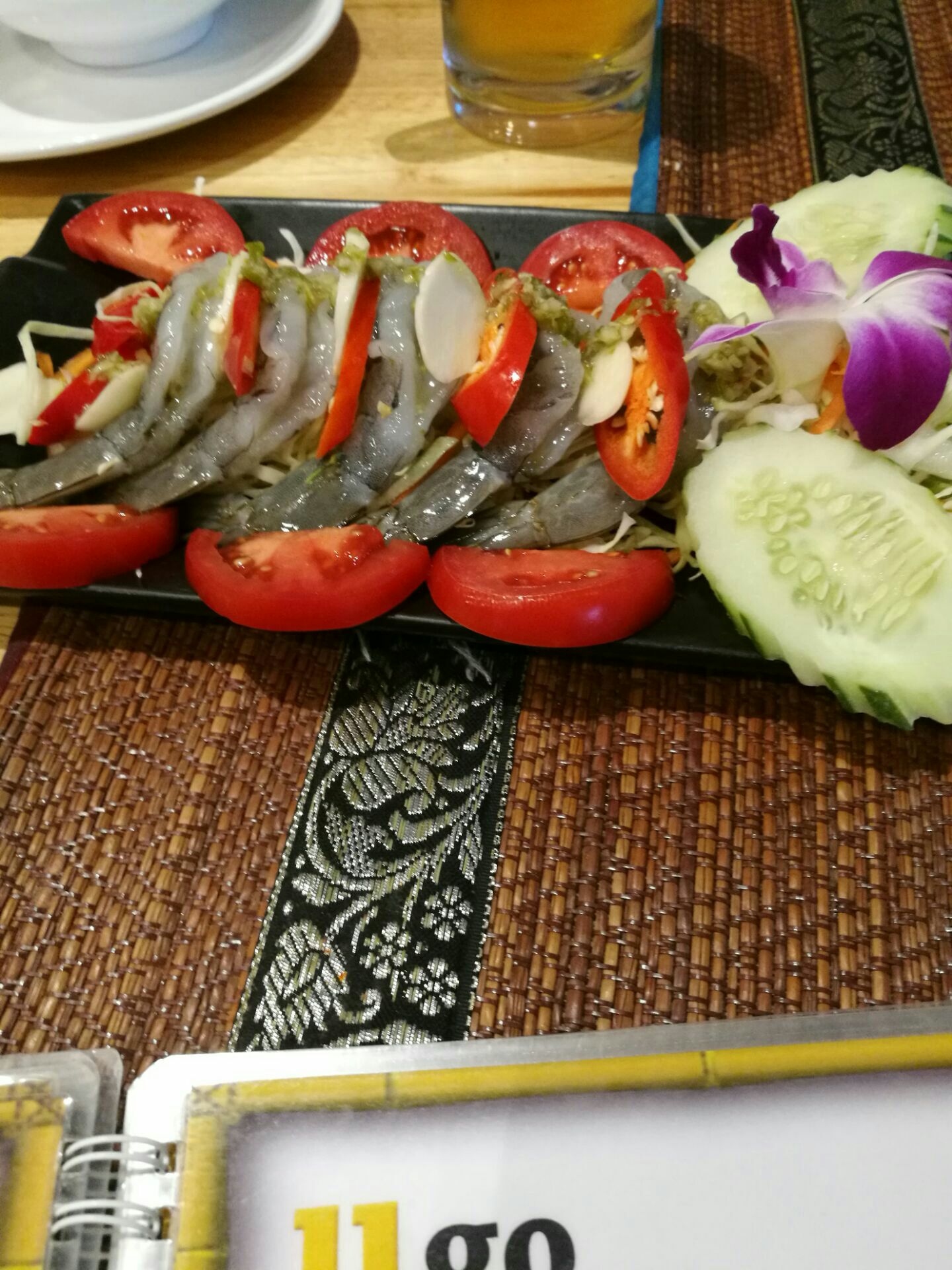 去清迈做攻略的时候就看到这家店,好评多,差评也有,所以没打算去吃饭。参加清迈马拉松,跑步群里有人吃过,在群里强烈推荐,圣诞夜想去的酒吧没去成,直接坐车来到它们家吃饭。点了三个菜,量好大,味道好价钱不贵实惠,2个人吃了有点撑。特别推荐生虾,6个好大的基围虾,125B啊!食材绝对新鲜,老公的最爱。我最喜欢的是咖喱炒大虾,6~7个大大的虾还有好些魷鱼,好像148B,6个烤鸡翅99B。离开清迈的前一天老公说还要再去吃一次。点评上说的小飞虫问题,我也注意到了,第一次是晚上7点左右吃的,有些小虫在飞,第二次是晚上9点过了,一个虫子也没有,店堂很干净也不知道是什么原因。中国游客买单是现金支付的,它们还给打九折。图一的大拼盘可以吃到好多东西。