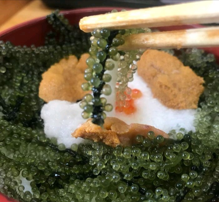 ...藻,拿近看的确像一串串的葡萄,味道嘛也说不清,脆脆的,有点淡,里面的鳗鱼饭也不错,海葡萄挺贵哦海葡萄是冲绳这里特有的一种海藻,拿近看的确像一串串的葡萄,味道嘛也说不清,脆脆的,有点淡,里面的鳗鱼饭也不错,海葡萄挺贵哦。