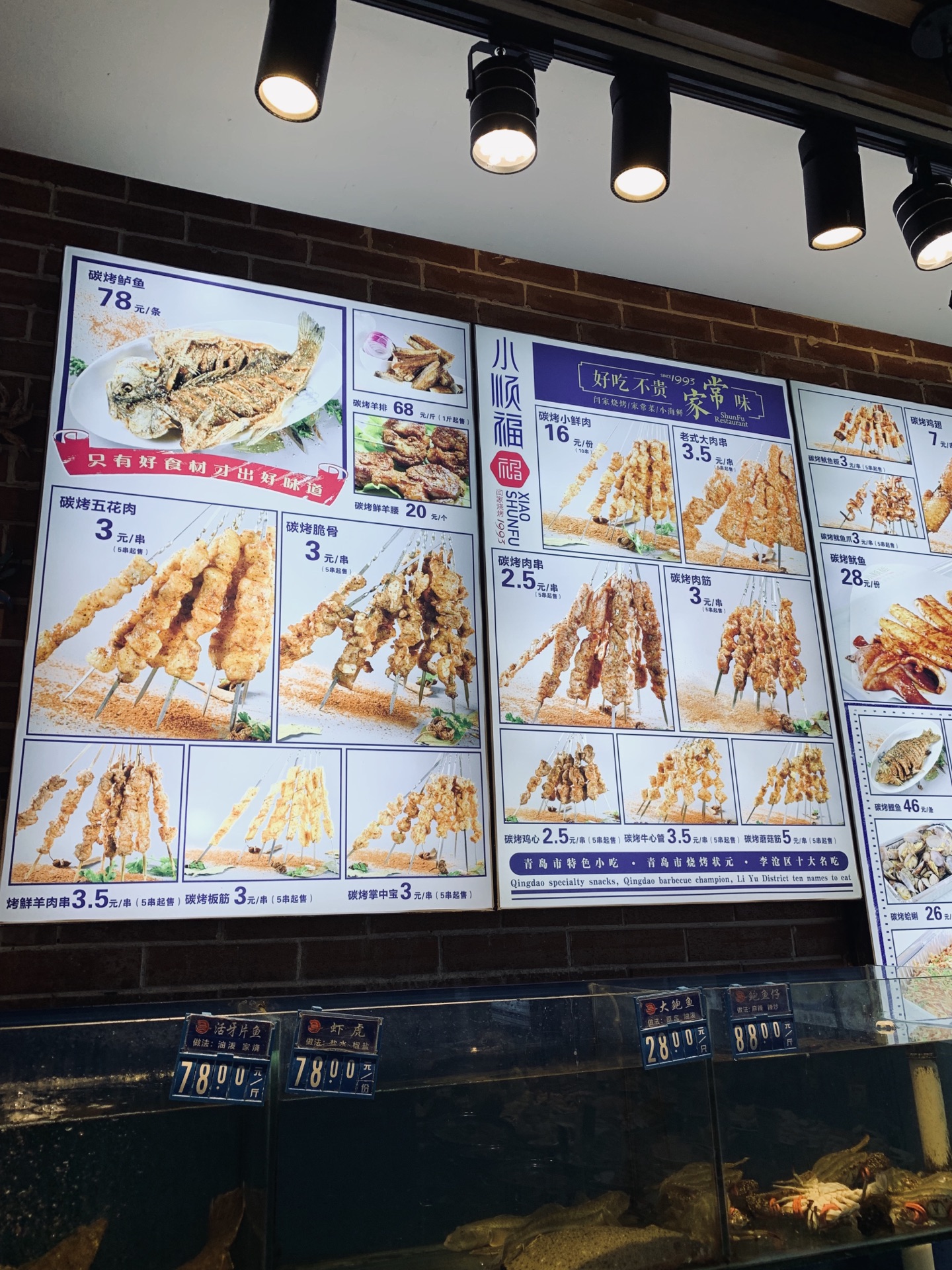 来青岛住在李沧区李村公园附近,朋友带我去吃青岛特色的烧烤。李村公园对面有家小顺福闫家烧烤,烤鲈鱼特别美味,78元。另外点了海米炝芹菜和海鲜小白菜,大烤肉串也很受欢迎,但是我觉得一般。强烈推荐烤鲈鱼!太美味了!