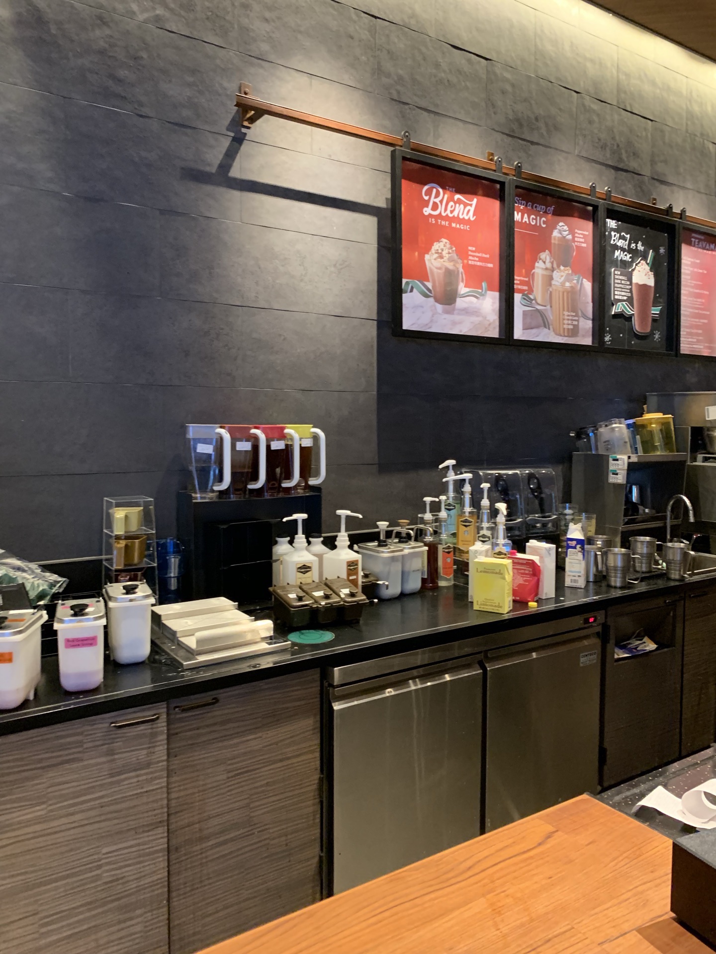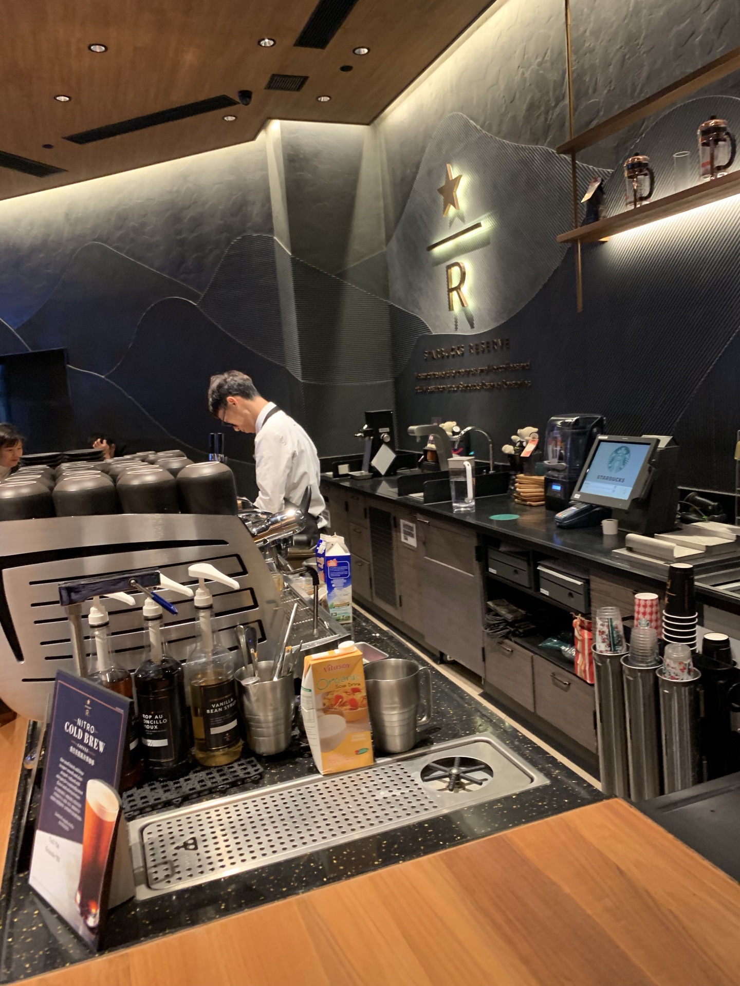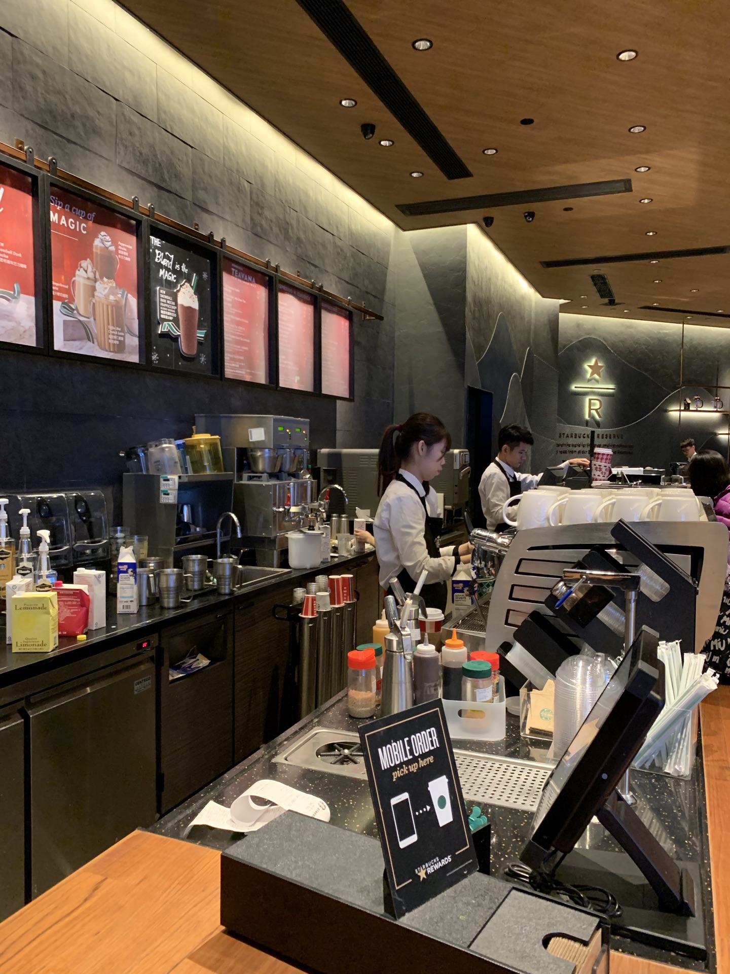 在威尼斯人酒店一楼星巴克喝过几次咖啡。就在帝王点心旁边,对面是家酒吧。这家星巴客人流量蛮大的。我去时还没座位。店员操作很职业熟练。我点了该店推荐的特浓朱古力摩卡,味道似乎有点特别,朱古力特浓,但依然感觉到咖啡的香味,有较强的回味。此外还喝过手冲卡布奇诺,也不错的。