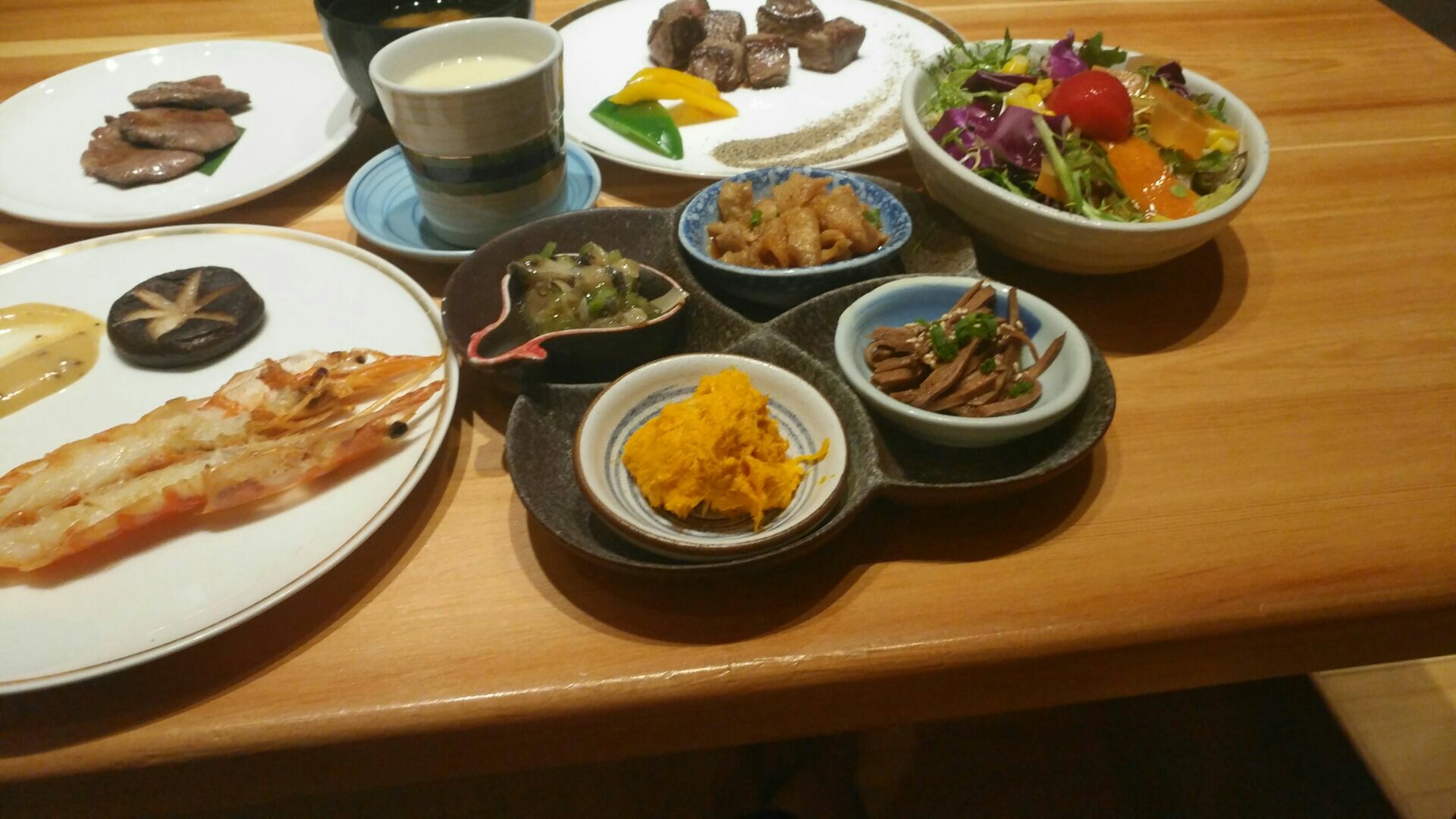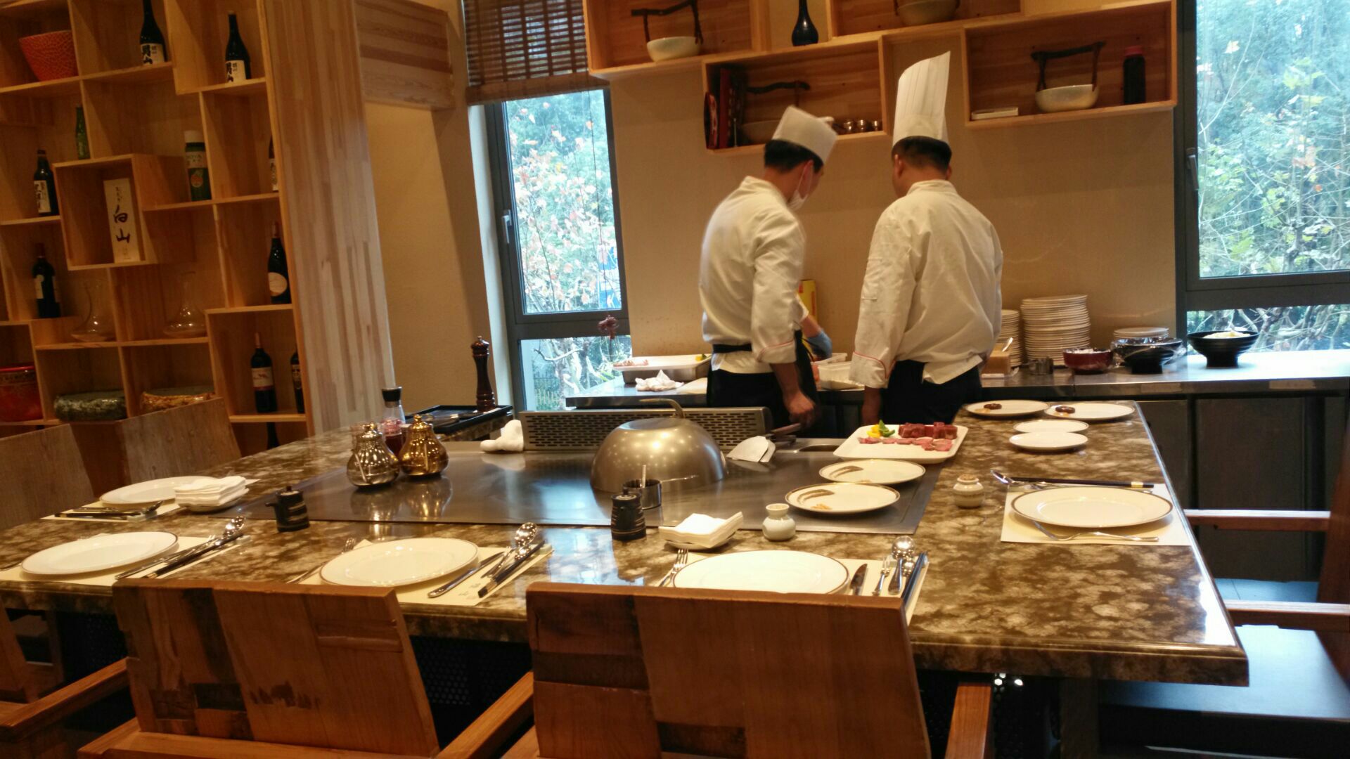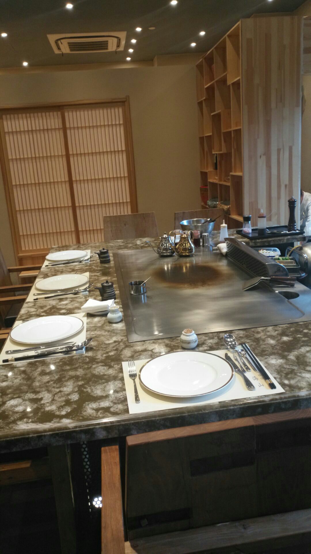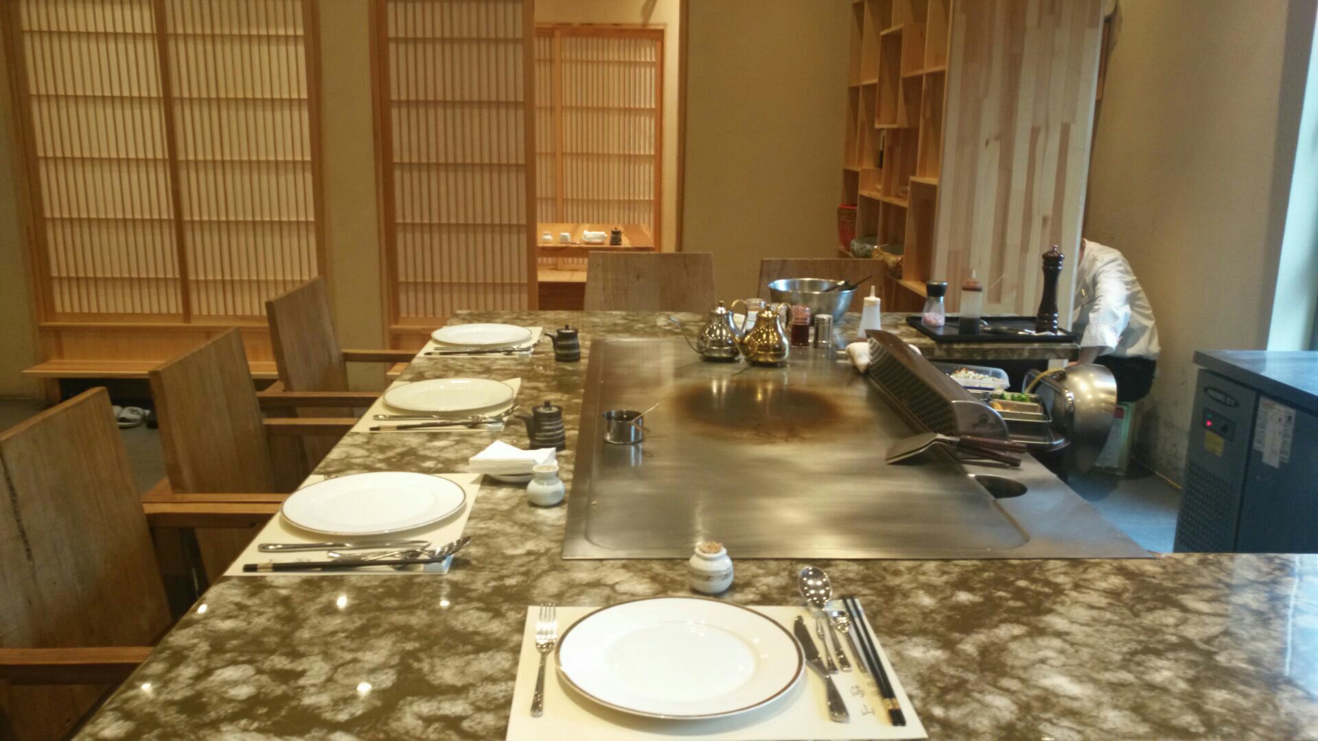 服务挺不错的,榻榻米包间环境挺好挺舒适,大厅能看到主厨铁板料理的过程。主打日料铁板烧,有午市双人套餐,最爱特选黑毛牛肉粒,肉质挺好,虽说量不多,但是肥瘦相见的口感挺好的,个人感觉比特选牛舌好吃。鱼子芥末大虾的色拉蘸酱口感挺好,个头不小,大虾被切成一半,铁板风味也挺好的。铁板炒饭比铁板炒面口感好。日式蒸蛋里有丰富的鸡肉,个人感觉比味噌汤好喝。无农药色拉摆盘不错。自家制蛋糕是乳酪芝士蛋糕,造型像玉子豆腐,乳酪口感好浓郁。