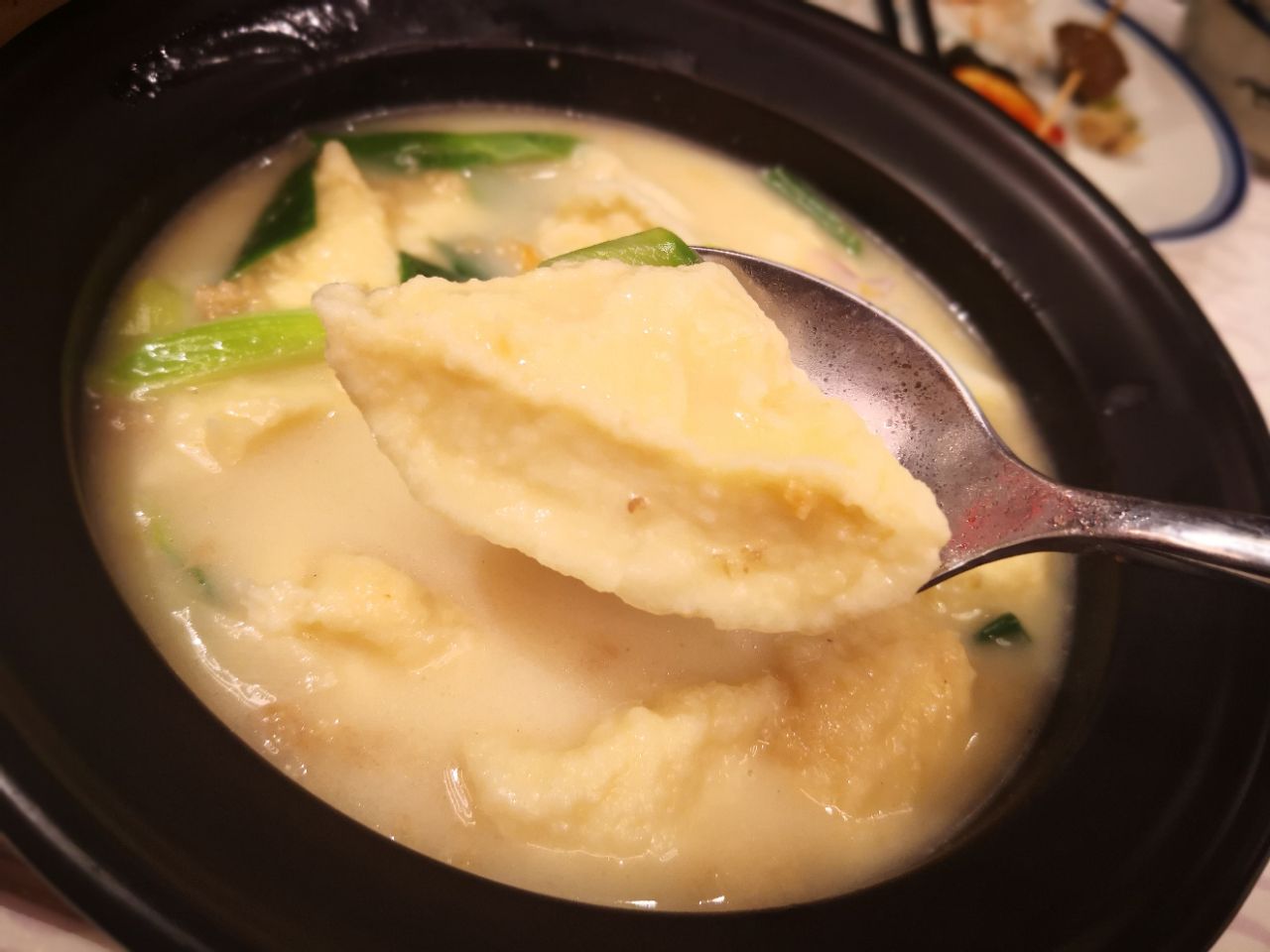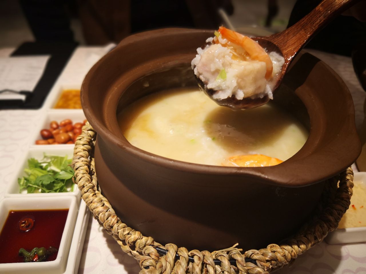 砂锅里有鲜虾,有干贝,有芋头,粥的口感绵密,无比鲜香。不过对我而言,无论是粥还是虾的味道,都正好