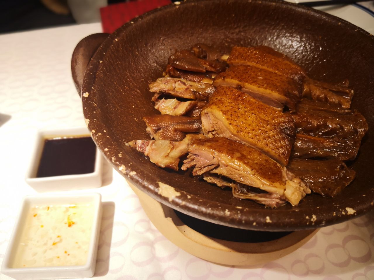 砂锅粥并不是潮汕特有的美食,却是最能表达原汁原味的鲜的一道特色传统美食,入冬的广州,少不了的就是这一碗热腾腾的砂锅粥。如今,潮州人把这种美好的习惯,也带来到汇集世界美食的上海。 家府潮汕菜是一家连锁潮汕菜餐厅,我和家人来品尝各种潮汕美食了。 现在的餐厅都很流行明档后厨,他家则把明档开在了餐厅前面,我们待会要吃的砂锅粥,就是在这里熬煮的。 澄海的狮头鹅名声在外,我们吃的卤鹅三拼,分别是鹅肉、鹅掌和鹅翅。鹅肉皮子油亮,卤汁入味,把鹅肉凑近闻一闻,还能闻到淡淡的卤香味道。鹅肉入口不柴,柔嫩多汁。 烤牛肉串,当这又弹又韧的牛肉丸入口的时候,我的脑海里立即浮现出《食神》里,用牛肉丸当乒乓球打的镜头,相信我,他家的牛肉丸也可以。 普宁干炸粿肉,金黄色的表皮薄脆香,包含着肉末、香菇、马蹄和鲜虾的馅料饱满鲜美,美味可口。 还在吃着这些小食的时候,我们的砂锅粥端上来了。 砂锅里有鲜虾,有干贝,有芋头,粥的口感绵密,无比鲜香。 随粥搭配四碟配料,香菜和花生可以直接倒入粥内搅拌后一起食用;辣油碟是蘸虾的,黄豆酱是增加砂锅粥味道的;不过对我而言,无论是粥还是虾的味道,都正好。 浓汤焖普宁豆腐 我从汤里捞出了干贝和干虾仁,所以它的汤也是极鲜的。这道焖豆腐的正确吃法,就是盛一碗汤,拣一块豆腐,浸满了汤汁的普宁豆腐,柔嫩又美味。 猪油渣炒菜心 吃到最后,吃点清爽的蔬菜润润肠。 天越来越冷了,来喝碗砂锅粥暖暖吧~