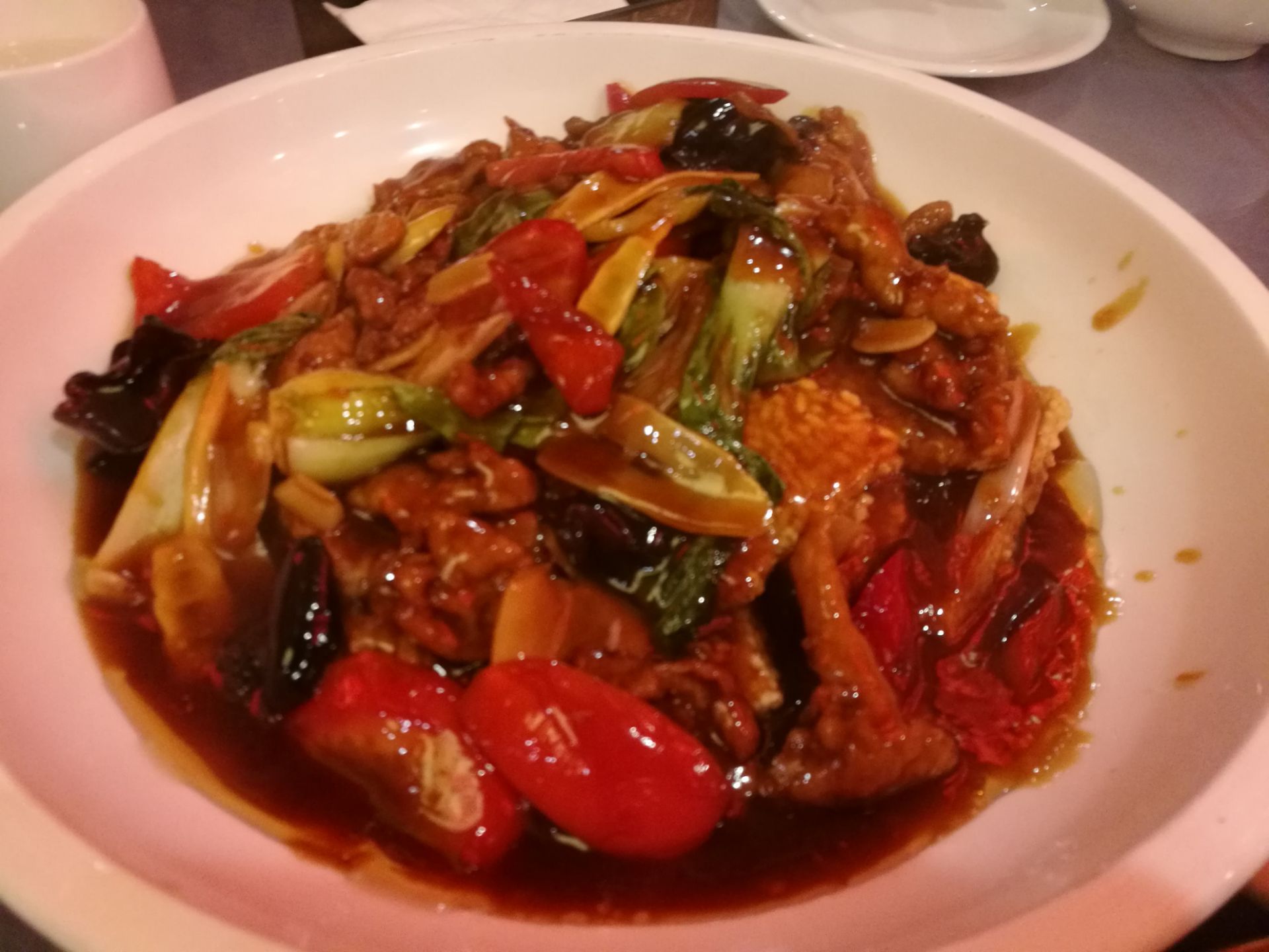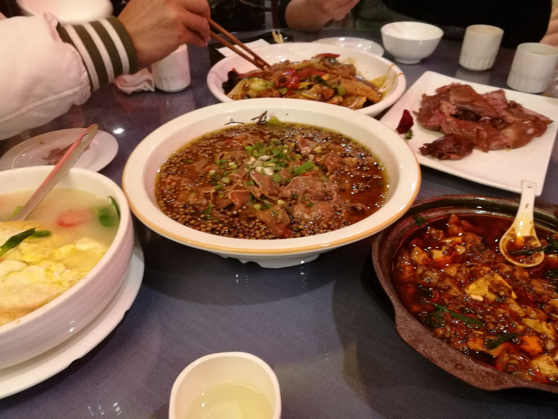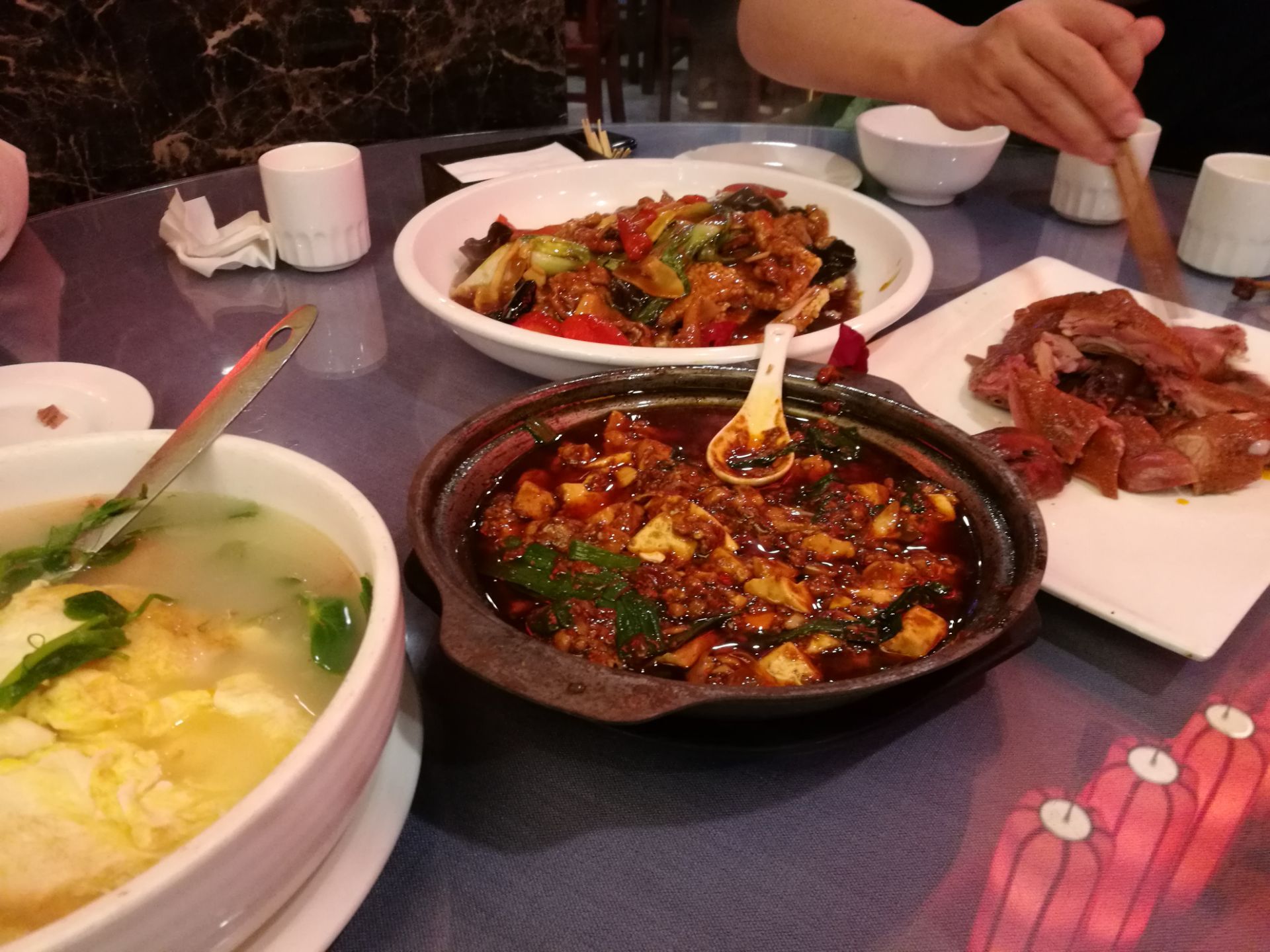 和朋友一起玩到了晚餐时间也不知道吃什么合适,朋友推荐附近的这家。由于朋友来过几次,菜都是朋友点的。 [环境]毕竟是名小吃的分店,装修还是可以的,大红灯笼高高挂。我们坐的一楼,楼上应该也有座位。 [服务]服务员动作还是很麻利的。 麻婆豆腐味道很好,毕竟是招牌菜。 舌尖上的味道其实是椒麻的猪舌,很麻辣入味,很下饭。 锅巴肉片有点偏甜,就是所谓的荔枝味吧。 樟茶鸭还可以吧,印象不深。 总体来说还是不错的一家店,可以去吃一吃的。