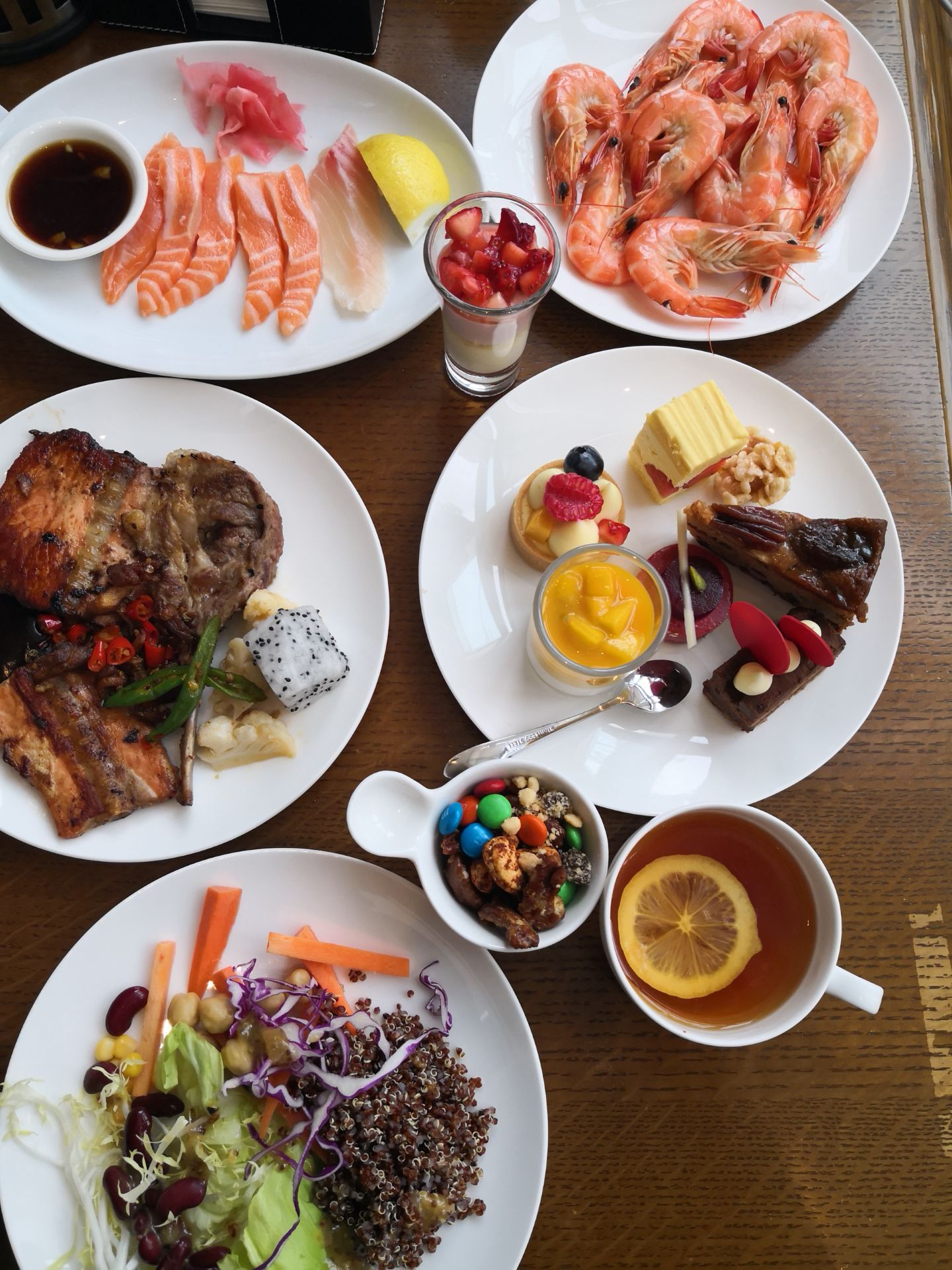 2018年马上要过完的时候 小伙伴邀约一起庆祝 在一起梳理了一年遇到的事情 有解决的,有没有解决的 然后就是敞开肚儿吃 这家的环境很好,吃饭的当天下雪,我们在温暖的室内吃着自助餐,窗外飘着雪花,感觉特别棒啊。 最喜欢靠窗的位置,虽然拿菜有点远,但是多走走益于消化,美食塞的更多哦哈哈哈,除了大厅的位置,还有相对安静的卡座,走的中国传统风格。适合不同年龄段的朋友。 这家店我觉得最有特色的就是甜品,第一盘和最后一盘都是甜品,且都吃了。海鲜除了虾,我推荐煎三文鱼鱼排,很好吃。 服务很不错,茶饮和咖啡是告知工作人员会给你主动端上,如果快到结束时间会有人细声细气的提醒你,就算菜品供应时间到了,只要你没有离开,服务不会减少,也不会来催促你离开。 非常好的朋友聚会的地方。