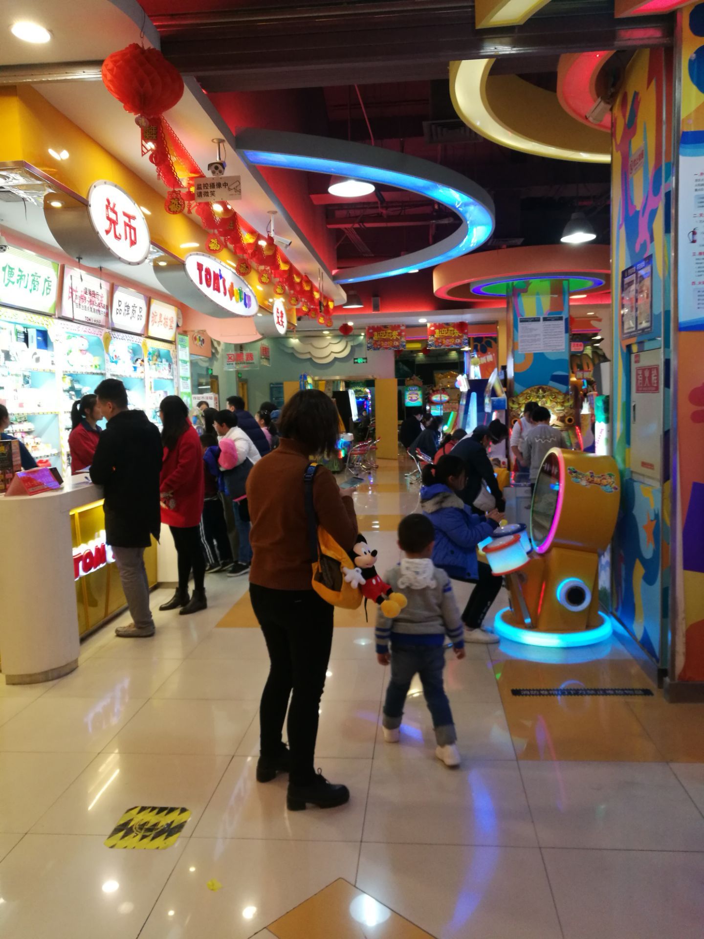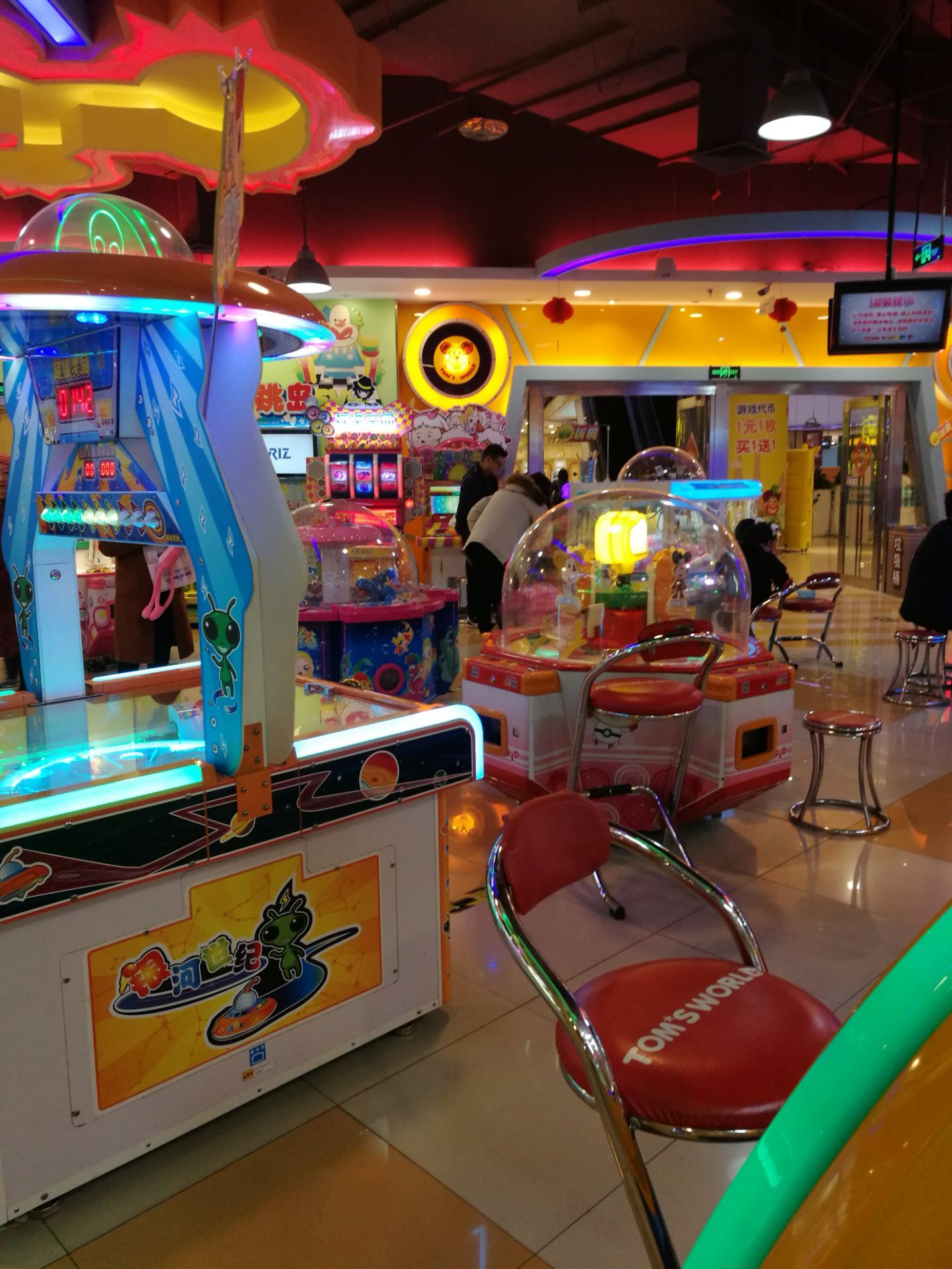 在财富又一城逛街买了一件衣服,店员告之可以到一楼抽奖。抽了30个游戏币,服务台说可以到四楼或负一楼游戏厅使用。四楼的汤姆熊游戏厅还比较大,门面也很显眼。打游戏的人也特别多,夹娃娃的机器爪子很松根本夹不到。其他的游戏也不好玩,30个游戏币没有用完就想走了。
