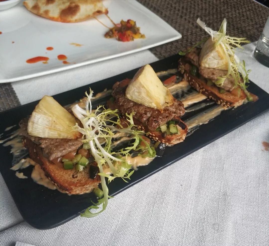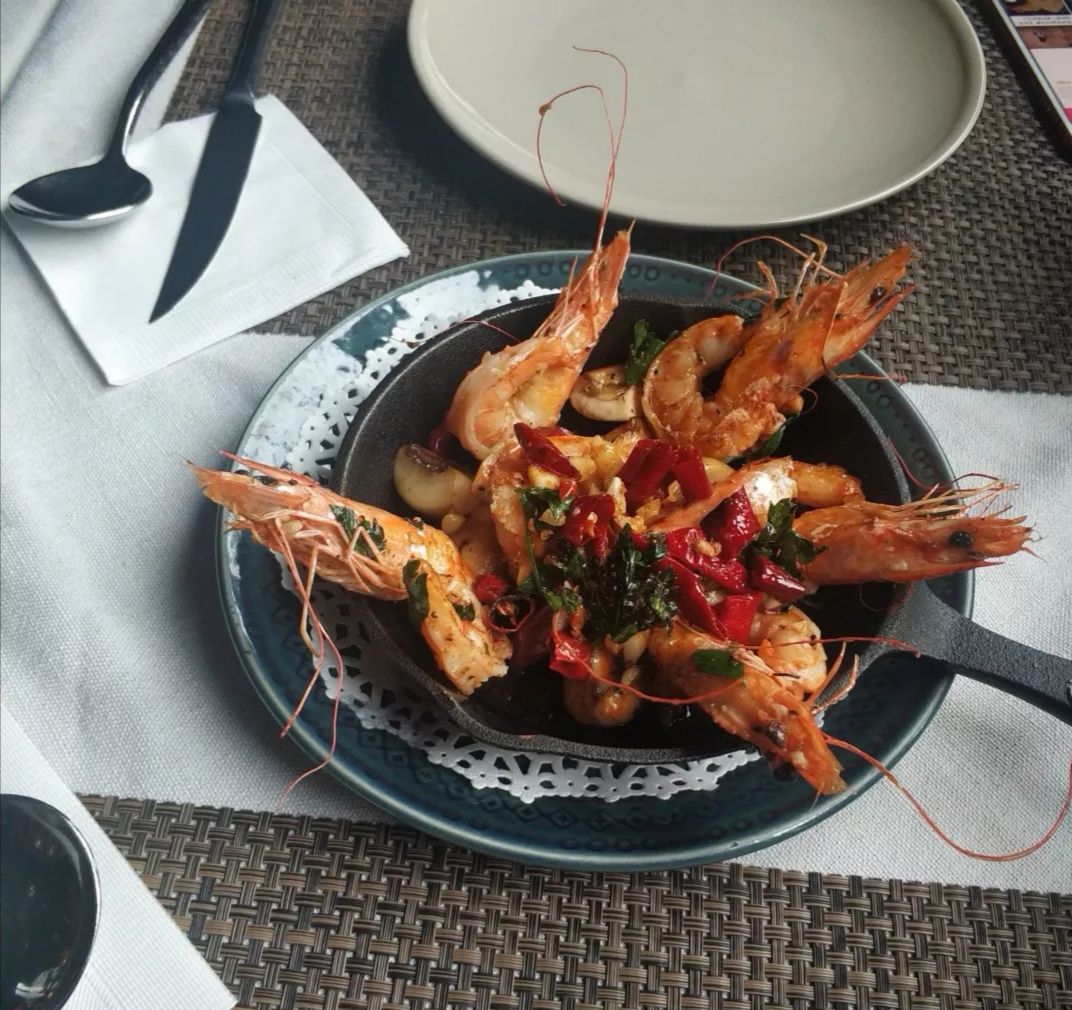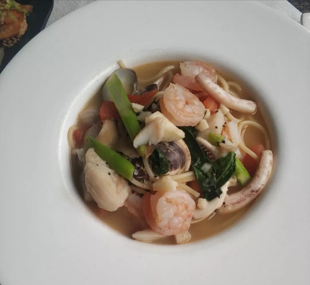 西班牙蒜辣虾,有点小辣,好像有六只虾,下面还有些蘑菇,味道挺赞的,五星推荐。 鸡肉芝士薄饼,薄饼有很多种內馅,牛肉,鸡肉,加芝士,加奶酪,芝士很好吃,味道很棒。 海鲜鱿鱼意大利面,里面海鲜很多,小小的一盘,料还挺足,味道好,比较清淡。