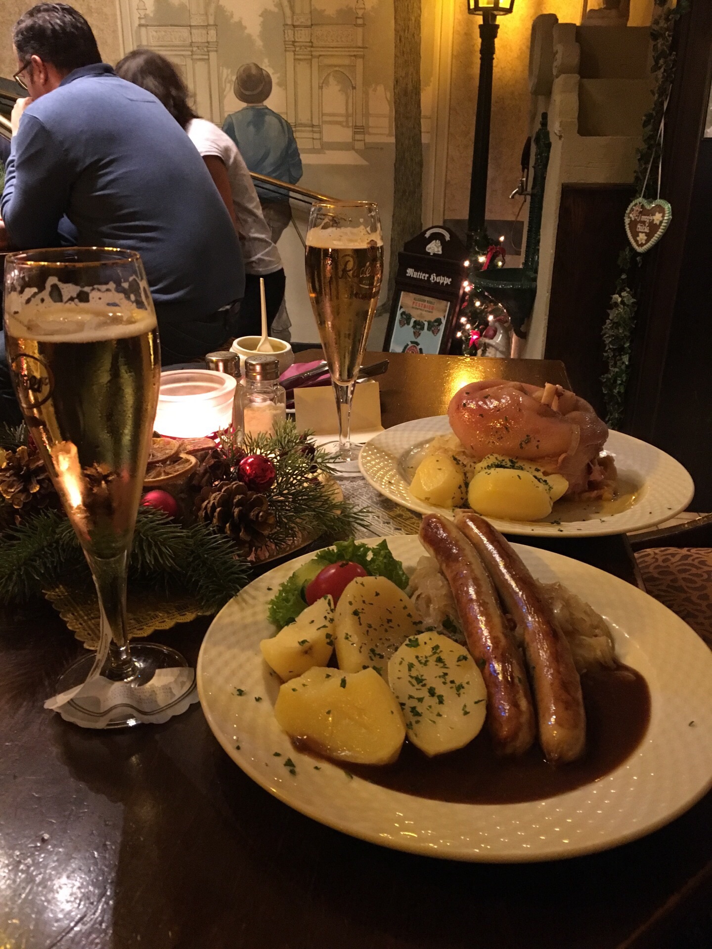 这家的水煮猪蹄非常非常棒,分量很大,个人觉得比烤的好吃,里面的酸菜也让人惊喜。还点了一份香肠,正常水准。啤酒也很不错。两人一共花费40欧不到,吃的很撑很满意。另外地理位置也很方便,就在电视塔附近,步行15分钟。装修非常精致,服务态度就很正常。听说是非常正宗历史悠久的餐厅,基本都是当地人,很火爆。不会德语,用英语交流,没有遇到评论里说的服务态度不好的问题,也不需要给小费,可能和个别员工有关吧。建议提前预定,我们没预约只能坐在吧台位置,并且有时间限制,幸好上菜很快。