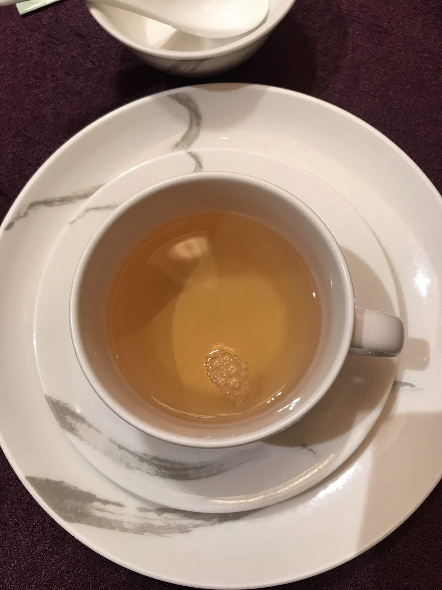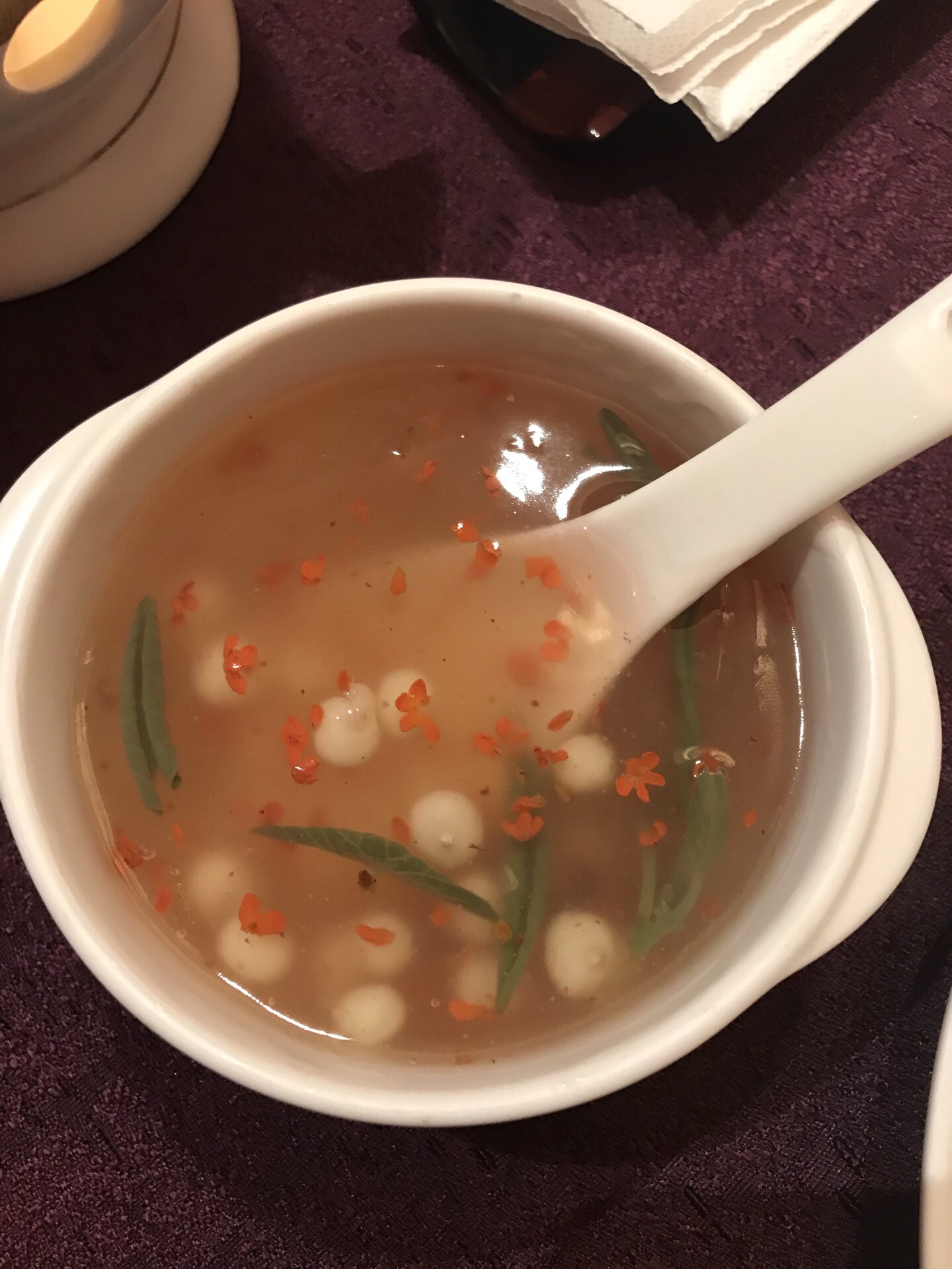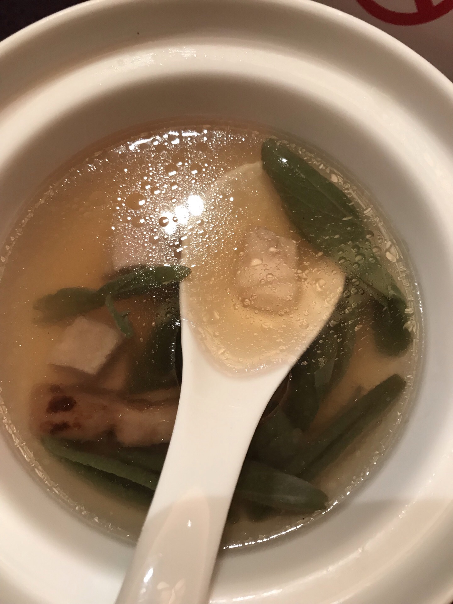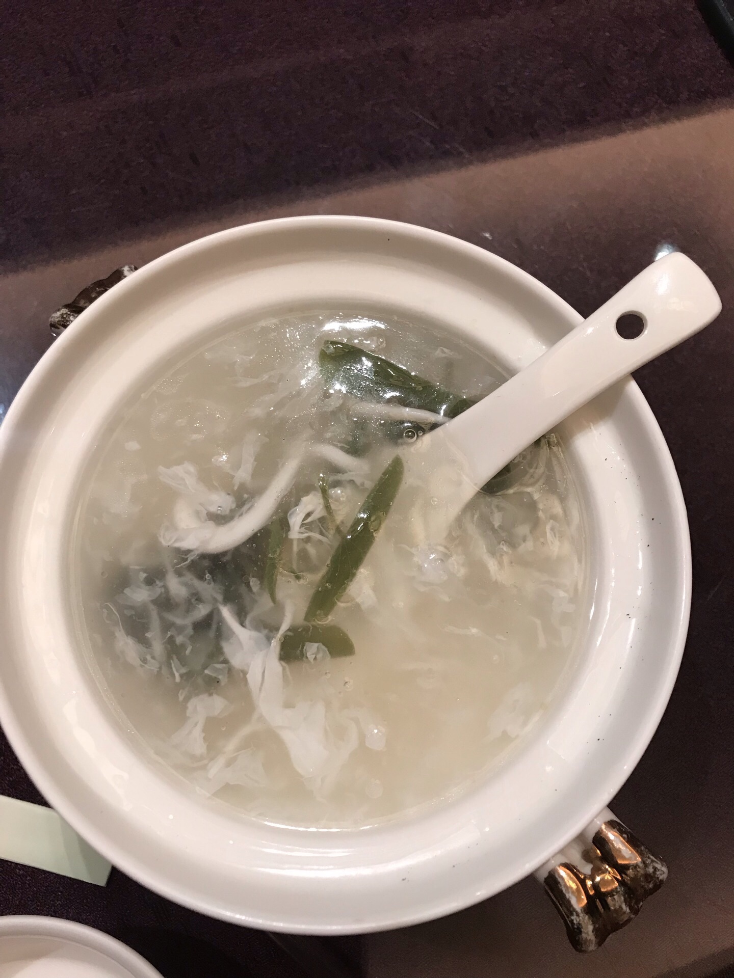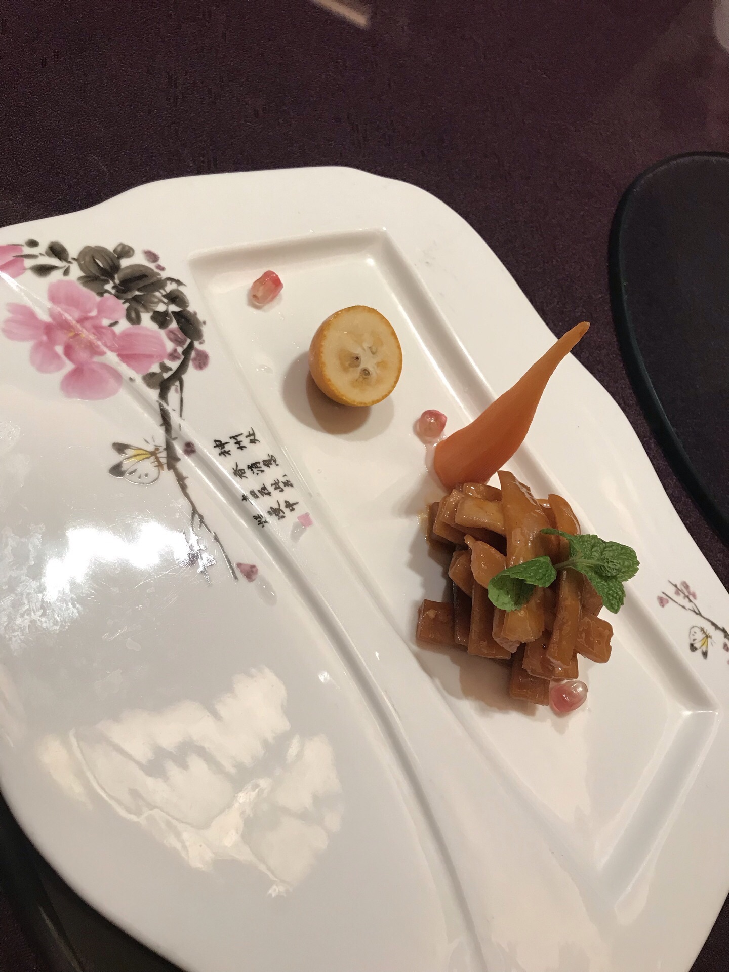 周围有农家乐一样的饭店,但环境欠缺,想想还是在酒店里吃吧!晚上六点还要等位,生意倒是不错嘛。包房有低销,150元/人,先生二话不说便拉我进了包房,可是大概很久没人使用,房间里一股味道很难闻,空调也热的很慢,非常冷。一般酒店点菜150一个人点不人几个菜就超过了呀,这里菜倒是不贵,我们还得凑凑数呢!巴特……菜真的是太失水准了,尤其是什么松茸土鸡汤,简直就是个笑话,堪比刷锅水。大概就一个甜品藕粉莼菜小圆子还不错,其他都不好吃。