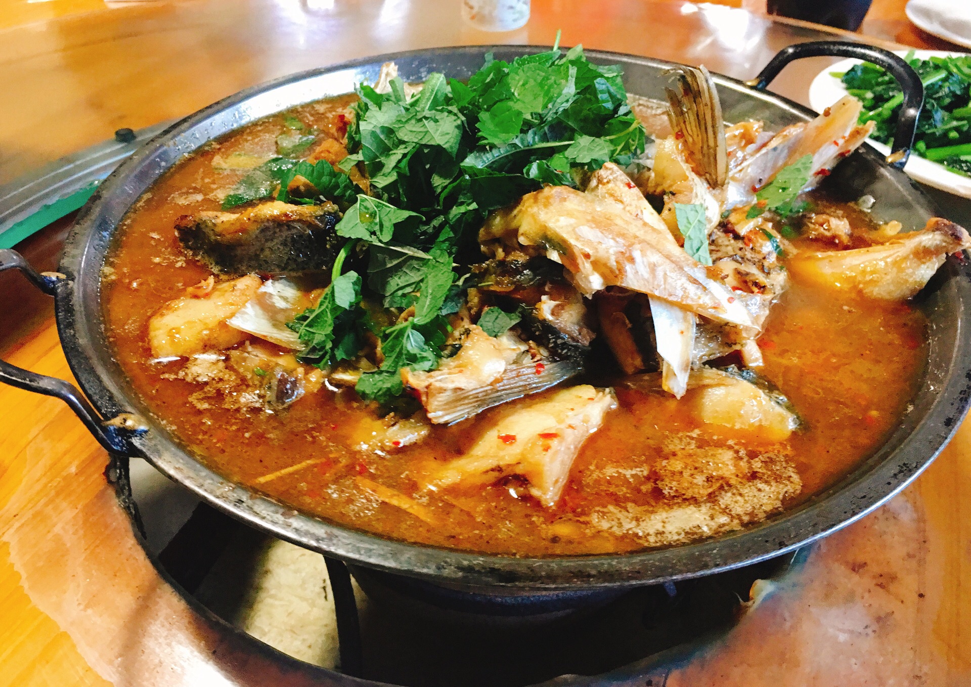 丽水遂昌真是个好地方,不仅风光秀美,而且美食也众多,吃了几顿农家菜,每餐都让人念念不忘, 几乎每餐都会有鱼,不同的鱼不同做法,有油炸野生溪鱼、红烧石斑鱼,还有各色鱼汤 今晚又在焦滩鱼头街上品尝到了当地较有名的老肖焦滩鱼头馆的鱼头锅, 炭火炖煮的锅里放着现切的鱼头和鱼块,慢火炖煮,原汁原味, 对于平日就偏爱甜食糯米类的我来说,这一餐更令我回味的可能是那一块块绿色小点,据同桌的当地小伙伴介绍,这是用丝瓜汁做成的点心,是当地特有的做法。