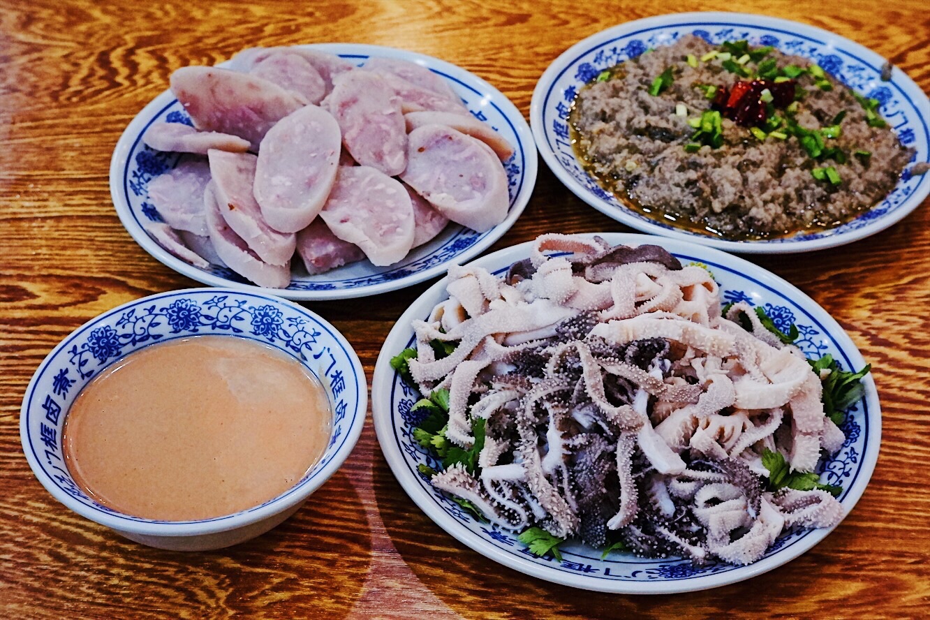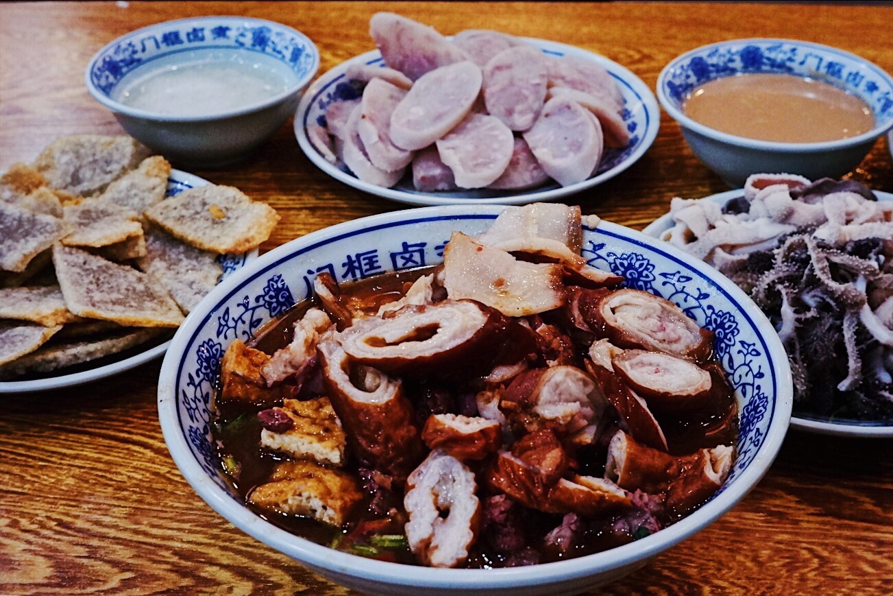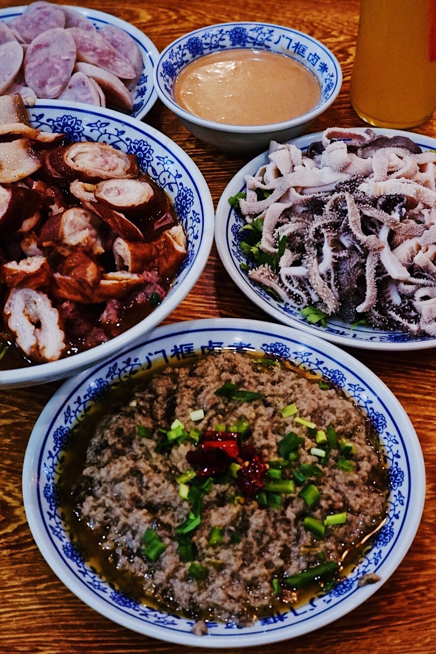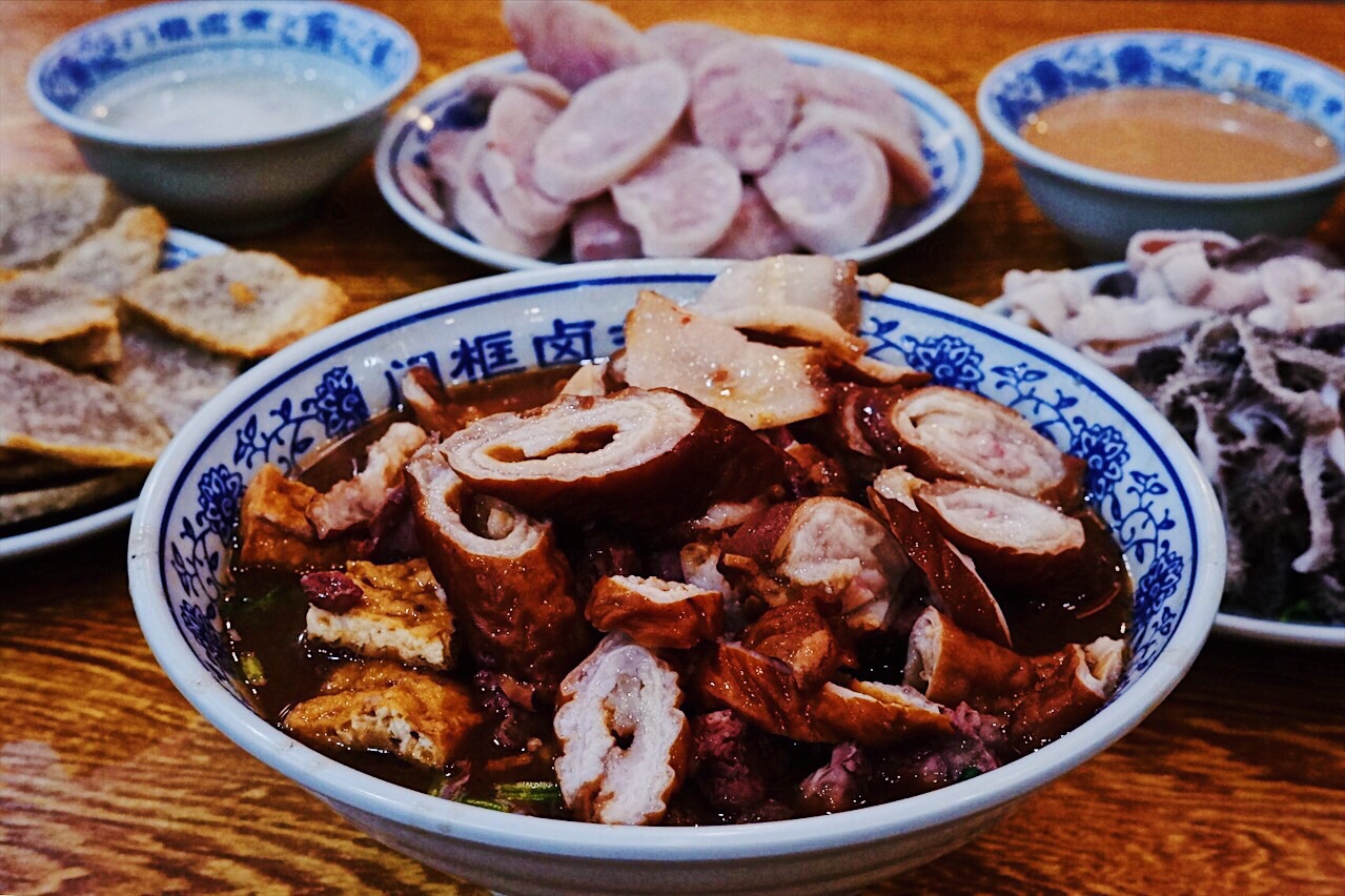 声名鹊起的北京传统特色小吃连锁品牌门框胡同,接地气的京味大乱炖荣登2018必吃榜,就好比西安闻名遐迩的子午路张记肉夹馍和魏家凉皮。 明厨亮灶充满了人间烟火气息,亲眼目睹一大锅卤煮火烧热气蒸腾咕嘟咕嘟,肠肺豆干火烧分门别类堆放文火慢炖,小哥顺手从锅里即取即用切分装盘驾轻就熟。 店里常客熟门熟路点上一份精品卤煮便可裹腹,菜底可加肠加肺加豆腐加火烧,吃着舒坦闻着销魂浓郁酱汁充分入味,卤汁、蒜汁、酱豆腐汁、香菜等辅料,使得火烧透而不黏肉烂而不糟,厚重回味就如同这座城市的记忆般余韵悠长。 ✨老北京粉肠✨原汁原味实在有点接受无能,还是✨老北京炸灌肠✨酥脆适口老少咸宜,✨老北京麻豆腐✨绿油油烂糊糊,透着椒香麻辣后劲十足,✨老北京爆肚✨吃完以后肚子有点不太舒服。