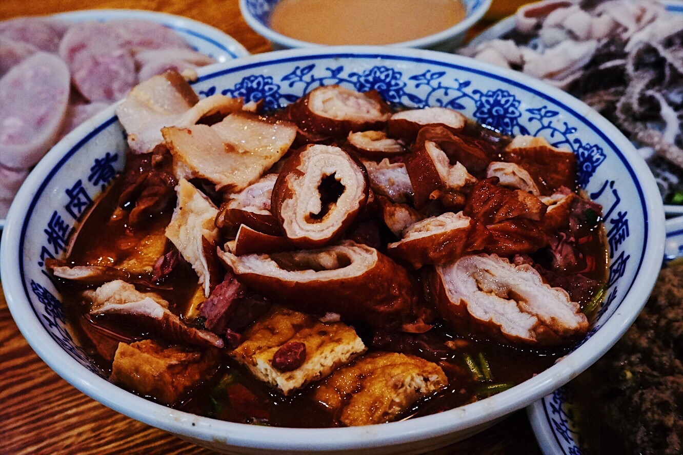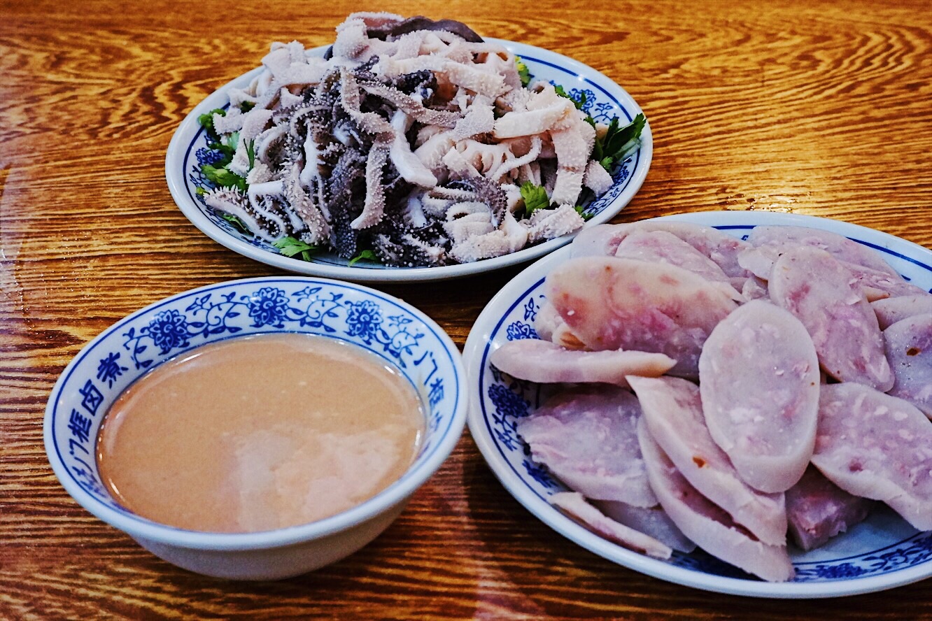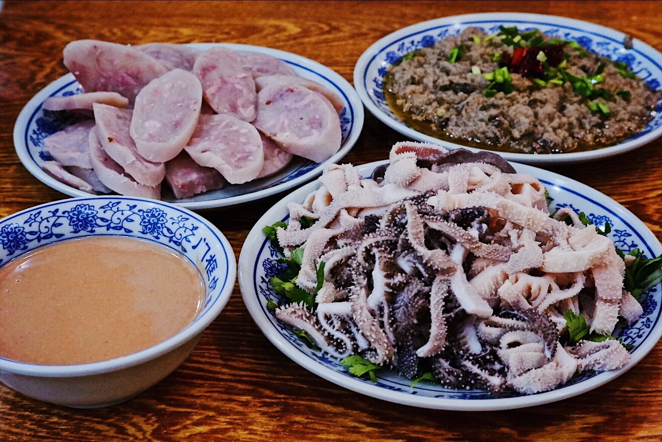 声名鹊起的北京传统特色小吃连锁品牌门框胡同,接地气的京味大乱炖荣登2018必吃榜,就好比西安闻名遐迩的子午路张记肉夹馍和魏家凉皮。 明厨亮灶充满了人间烟火气息,亲眼目睹一大锅卤煮火烧热气蒸腾咕嘟咕嘟,肠肺豆干火烧分门别类堆放文火慢炖,小哥顺手从锅里即取即用切分装盘驾轻就熟。 店里常客熟门熟路点上一份精品卤煮便可裹腹,菜底可加肠加肺加豆腐加火烧,吃着舒坦闻着销魂浓郁酱汁充分入味,卤汁、蒜汁、酱豆腐汁、香菜等辅料,使得火烧透而不黏肉烂而不糟,厚重回味就如同这座城市的记忆般余韵悠长。 ✨老北京粉肠✨原汁原味实在有点接受无能,还是✨老北京炸灌肠✨酥脆适口老少咸宜,✨老北京麻豆腐✨绿油油烂糊糊,透着椒香麻辣后劲十足,✨老北京爆肚✨吃完以后肚子有点不太舒服。