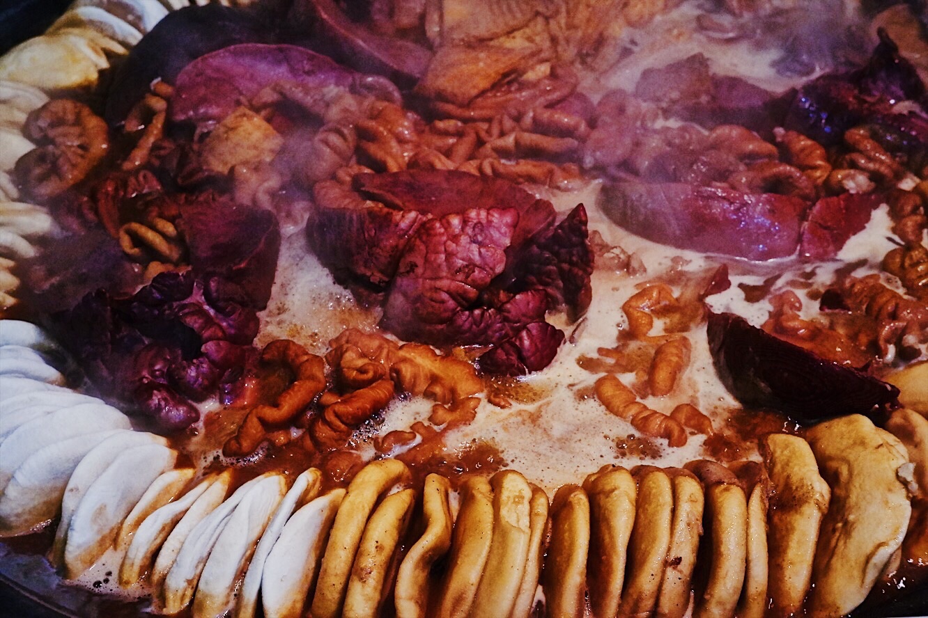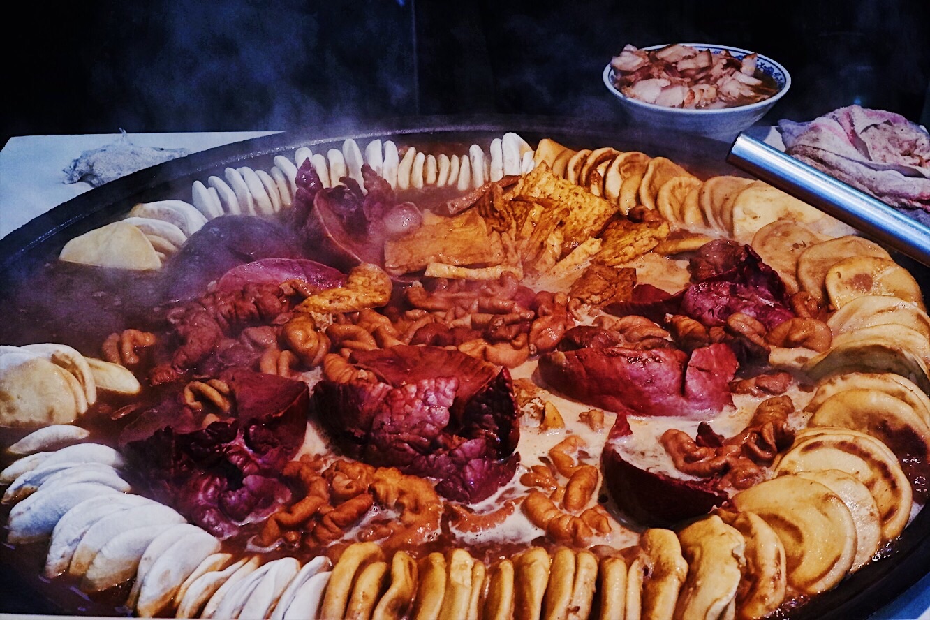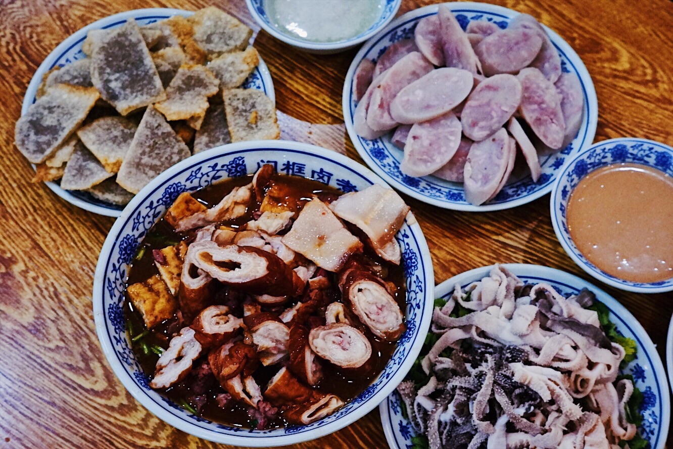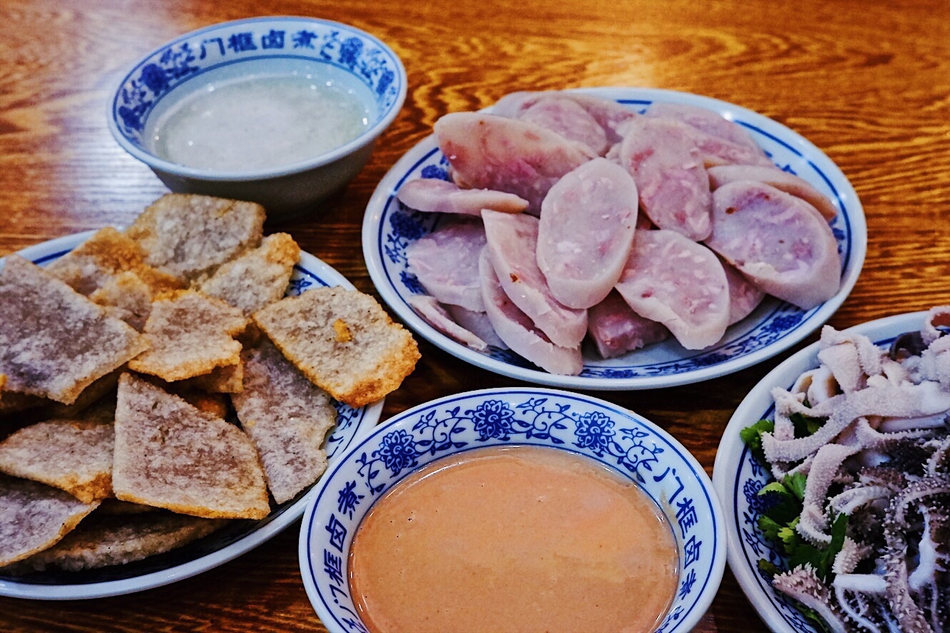 声名鹊起的北京传统特色小吃连锁品牌门框胡同,接地气的京味大乱炖荣登2018必吃榜,就好比西安闻名遐迩的子午路张记肉夹馍和魏家凉皮。 明厨亮灶充满了人间烟火气息,亲眼目睹一大锅卤煮火烧热气蒸腾咕嘟咕嘟,肠肺豆干火烧分门别类堆放文火慢炖,小哥顺手从锅里即取即用切分装盘驾轻就熟。 店里常客熟门熟路点上一份精品卤煮便可裹腹,菜底可加肠加肺加豆腐加火烧,吃着舒坦闻着销魂浓郁酱汁充分入味,卤汁、蒜汁、酱豆腐汁、香菜等辅料,使得火烧透而不黏肉烂而不糟,厚重回味就如同这座城市的记忆般余韵悠长。 ✨老北京粉肠✨原汁原味实在有点接受无能,还是✨老北京炸灌肠✨酥脆适口老少咸宜,✨老北京麻豆腐✨绿油油烂糊糊,透着椒香麻辣后劲十足,✨老北京爆肚✨吃完以后肚子有点不太舒服。