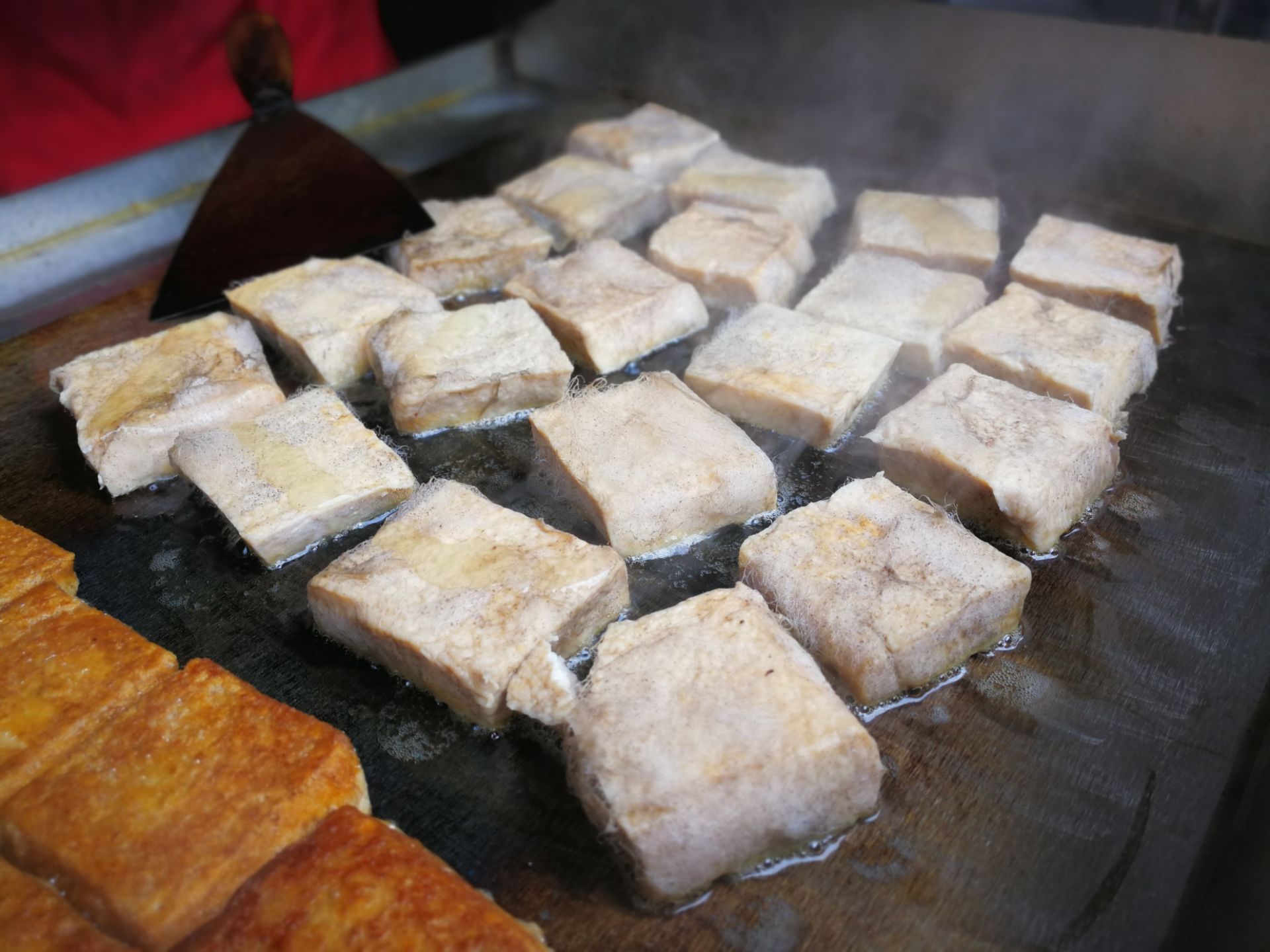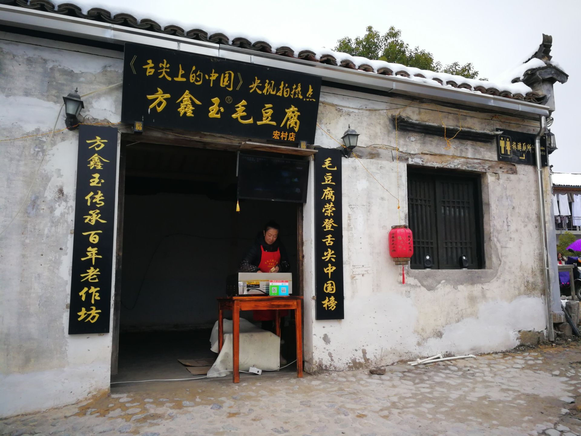 舌尖上的中国第一期把方鑫玉制作的毛豆腐拍火了,随后便有了方鑫玉毛豆腐这个品牌。从休宁县蓝田镇走出来,黄山市各景区几乎都有方鑫玉毛豆腐的专卖店。 宏村这一家也不知道是真是假,后来到西递,那边说这家是假的。不过真假不重要,好吃就行。发酵后的毛豆腐,经过油煎,再配点葱姜和酱料,风味十足。