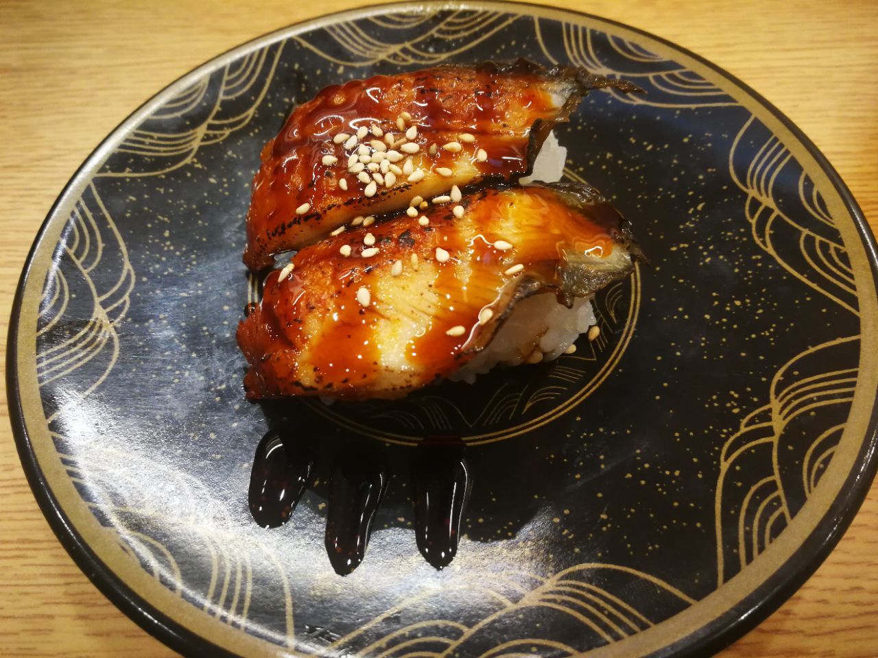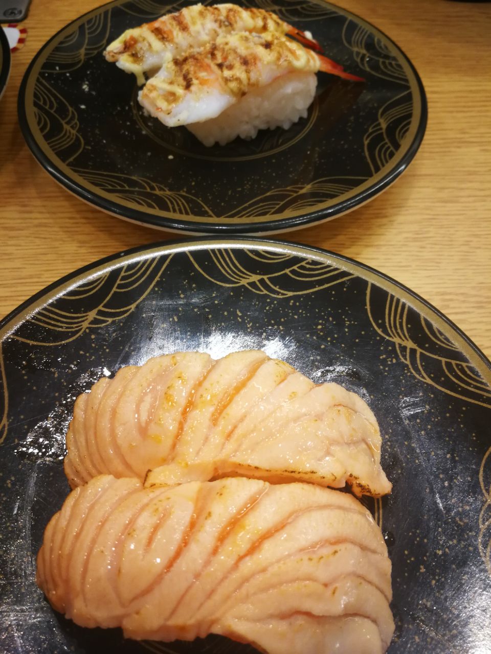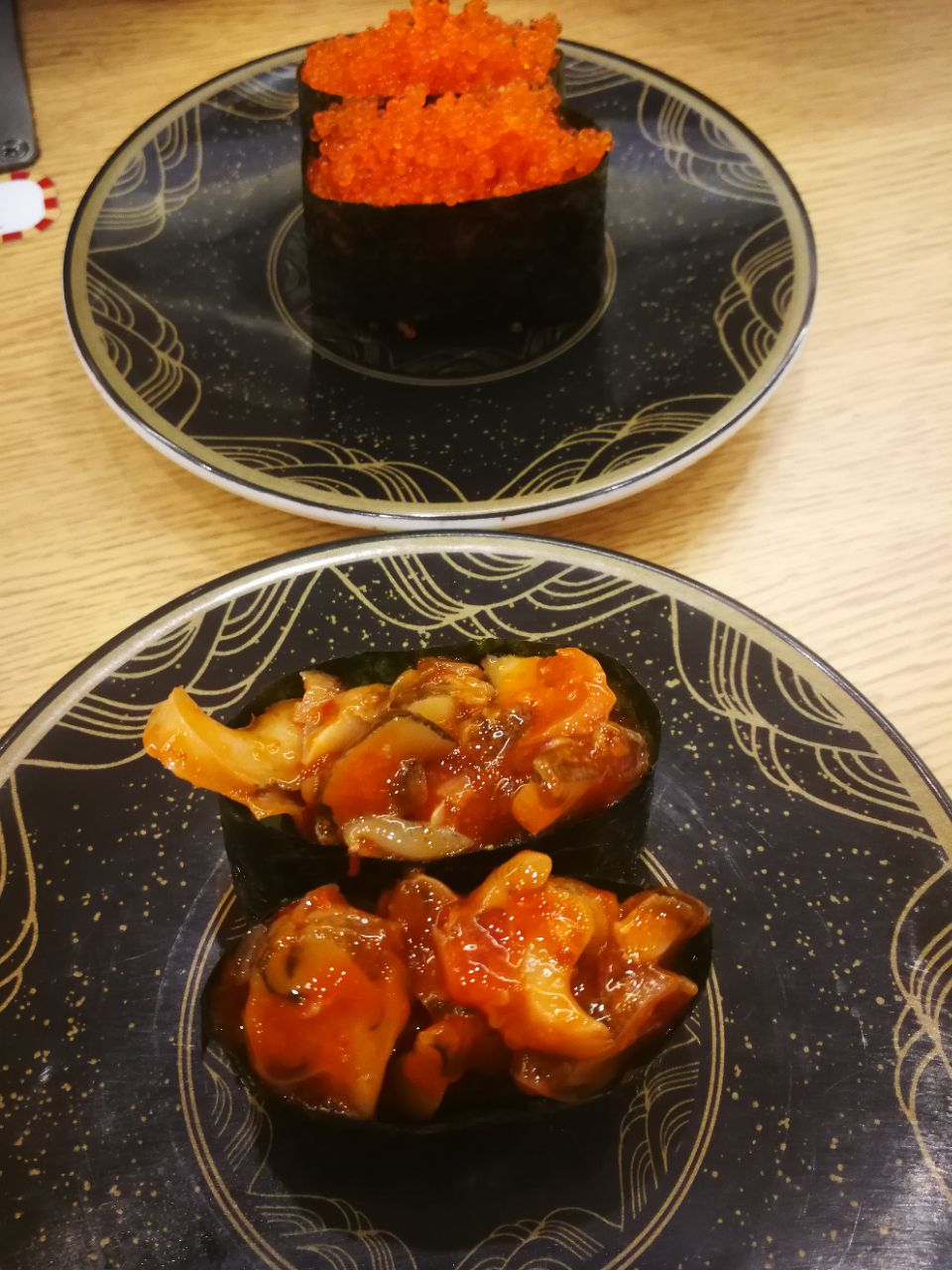 之前在漫游城逛了一逛,今天过来米西。这家日料更偏向于回转寿司,通透的玻璃墙,让里面的食物一览无余,不由自主就进来了。 店里有多人座,也有围着转台的一人座,在转台边坐着更有感觉,可以直接从转台上取物,也可以在上方的小屏幕上点单。点完单不久,会有一艘木船载着食物停留在面前,挺酷的。寿司大都10元一份,品种丰富,味道也不错,鹅肝寿司肥嘟嘟,螺片卷美味美味。吃完一客就将盆子扔到专用槽里,以计算价钱。现在每扔次盆子还有抽奖,可惜没有中,但动画效果蛮好玩的。
