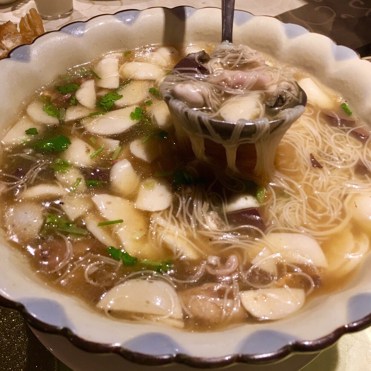 店面大招牌上写着始创于1993,掐指一算都26年老店了,老厦门人也是强烈安利这一家店。能在餐饮业竞争这么激烈的厦门立足这么久,自然有它独到之处。 面线糊:是我到了厦门以后才见过的,很喜欢吃,自己也会在家里煮,可这家真是我吃过最好吃的一家,口感,汤汁,配料都喜欢,加上淡淡白胡椒味,锦上添花。 小菜:虽然只是配角,可是让我惊艳,十分爽口入味,好吃停不下来。 咖喱三鲜:其实不止三鲜,里面有虾菇,青口,虾,鱿鱼,油蛤,老蛏,真是群英荟萃。 泡菜丝丁鱼:第一次见到用丝丁鱼的,个人很喜欢,因为既喜欢吃里面酸爽下饭的泡菜,又喜欢丝丁鱼软嫩丝滑的口感。 锅仔羊肉:带皮羊肉和白萝卜加各种香料长时间煮顿,香味扑鼻,热气腾腾。汤汁还可以烫青菜和金针菇,连素菜都变得美味。 韭菜盒:不同于北方的韭菜盒,北方的是大的扁的饺子形状,用油煎。而这个是球状,放油里炸,馅饱满,皮酥脆,另有一番风味。 大伍鱼:鲜嫩可口,里面的配菜也很有特色。 闽南特色拼盘:里面是几种厦门特色小吃,可以尝试一下。 此外还点了紫菜海蛎煲,猪肚炖血蛤,麻油爆腰肝。闽南特色菜可谓应有尽有。