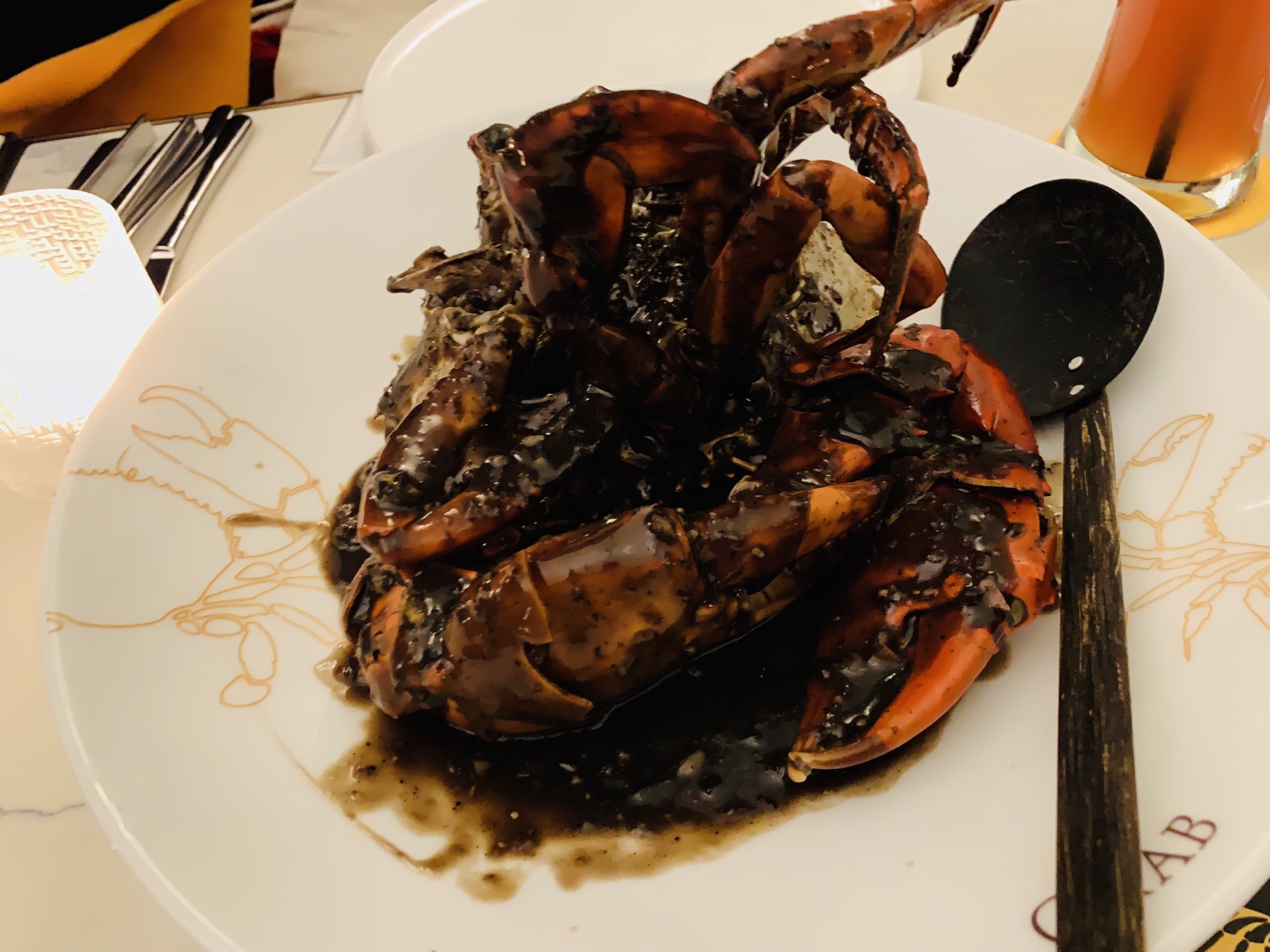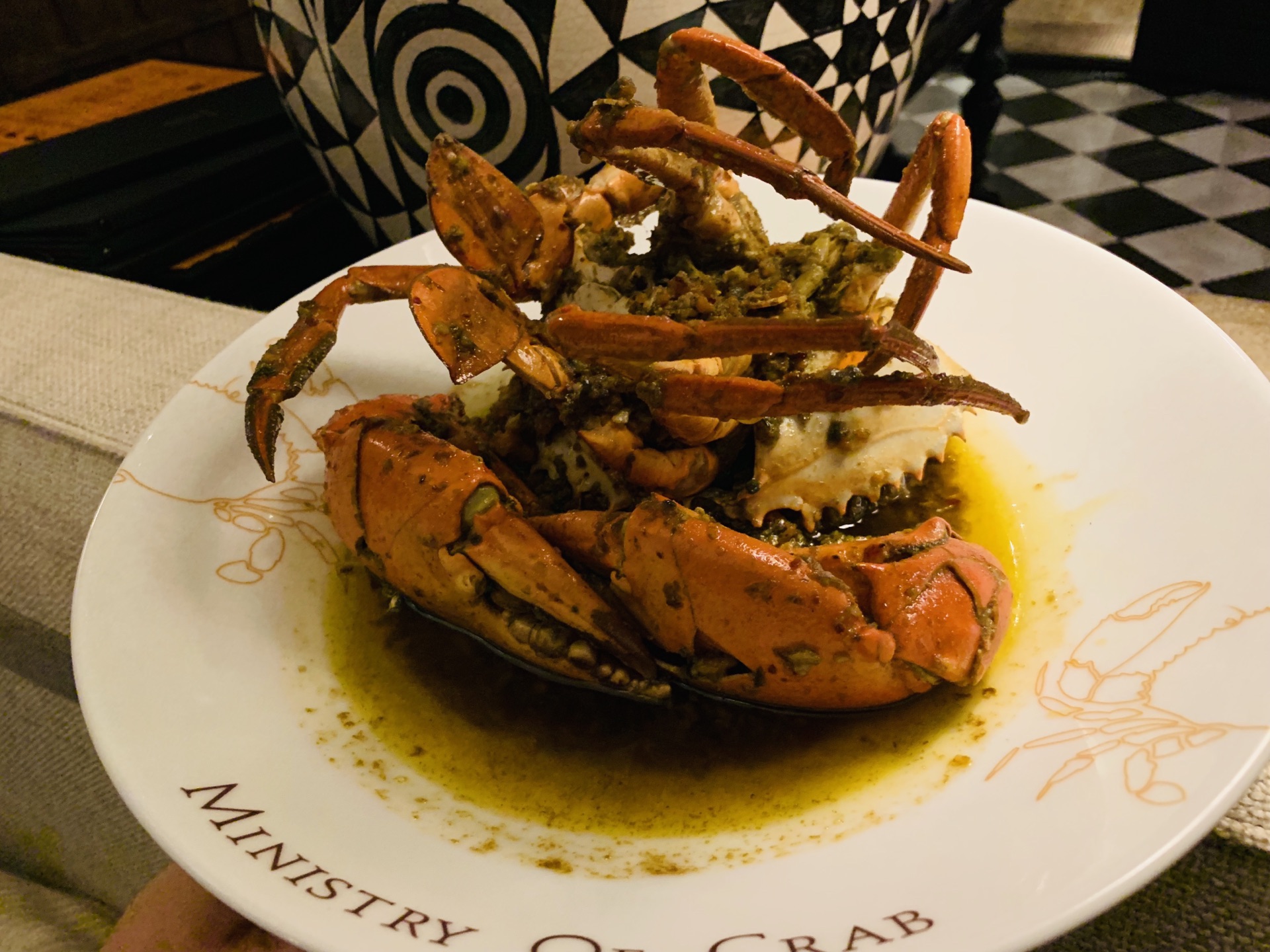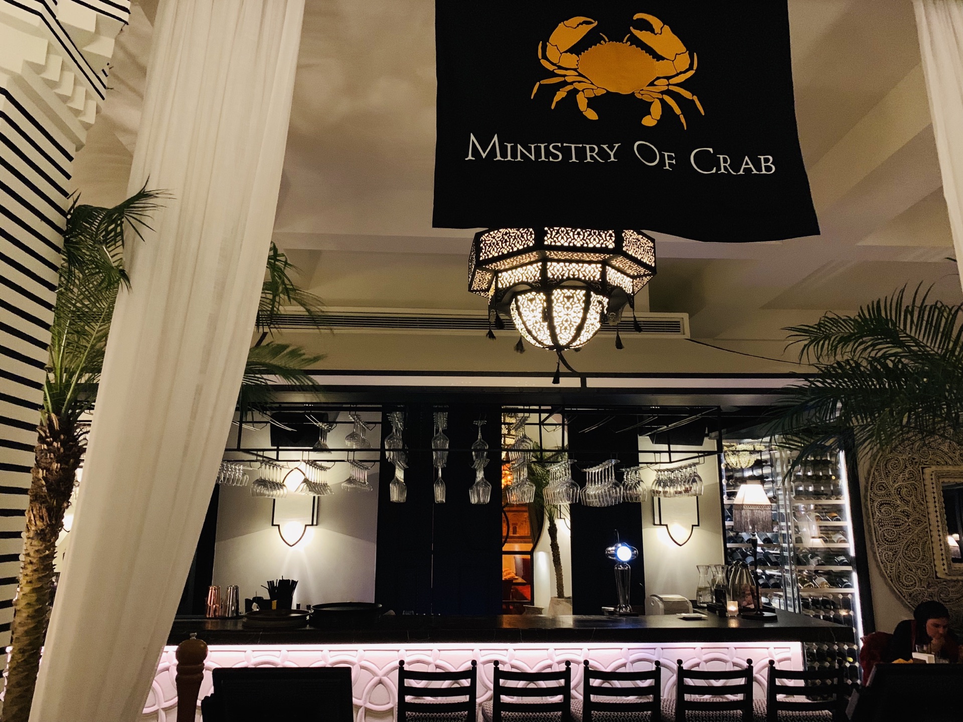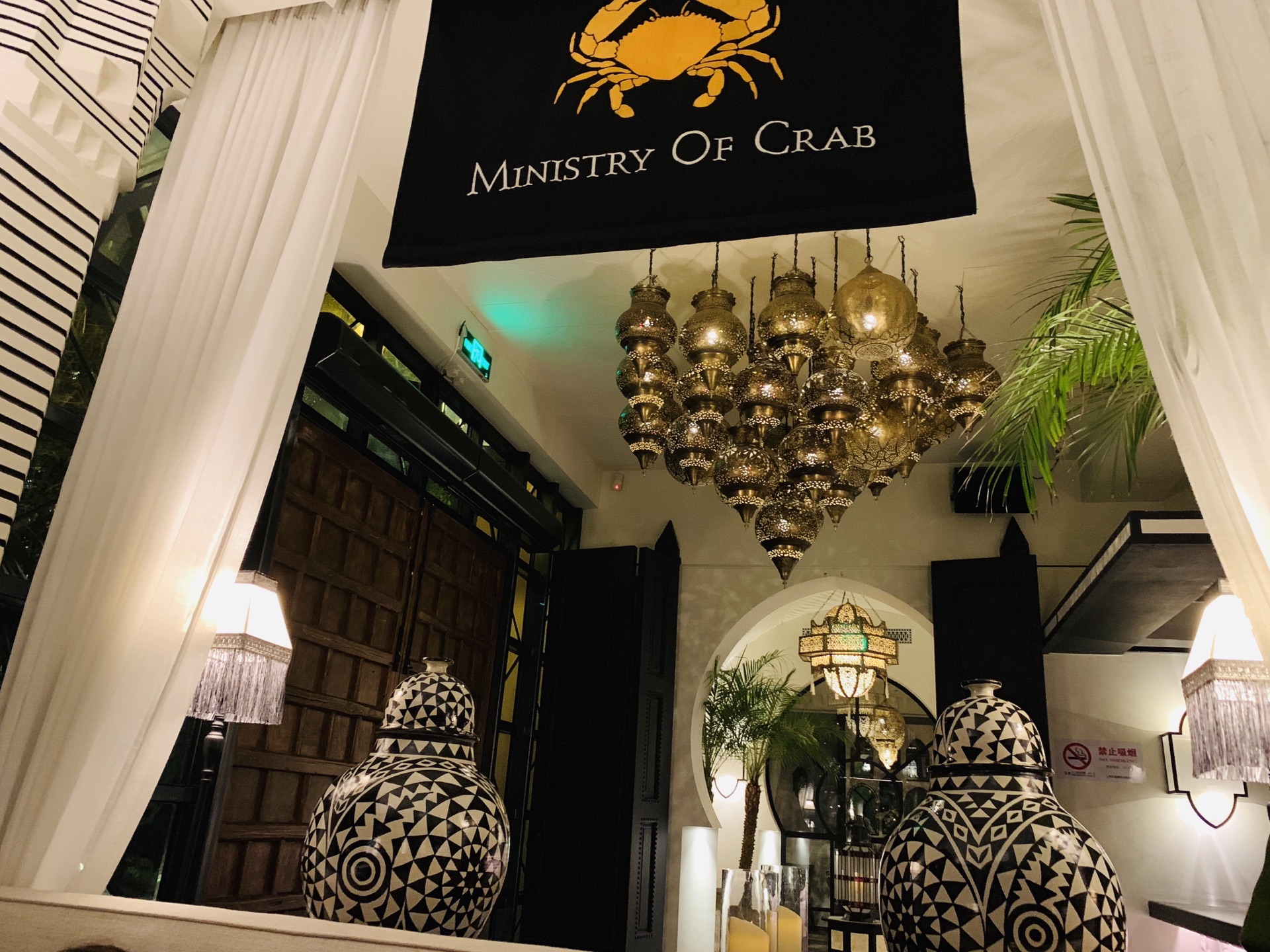 掩映在绿树林人民公园中的Ministry Of Crab,深夜探访~ 异域风情的设计风格,黑白格地砖,圆拱形透明玻璃房,环境是悠扬婉转的美~ 蛤蜊,有浓浓奶油香~ 香蒜辣椒大虾,超大一只,138元,虾肉紧实~ 手磨黑胡椒蟹,黑乎乎一大坨,配上餐厅内的黑暗环境,还真没有第一眼认出这是一只肥美的蟹,不做优雅的女士,直接动手掰起蟹腿,入口,黑胡椒的辣味还是很明显的~ 地中海烩日本香蒜辣椒蟹,这款要比黑胡椒蟹更温柔一点,蟹下的饭浸泡在厚重的油里,挖上一勺,真的好香啊~(虽然有点油) 面包块,哈哈哈哈哈,面包控的我看到一大盘的面包块,开心坏啦!特别是那憨态可掬的印有螃蟹️图案的黄油,涂满面包块,入口,要的就是这个味~ 日式蟹肉炒饭,圆形⭕️一坨饭上顶着个蟹壳,炒饭味道适中~ 炒空心菜,也有香辣味~ 烤芦笋,还算小清新~ 以上~