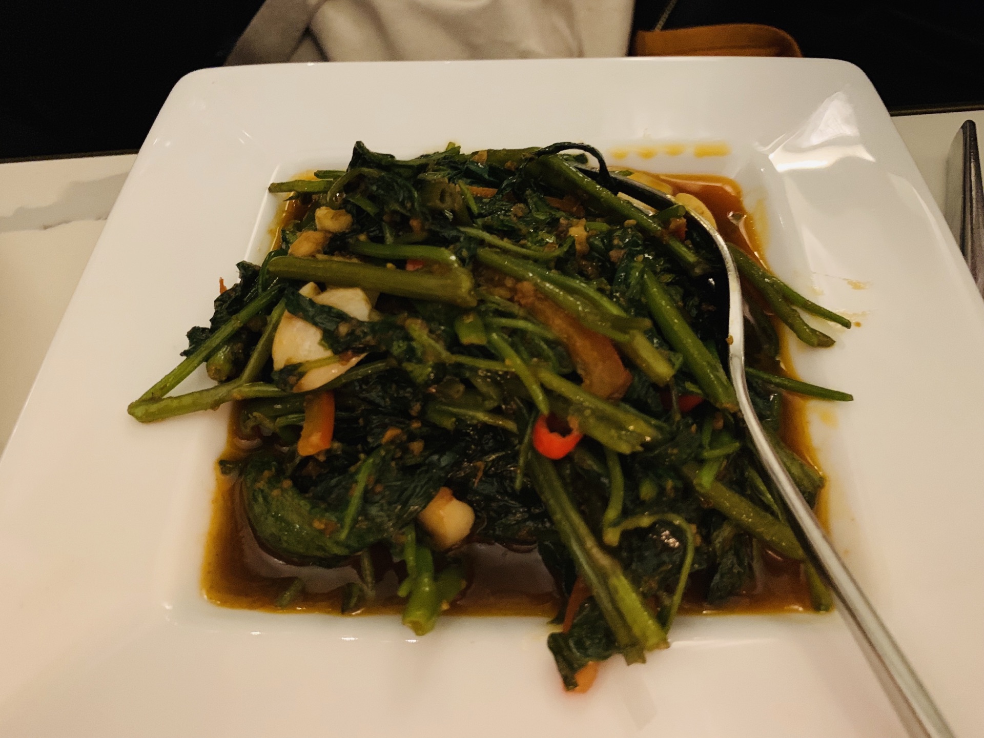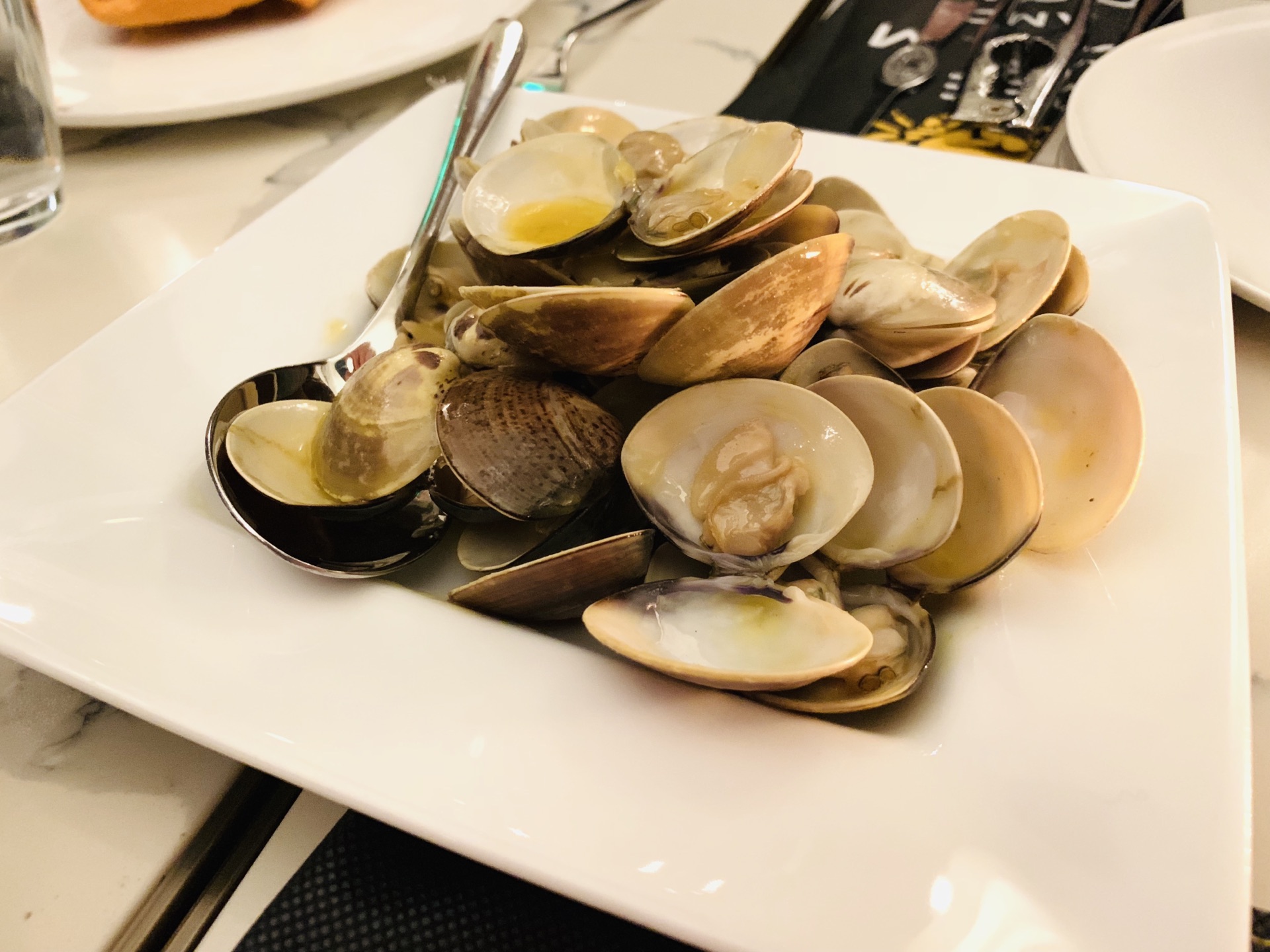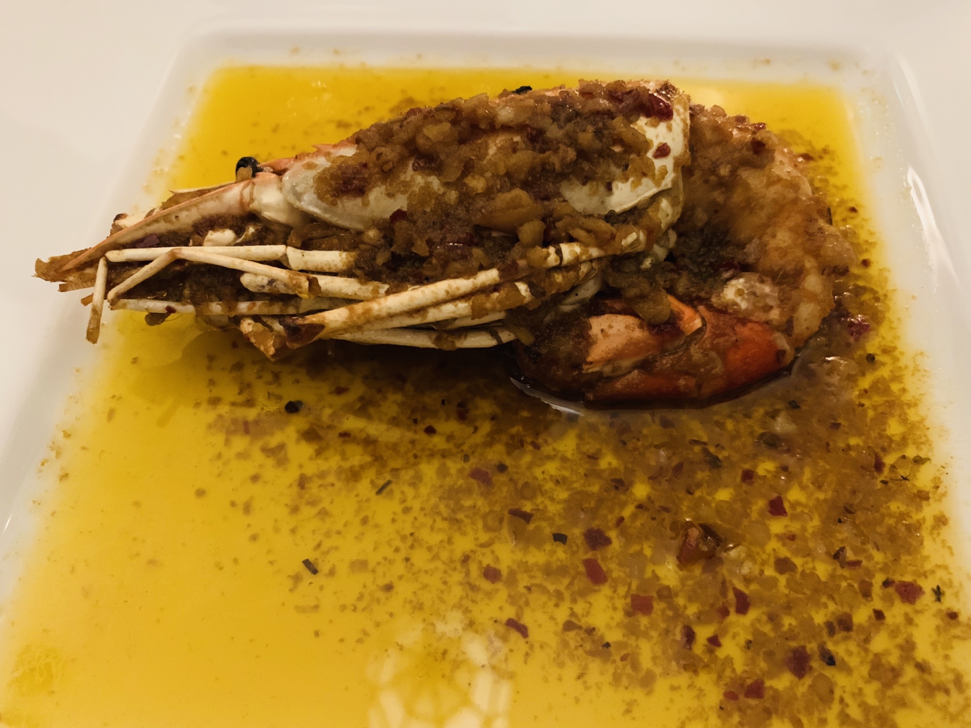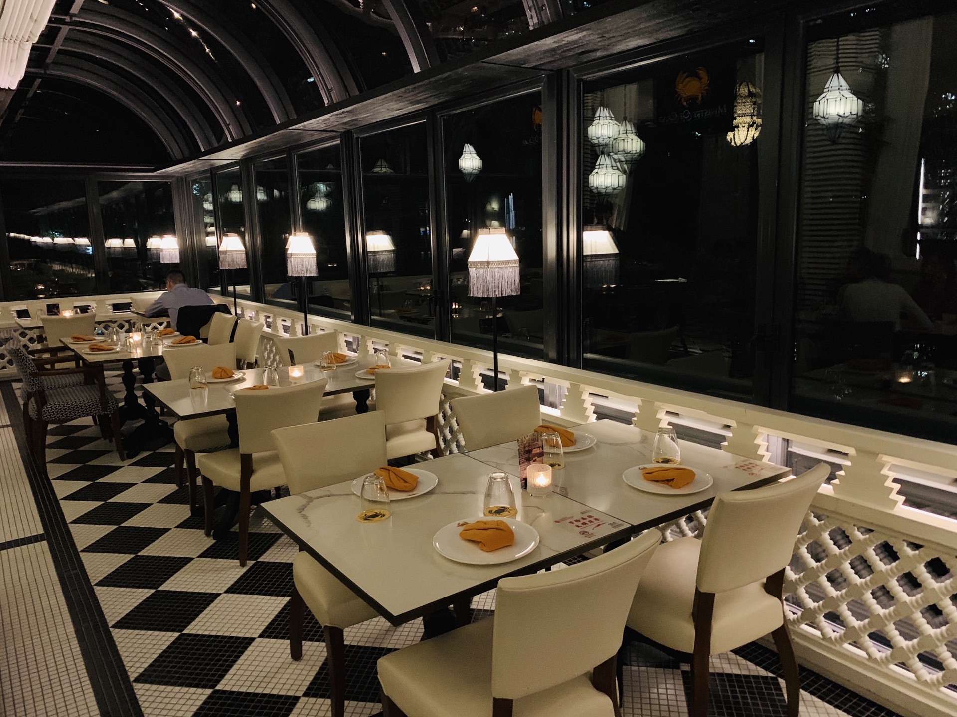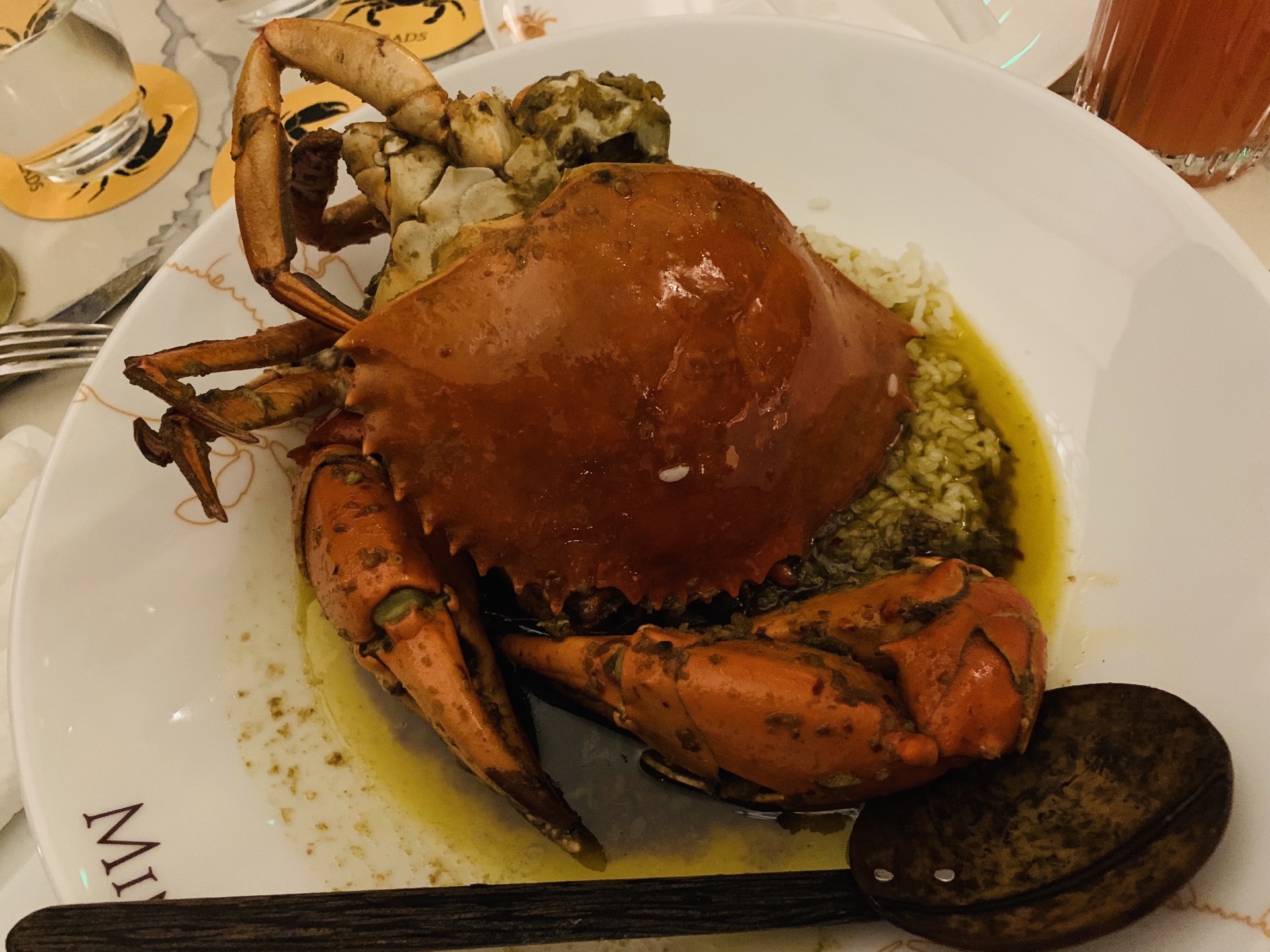 掩映在绿树林人民公园中的Ministry Of Crab,深夜探访~ 异域风情的设计风格,黑白格地砖,圆拱形透明玻璃房,环境是悠扬婉转的美~ 蛤蜊,有浓浓奶油香~ 香蒜辣椒大虾,超大一只,138元,虾肉紧实~ 手磨黑胡椒蟹,黑乎乎一大坨,配上餐厅内的黑暗环境,还真没有第一眼认出这是一只肥美的蟹,不做优雅的女士,直接动手掰起蟹腿,入口,黑胡椒的辣味还是很明显的~ 地中海烩日本香蒜辣椒蟹,这款要比黑胡椒蟹更温柔一点,蟹下的饭浸泡在厚重的油里,挖上一勺,真的好香啊~(虽然有点油) 面包块,哈哈哈哈哈,面包控的我看到一大盘的面包块,开心坏啦!特别是那憨态可掬的印有螃蟹️图案的黄油,涂满面包块,入口,要的就是这个味~ 日式蟹肉炒饭,圆形⭕️一坨饭上顶着个蟹壳,炒饭味道适中~ 炒空心菜,也有香辣味~ 烤芦笋,还算小清新~ 以上~