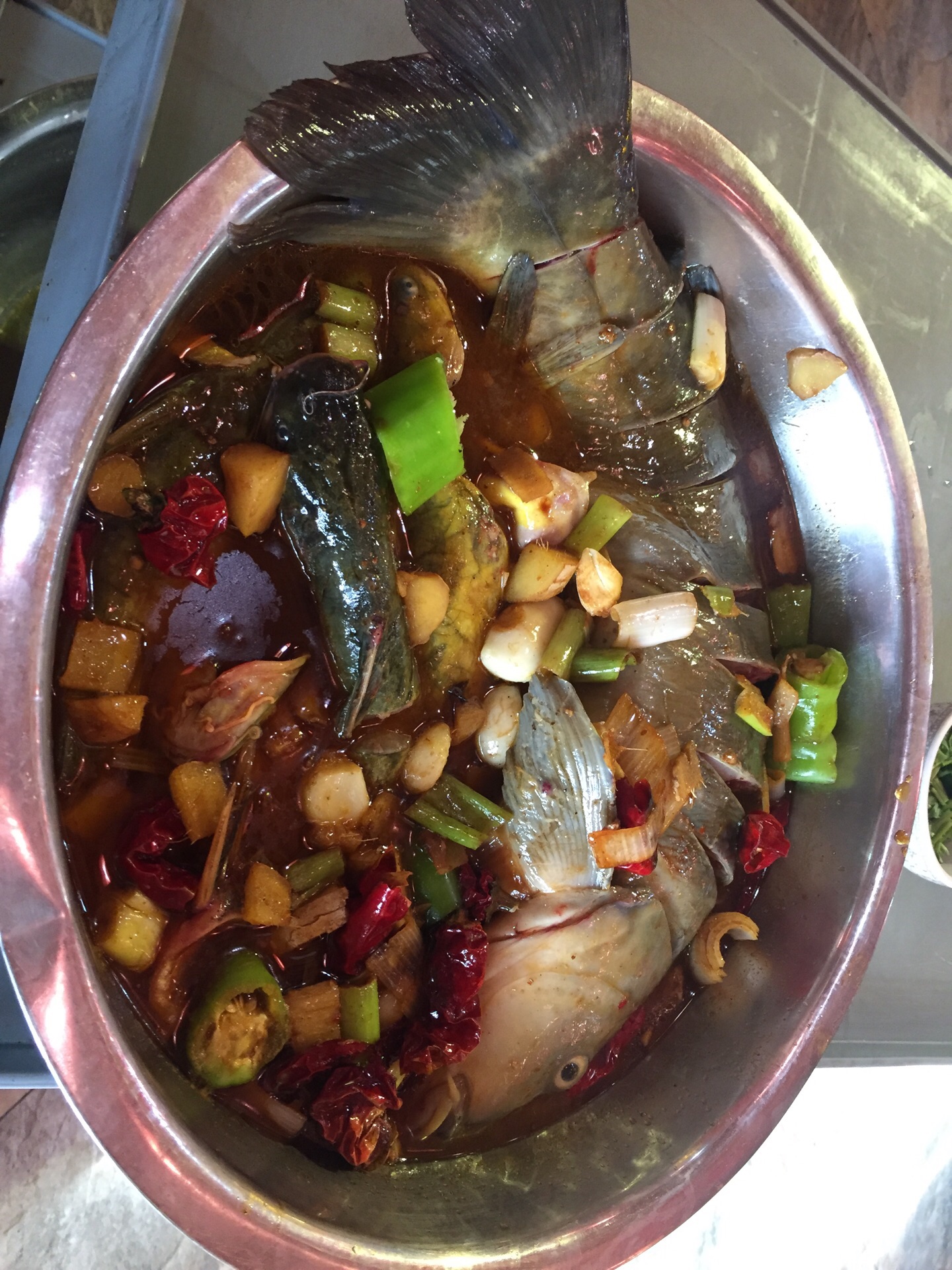 好鲜的鱼呀!下锅时,它还在“喘气”呢!鱼身上这么多刀,肚子也被掏空了,它还在“喘气”呢!鱼是真鲜,柴锅一炖,加上豆腐、茄子、粉条,锅边再贴上玉米饼或花卷,盖好锅盖,炖上二十多分钟,时间一到一揭盖,真是香呀,汤咸鲜,鱼有味,美赞!