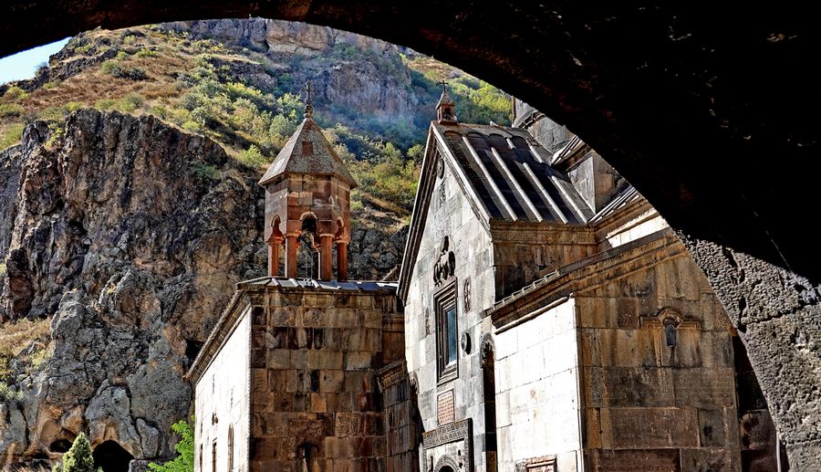 格加尔德修道院,位于亚美尼亚首都埃里温郊区的山谷中,倚山林和,气势宏伟,山谷与教堂浑然天成,合二为一,令人赞叹。郁郁葱葱的森林,清新的幽谷深壑,春天降临,百花齐放时,峡谷一番绝美景象。修道院建着在自然风光旖旎的山谷中,周围环绕着高耸的悬崖。进入峡谷只有唯一的公路,千年古迹随处可见。格尔加德修道院是亚美尼亚最精华的所在,也被称为岩洞教堂,因为其大部分建筑在岩石中直接琢刻而成,是亚美尼亚中世纪修道院建筑的极致表现。