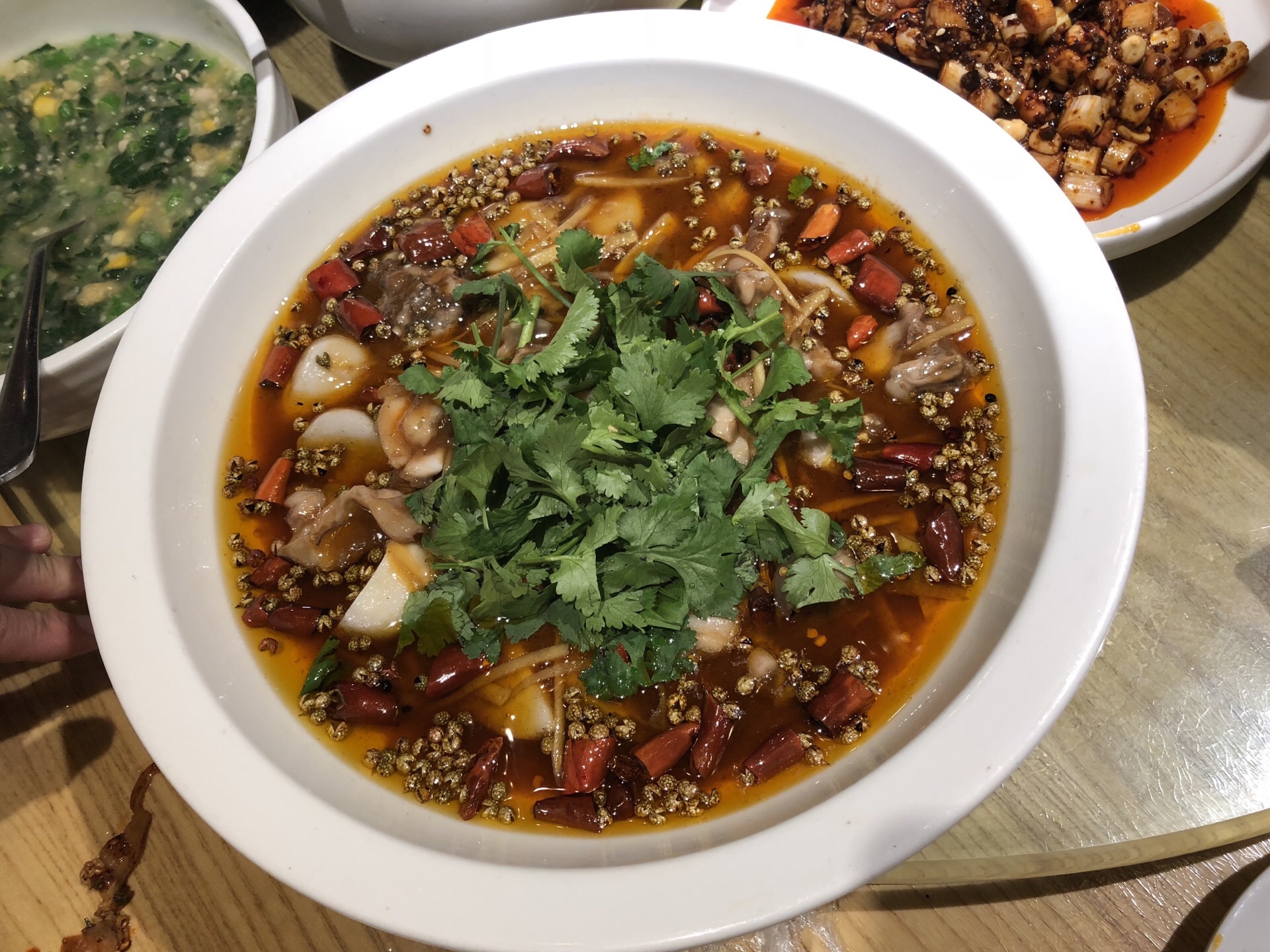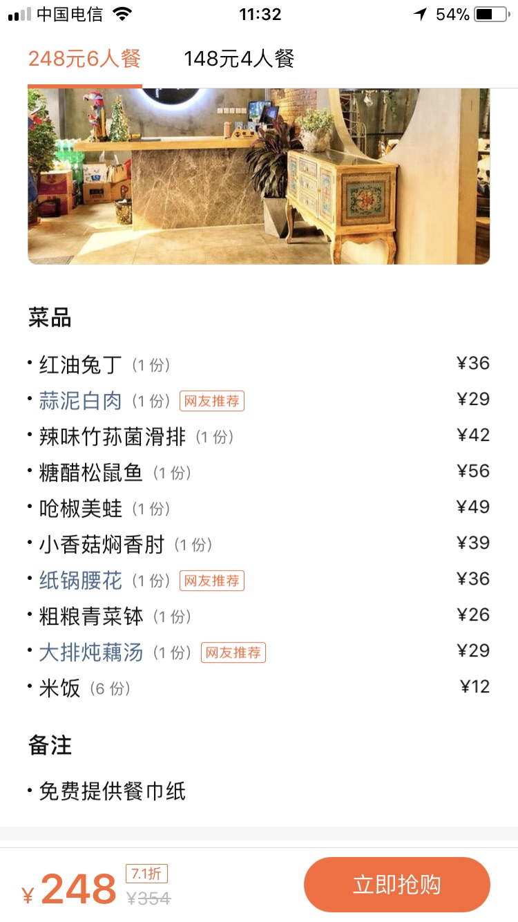 虽是家附近的店,却是请亲友吃饭搜到的。特意提前去看了一下环境,满意;菜品也以家常菜为主。我们6个人,看到刚好有6人餐,就懒得点菜了,选了6人餐。菜品不少,分量也不小,喜欢蒜泥白肉、纸锅腰花、糖醋松鼠鱼、大排炖藕汤。这家店环境味道服务都不错,菜品不贵,适合家人、朋友聚会。