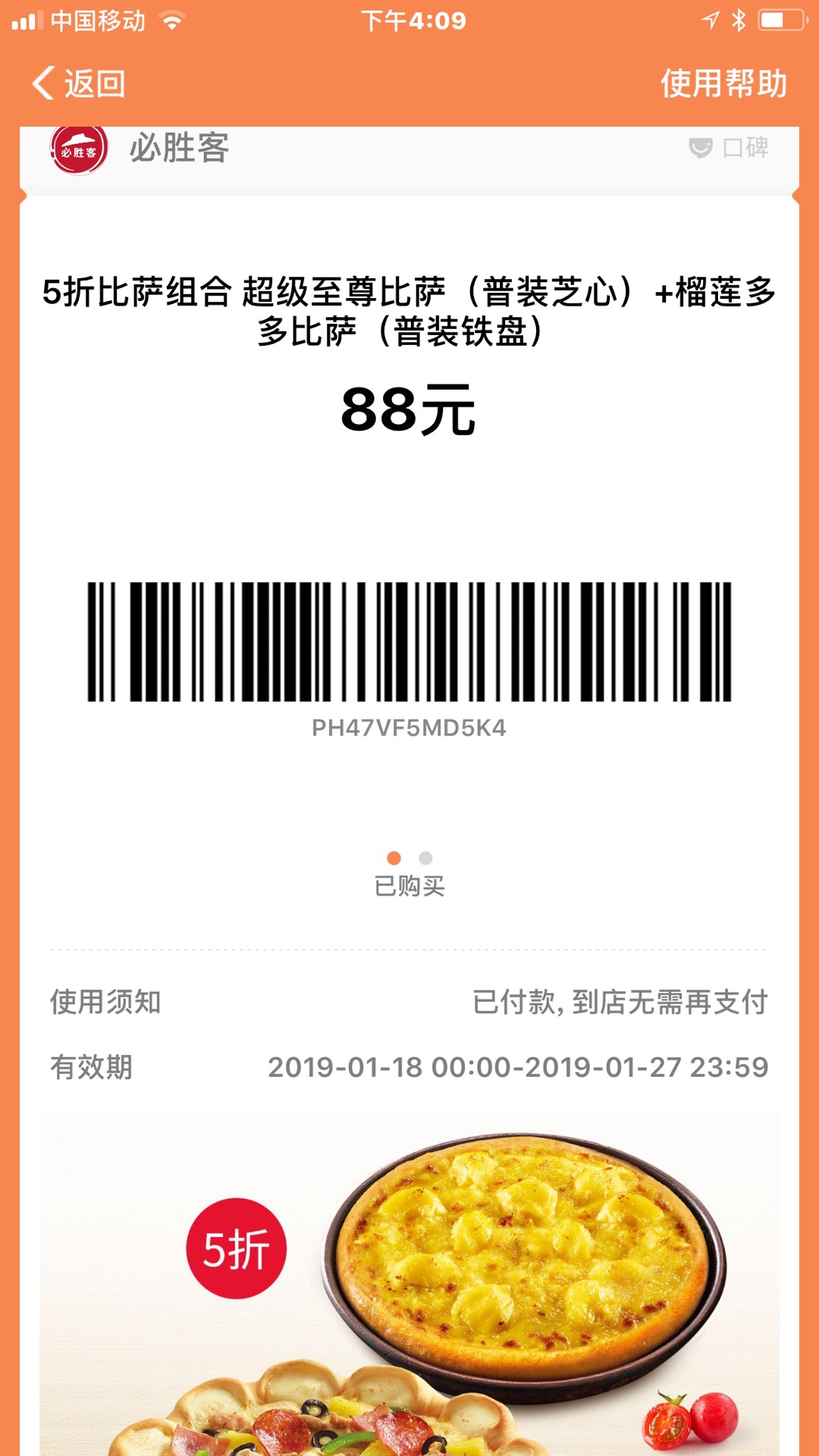 支付宝内必胜客优惠活动,两客披萨5折购,正是喜欢的口味,网上下单,有效期10天,一直没有时间过来,眼看就要到期限了,今天终于抽空到店里来。店在惠济万达一层东端,进东门即可看到鲜明的必胜客logo,非常好找。店堂明亮温暖,服务员小妹很热情,业务熟练,由于是现点现烤,等了10多分钟。也算挺快的。